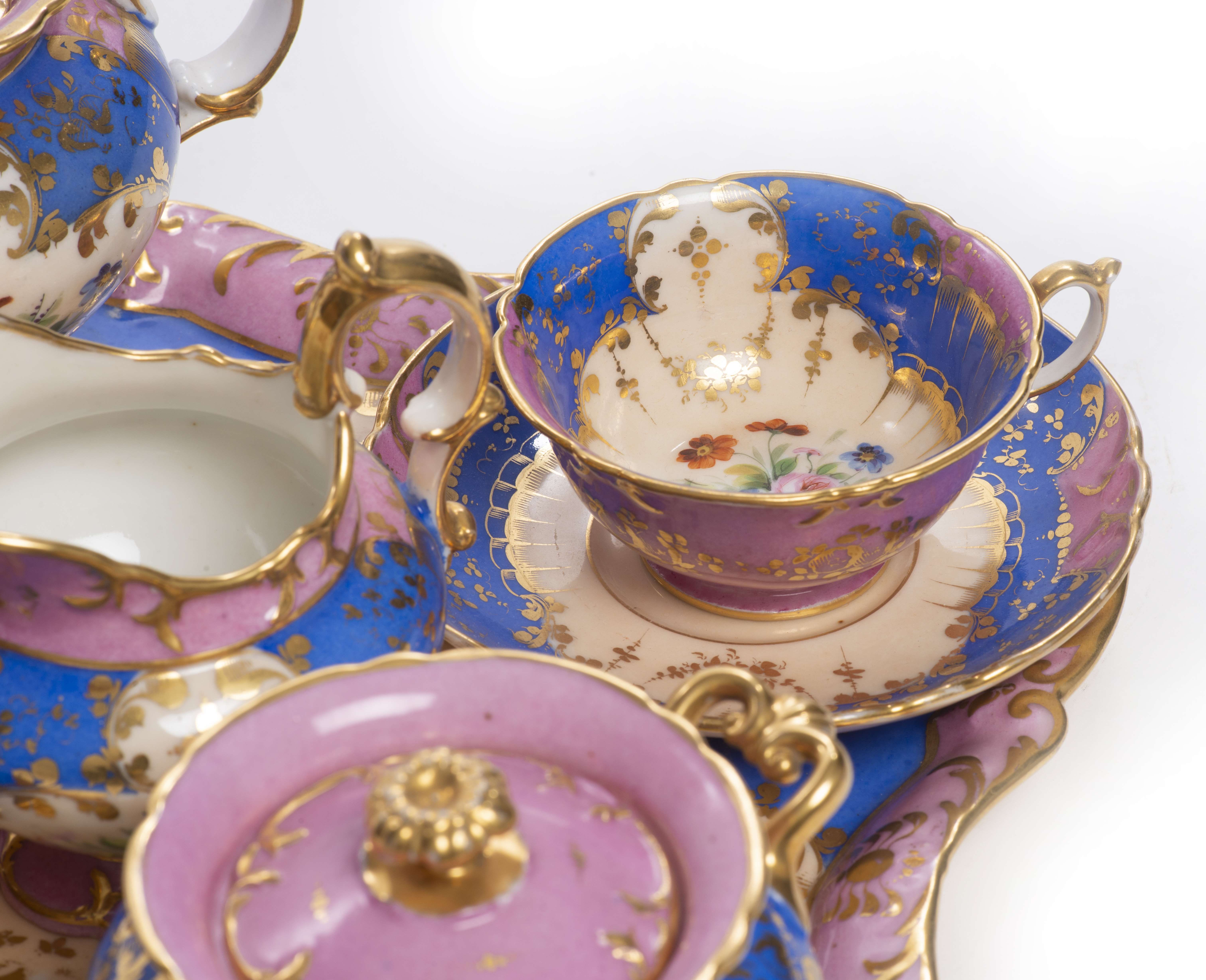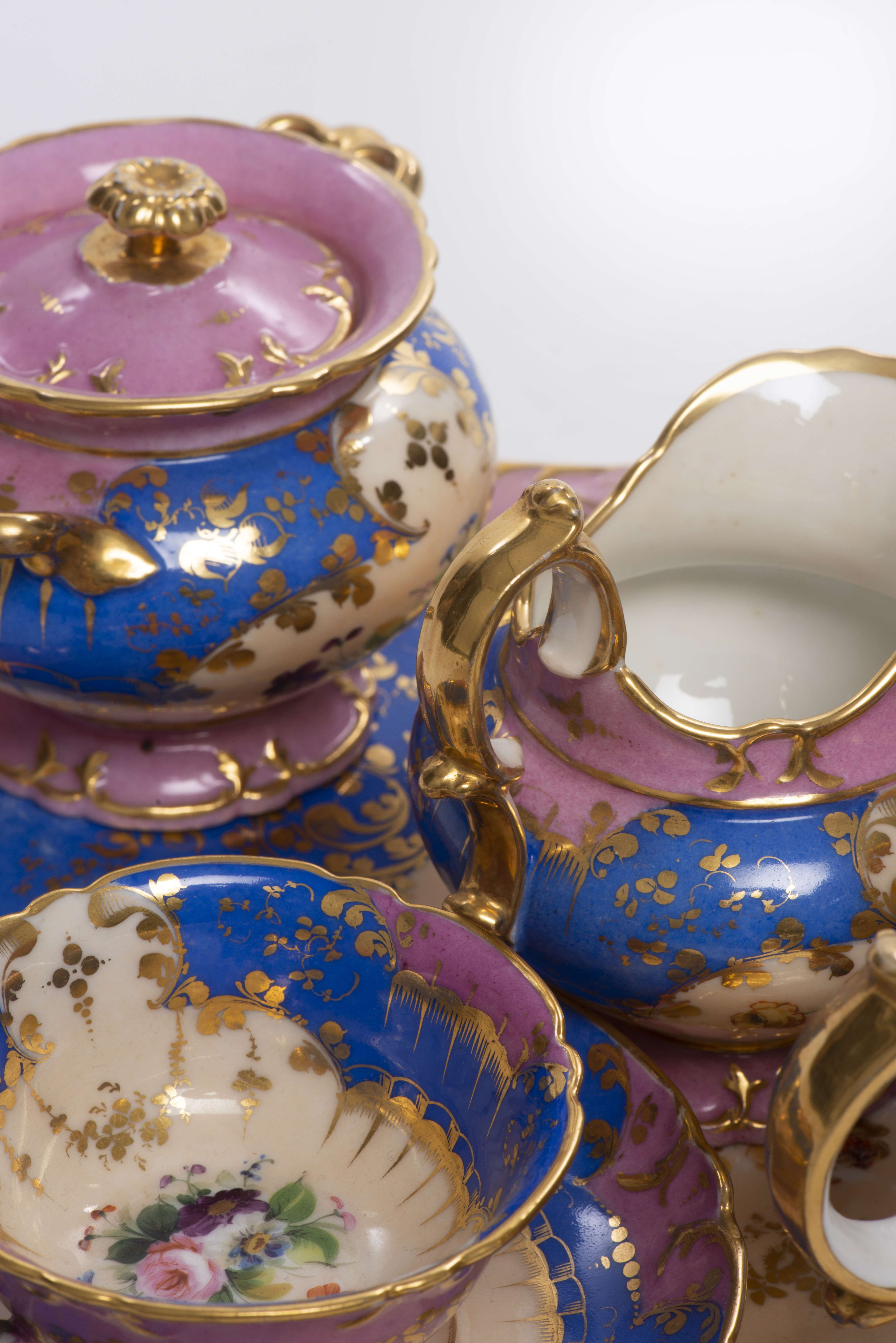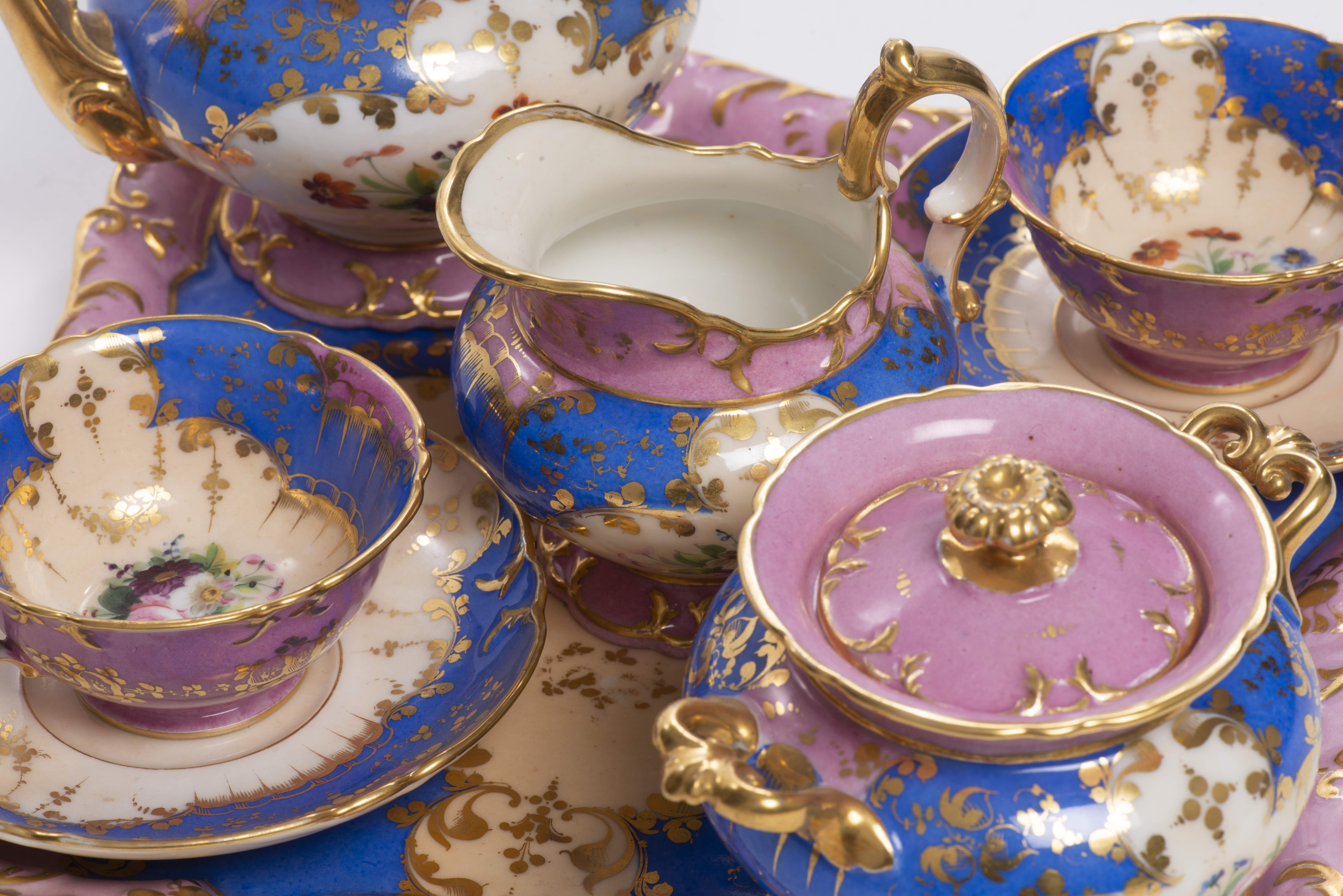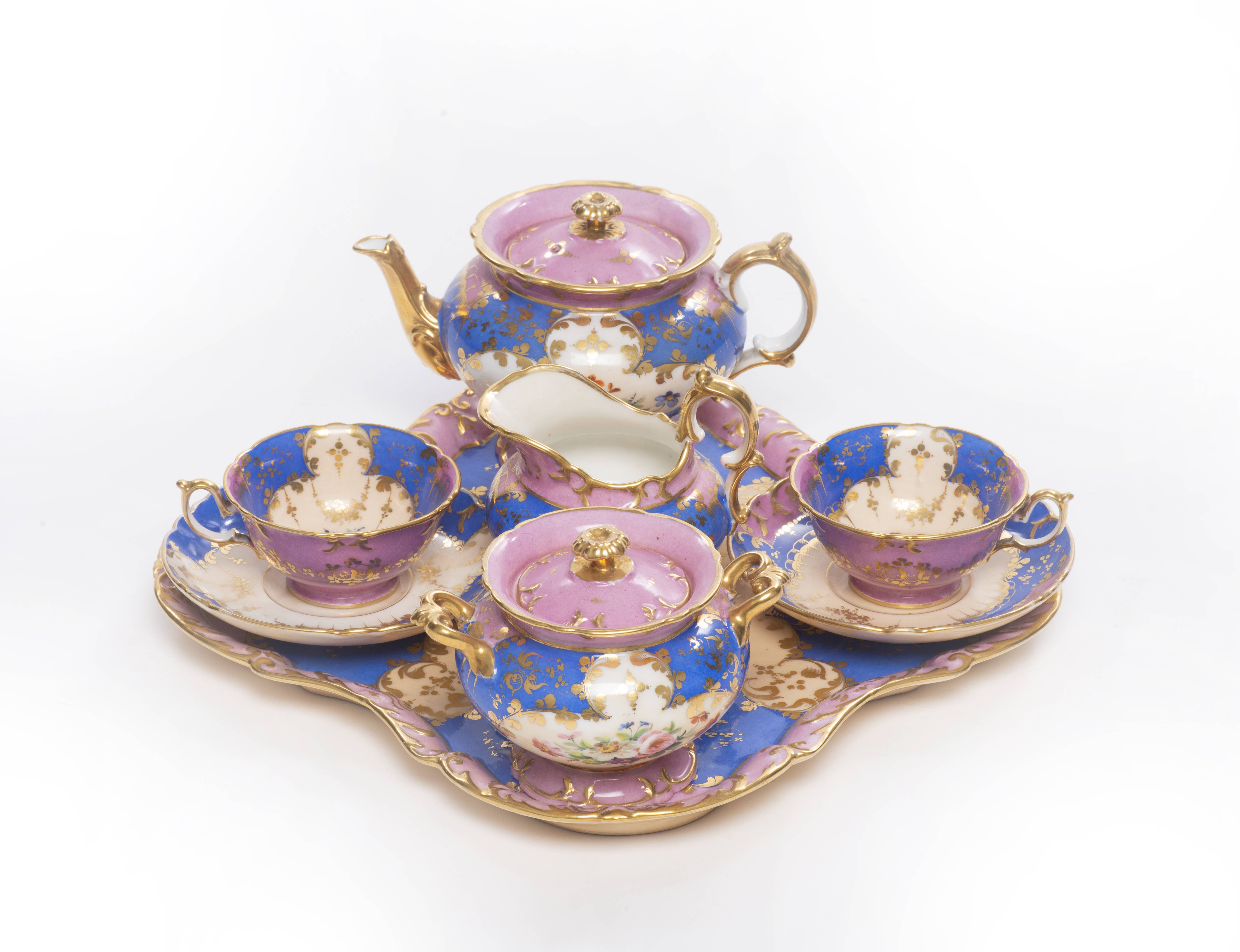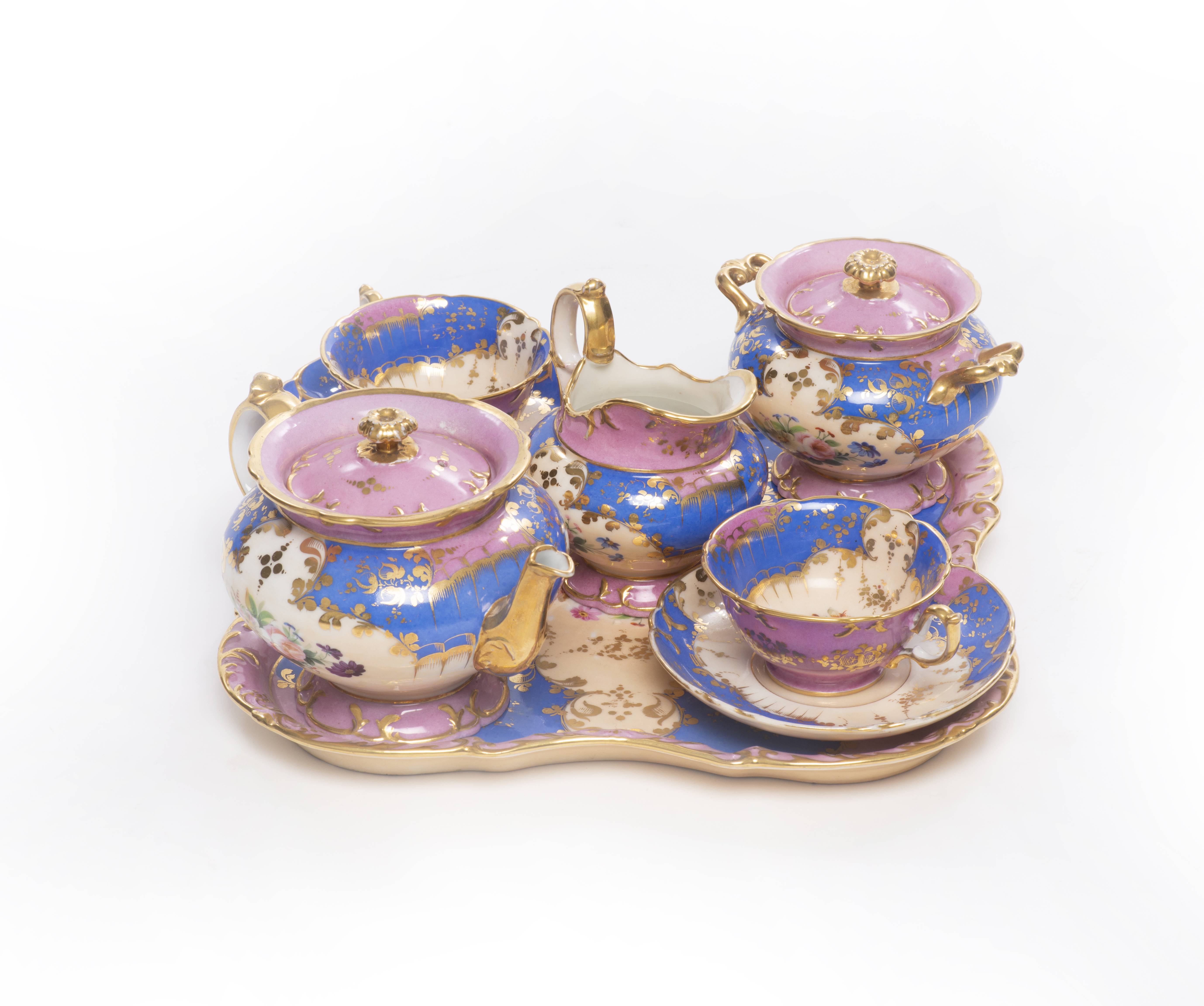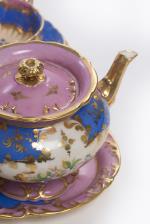 Service à thé tête-à-tête d'époque Nap. III en porcelaine de Paris à décor rose bleu et blanc, comprenant :