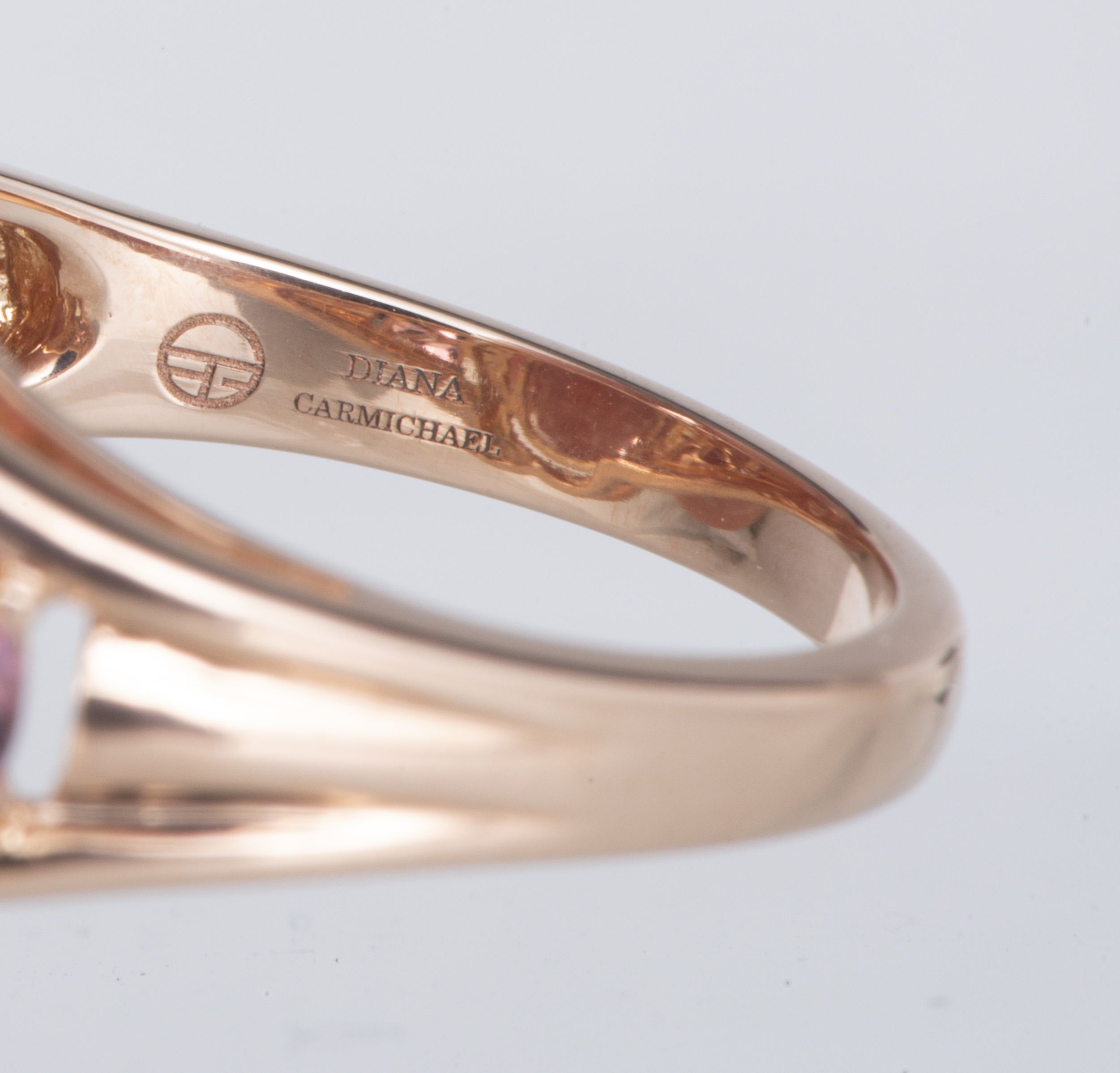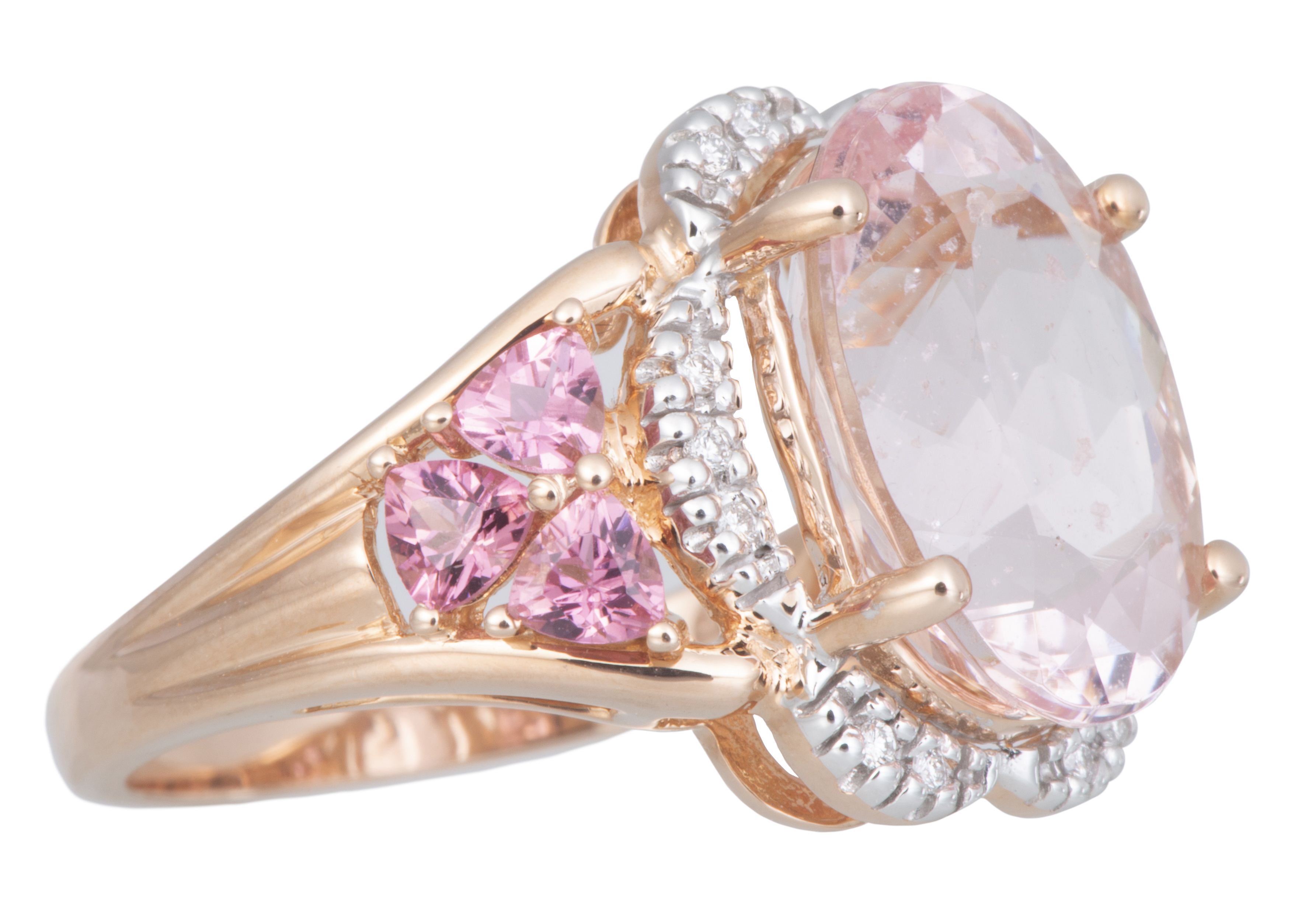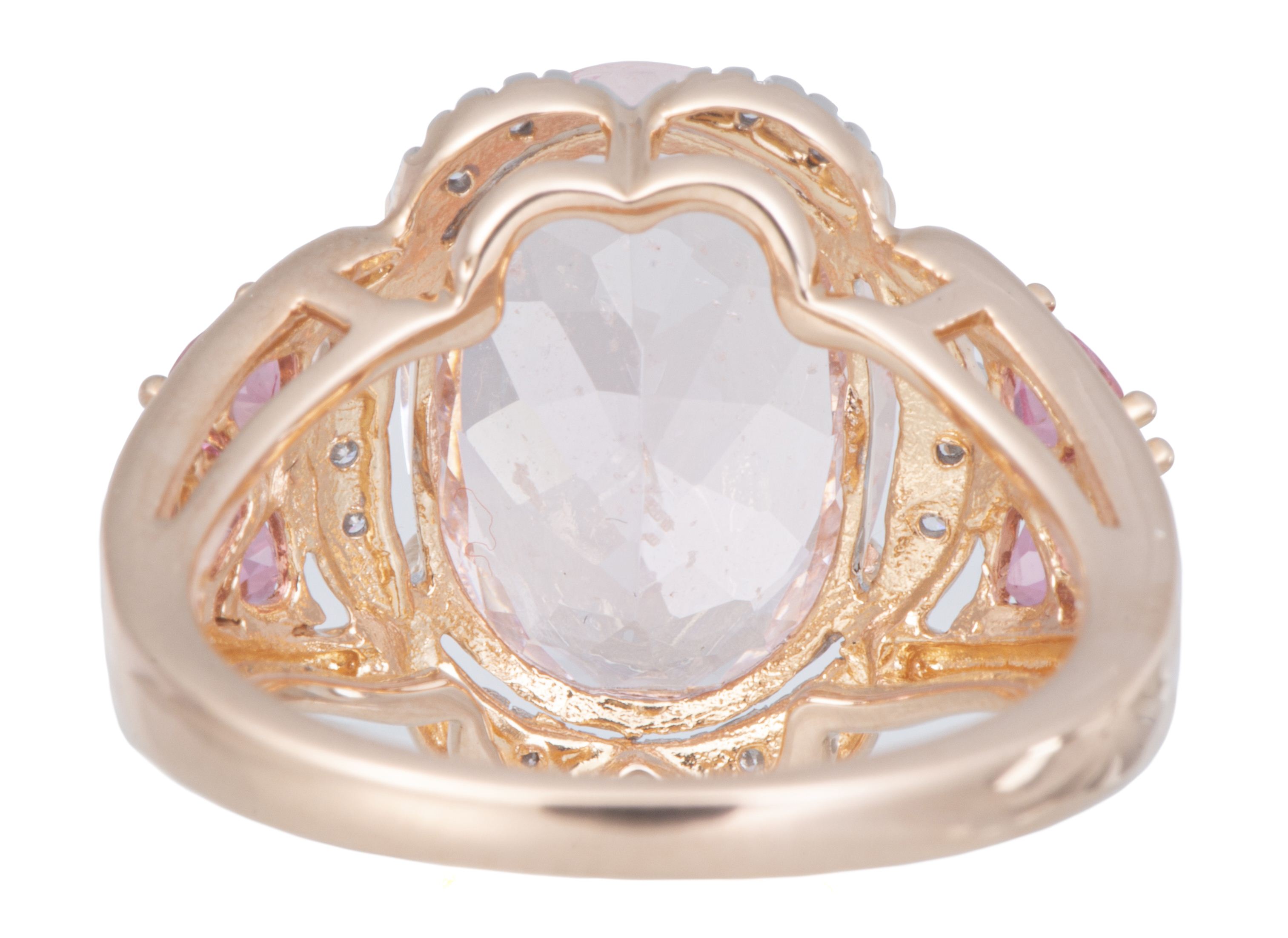 Bague en or rose .750 avec en son centre une kunzite rose de taille ovale de 7.95~8 cts, des diamants pour 0.10 ct et 6 saphirs roses triangulaires pour un total de 0.40 ct.