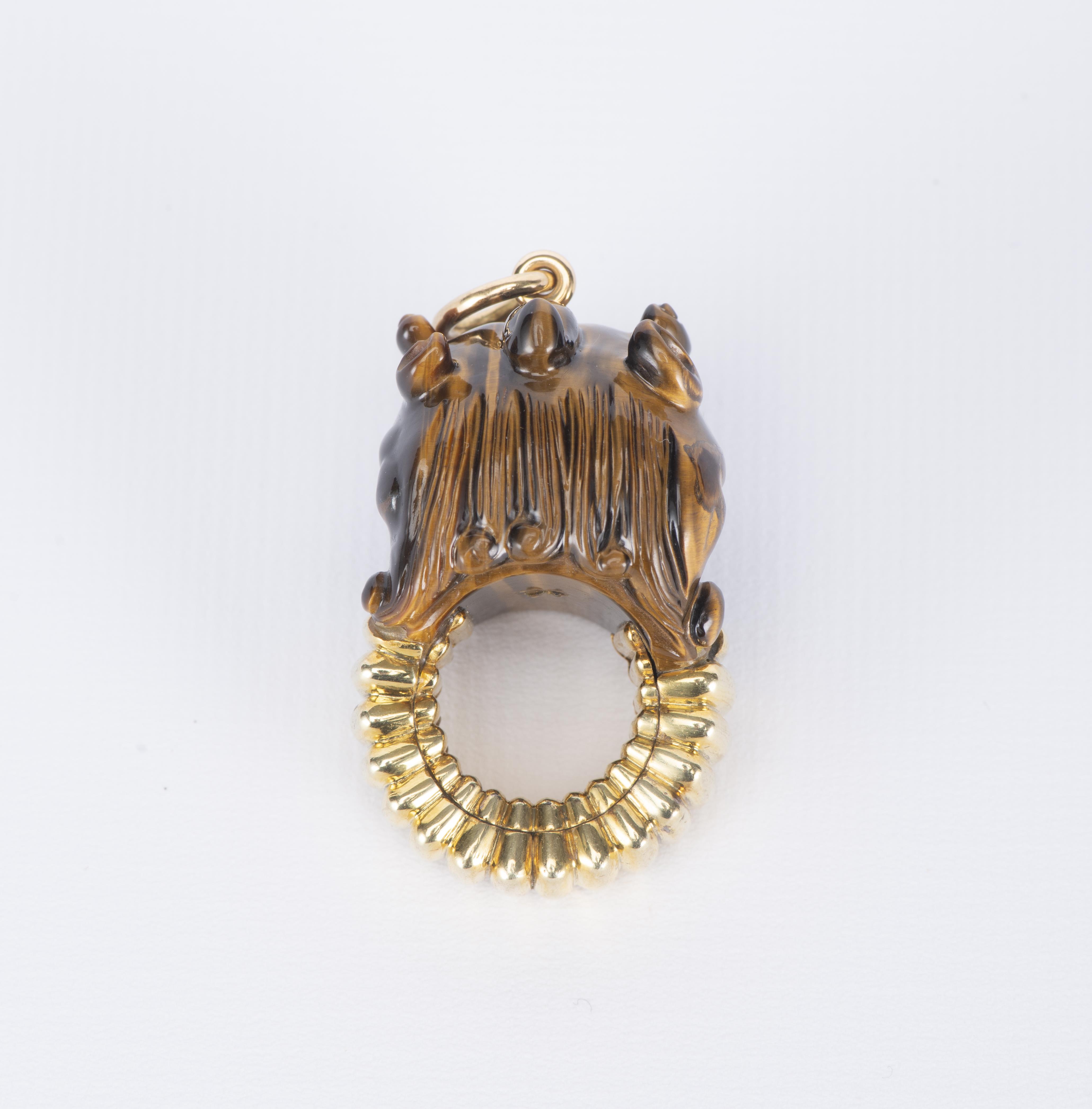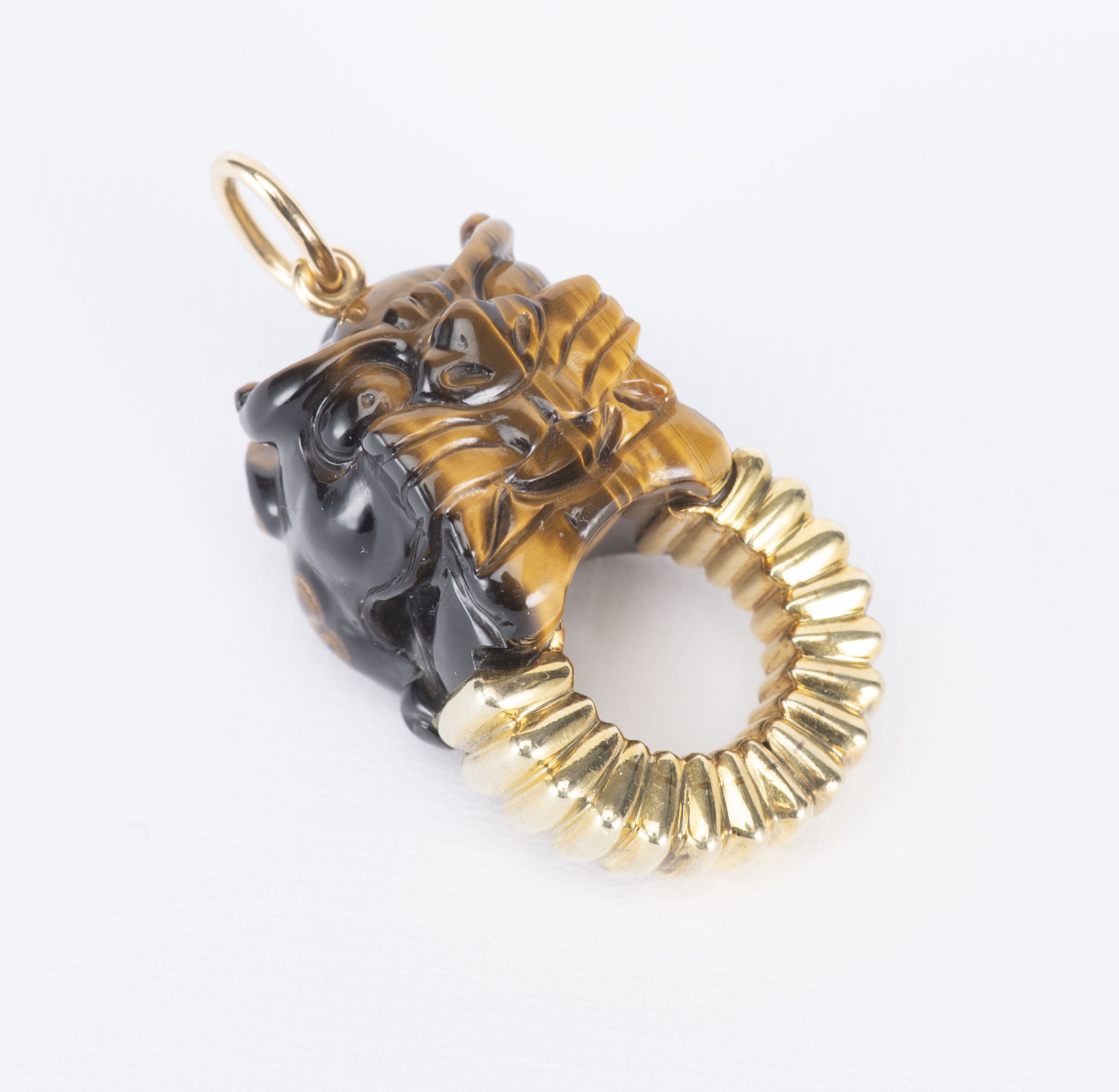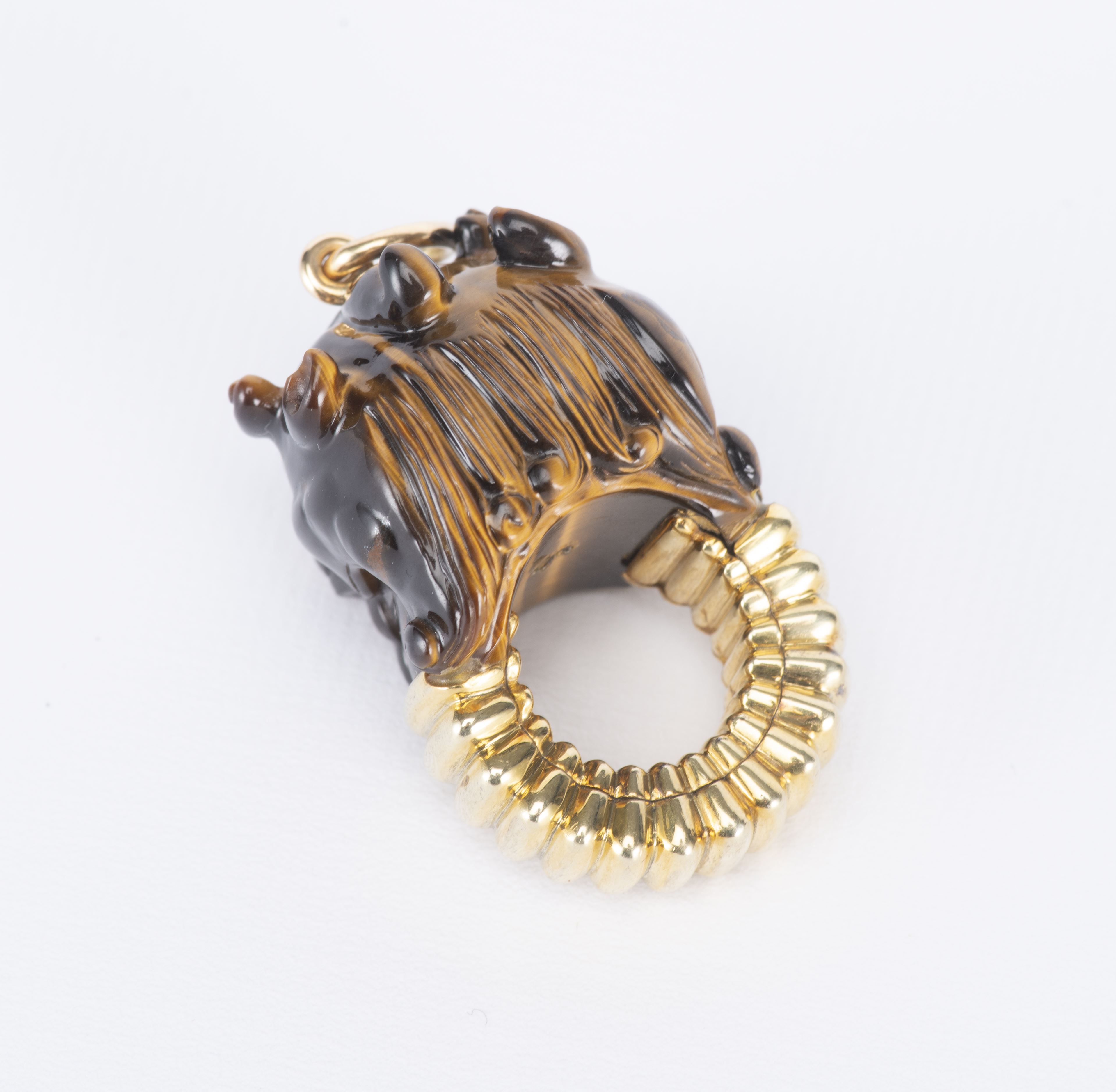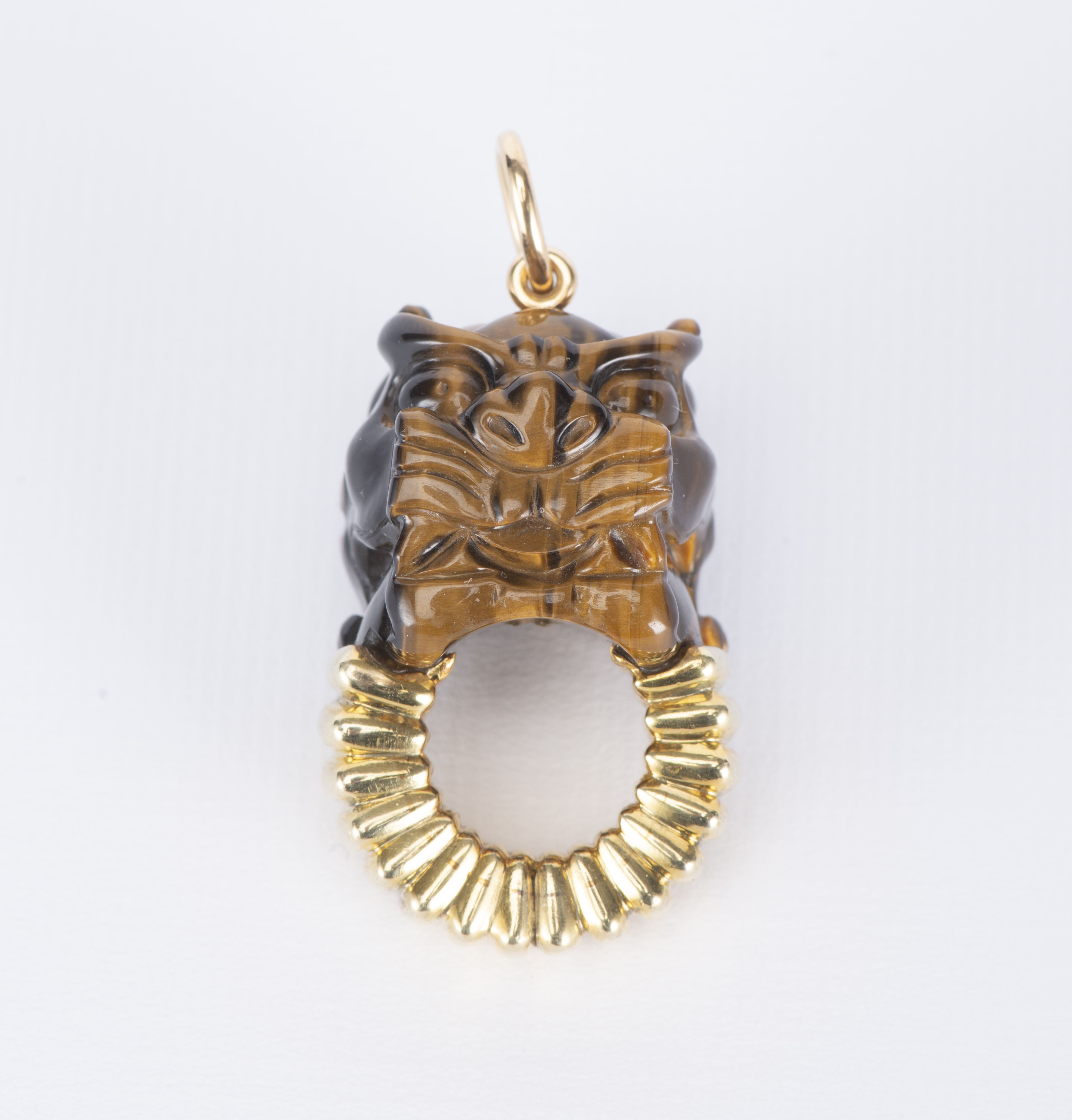 Pendentif en or jaune .750 avec tête de tigre en œil de tigre sur un anneau.