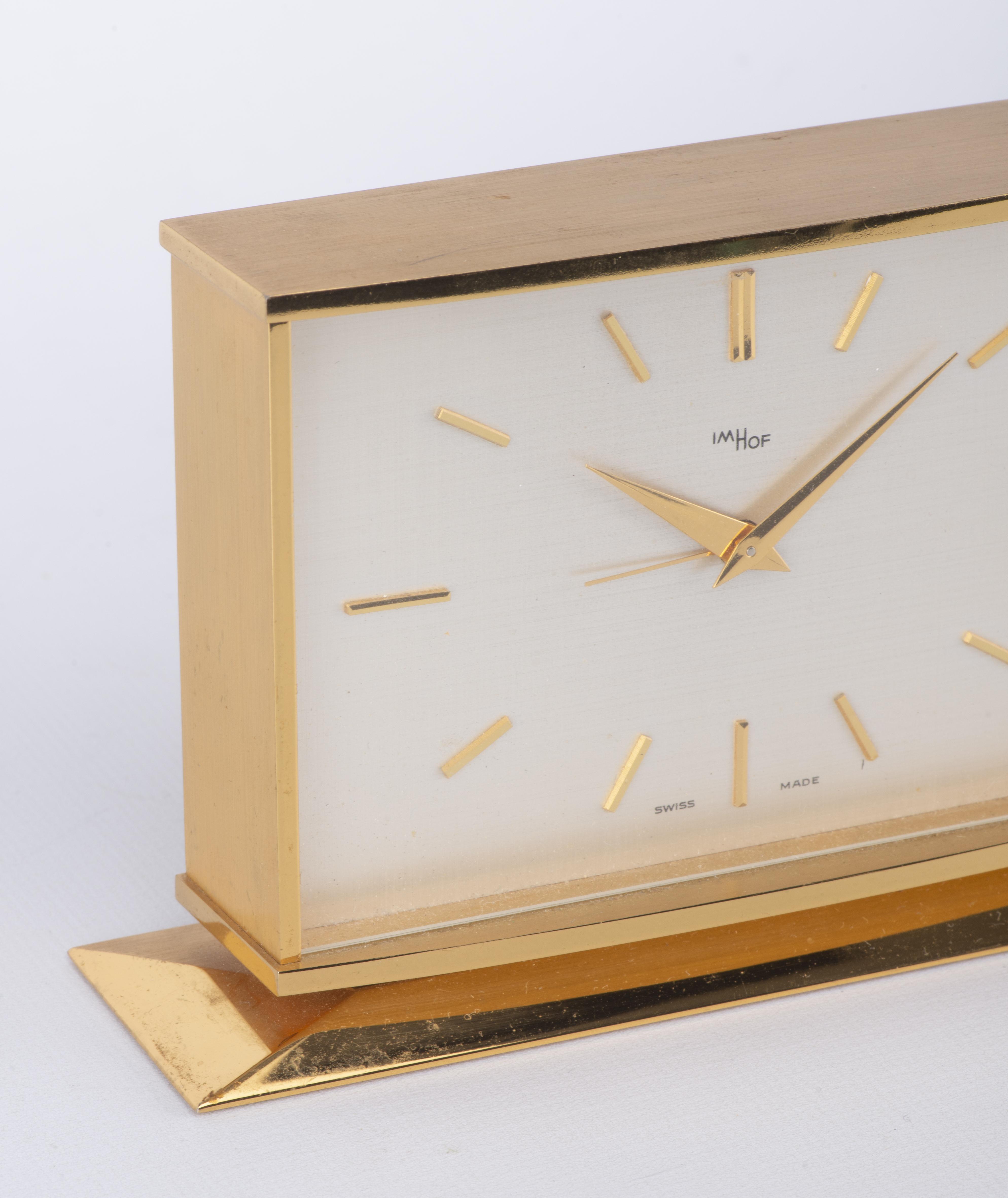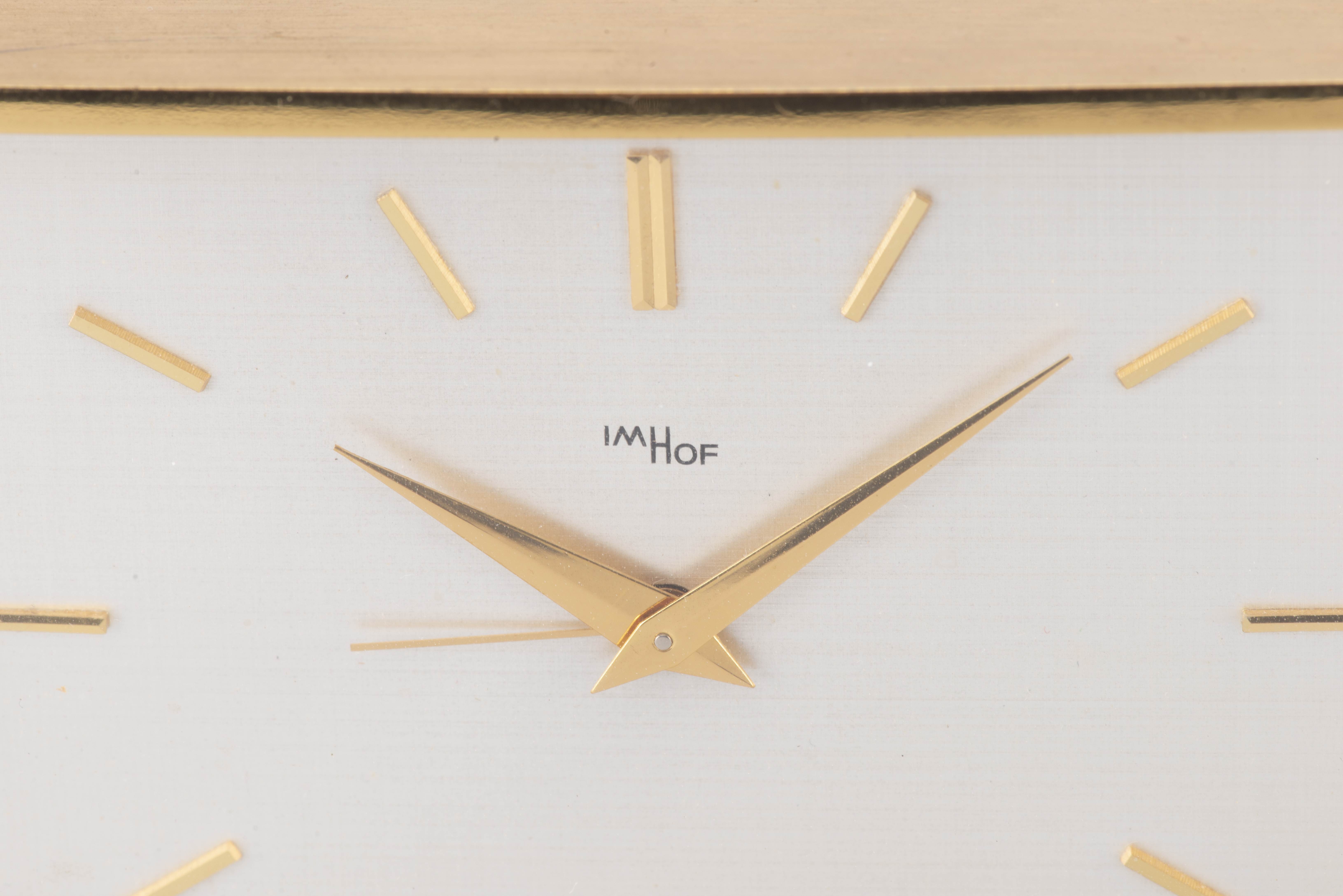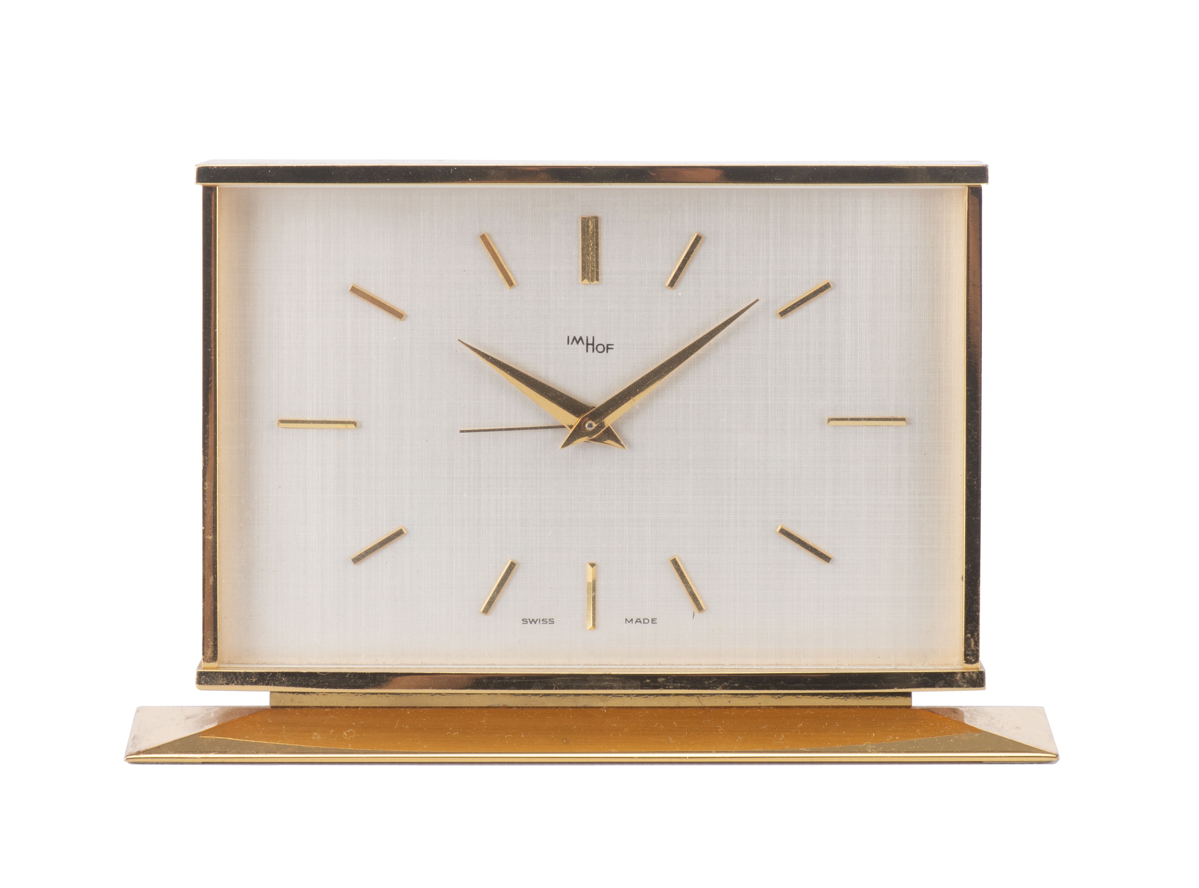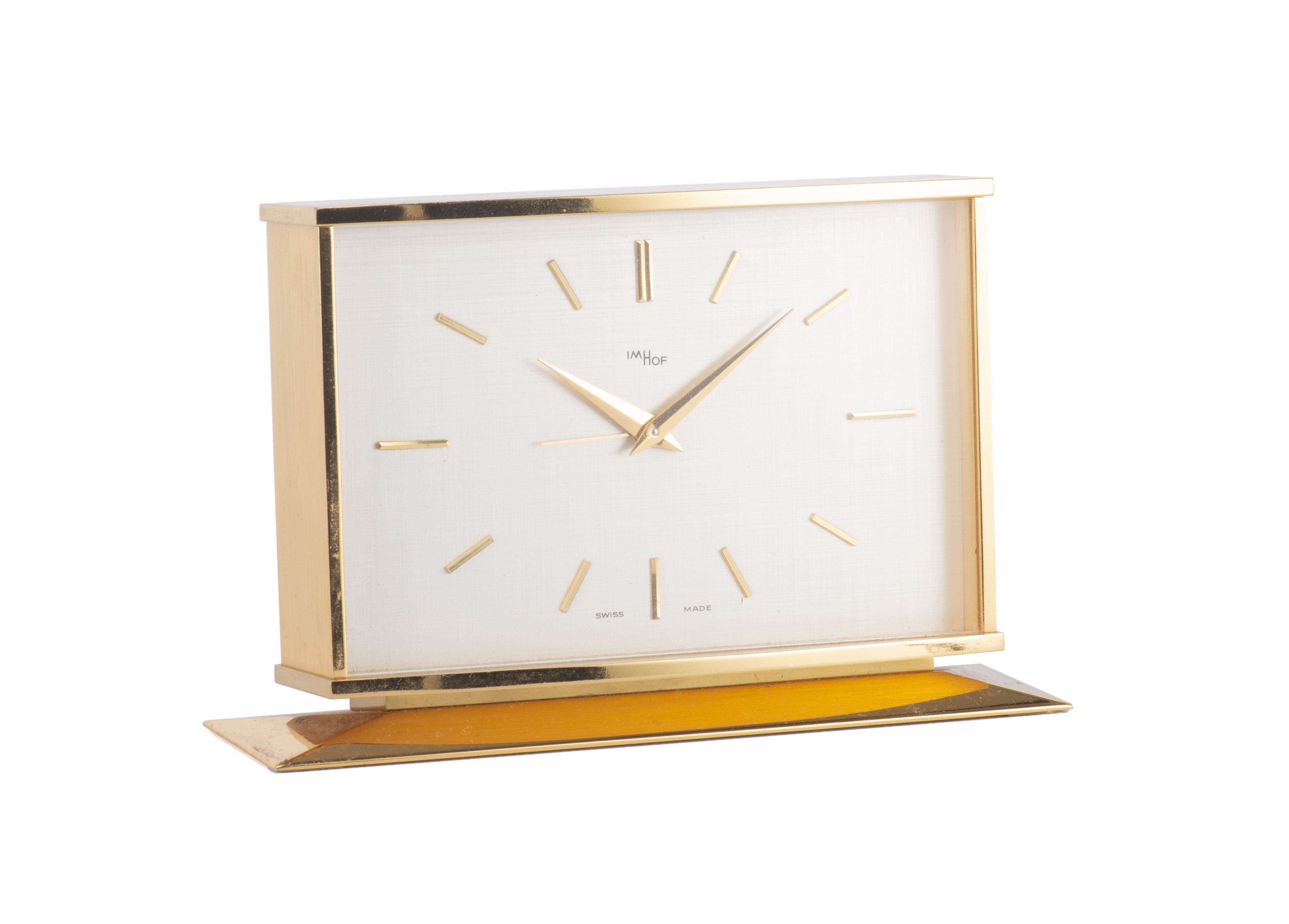 ImHof, pendulette de table en laiton doré, cadran blanc, aiguilles et index dorés.