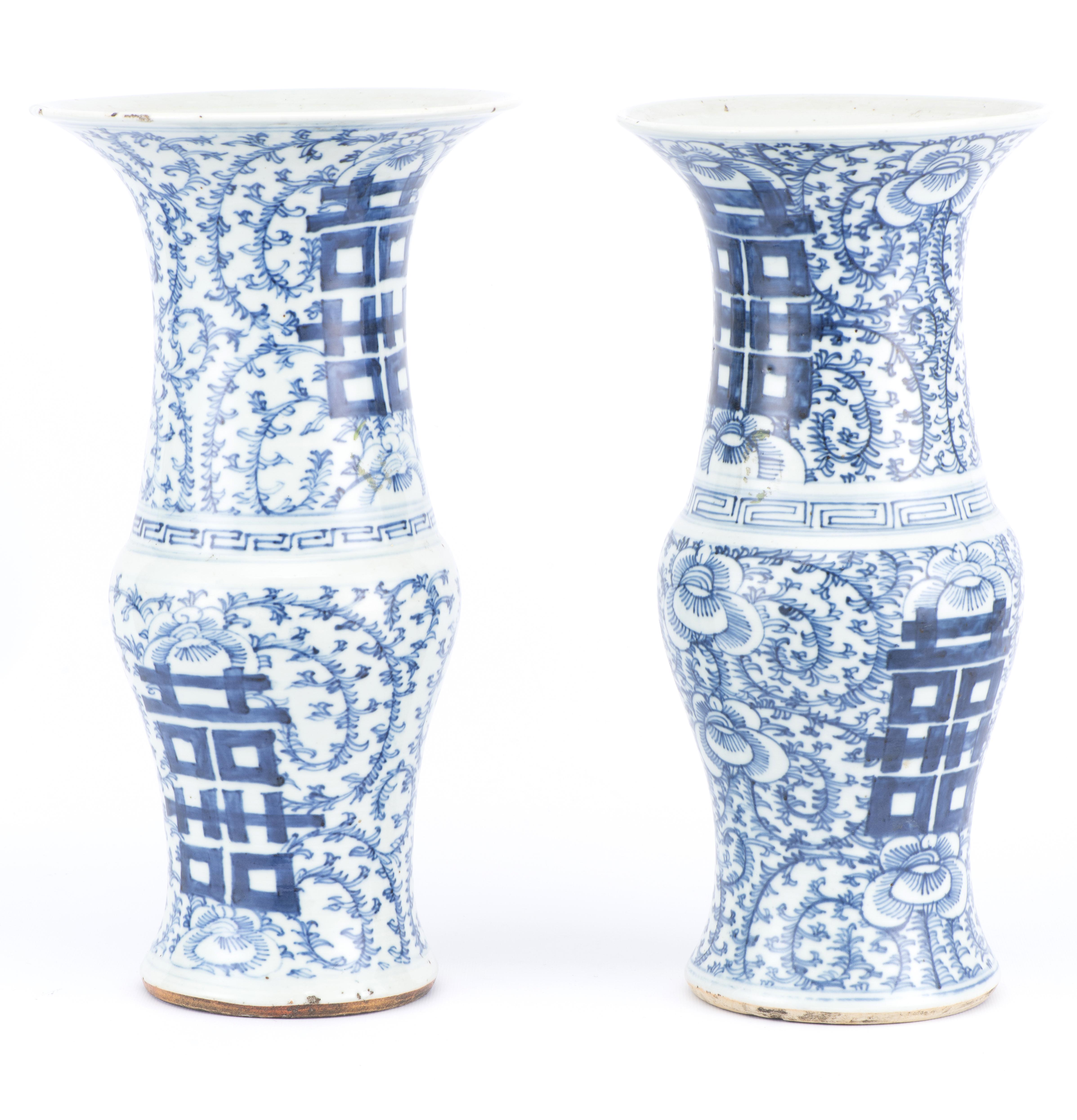 Deux vases balustres ou Yenyen en porcelaine de Chine en bleu et blanc à décor de rinceaux de fleurs en bleu sur champ blanc avec en alternance le caractère Ji de la double joie, marque apocryphe Chenghua nian zhi à 4 caractères sous la base en bleu sous couverte.