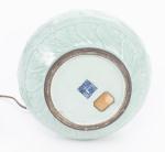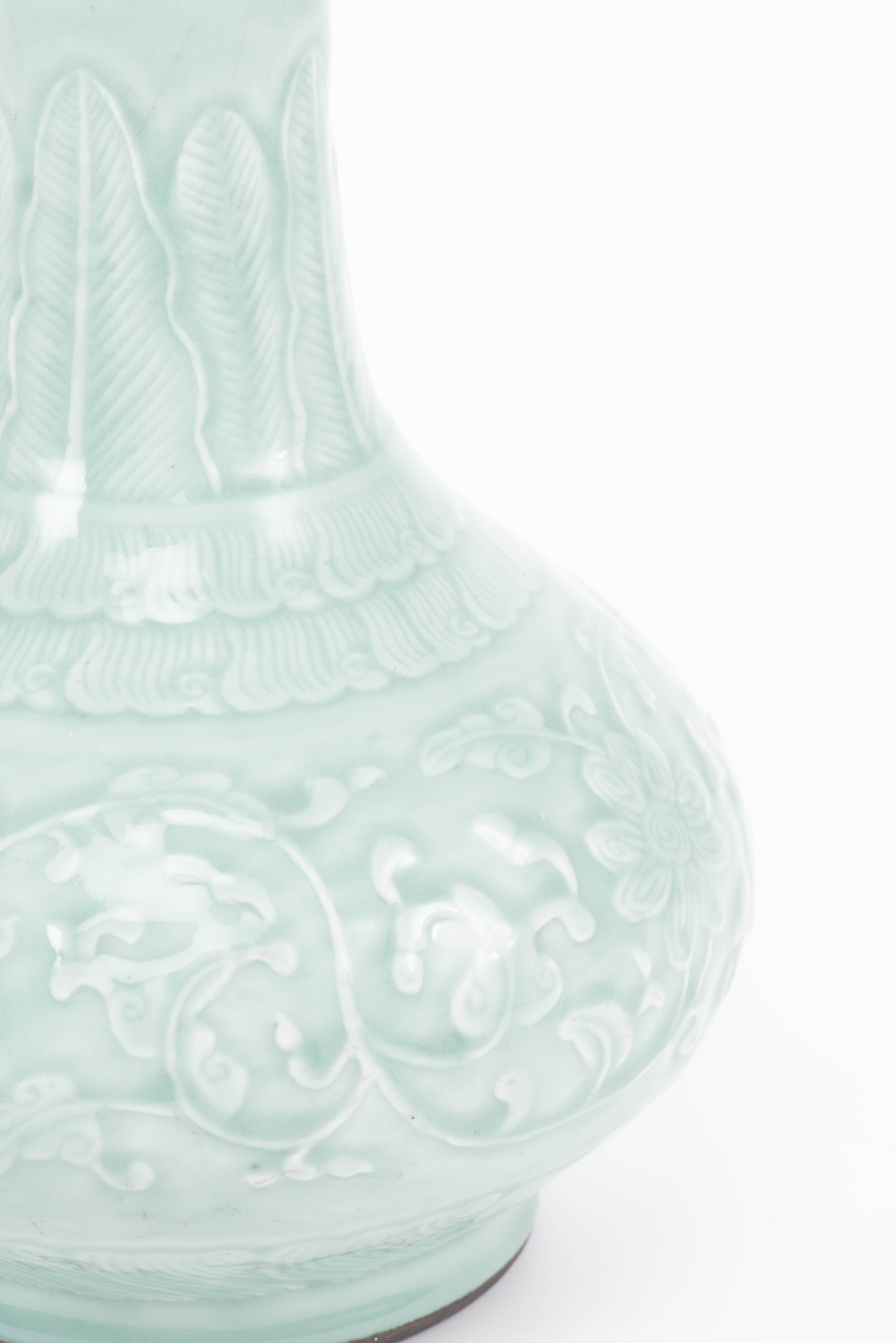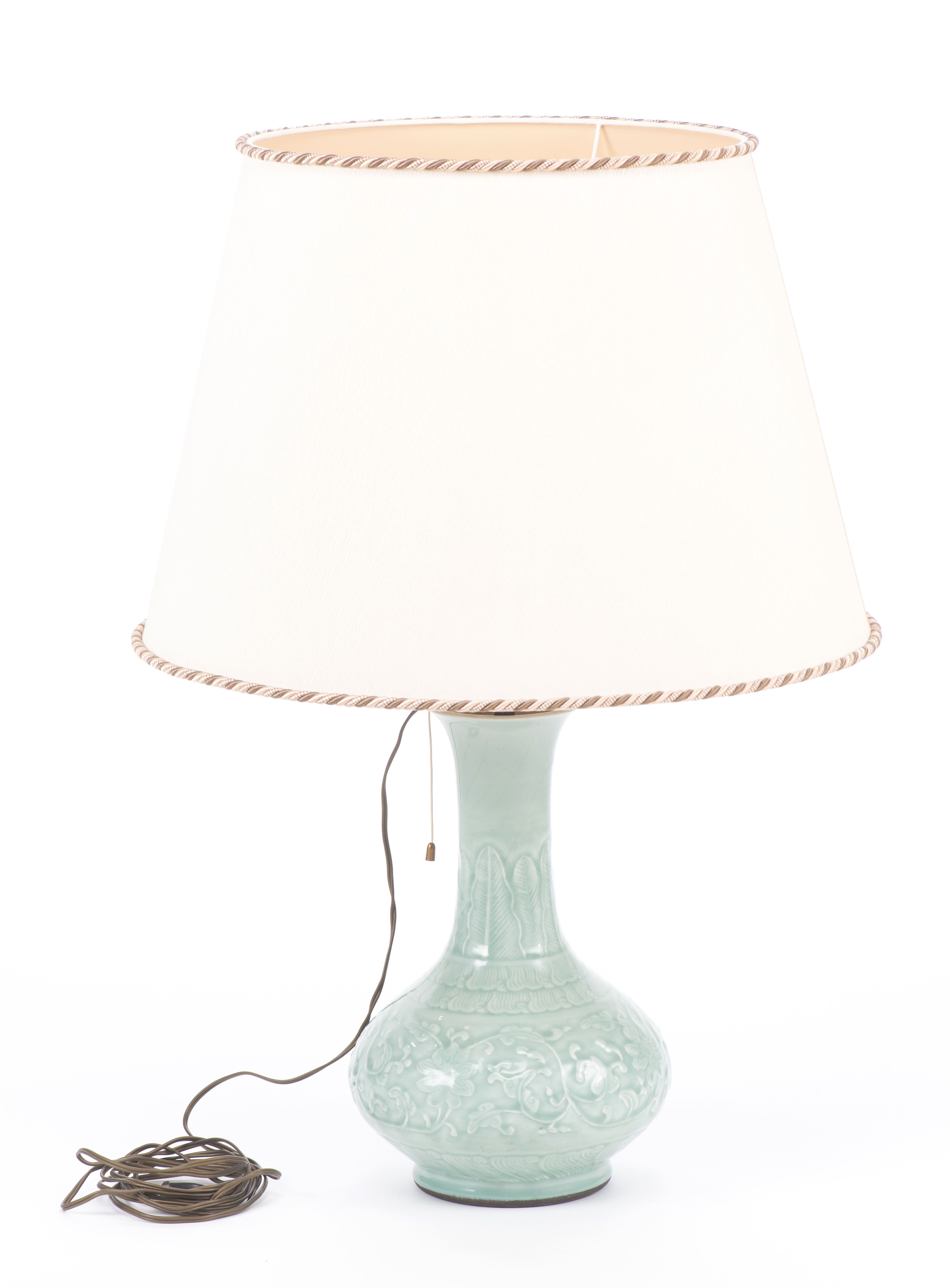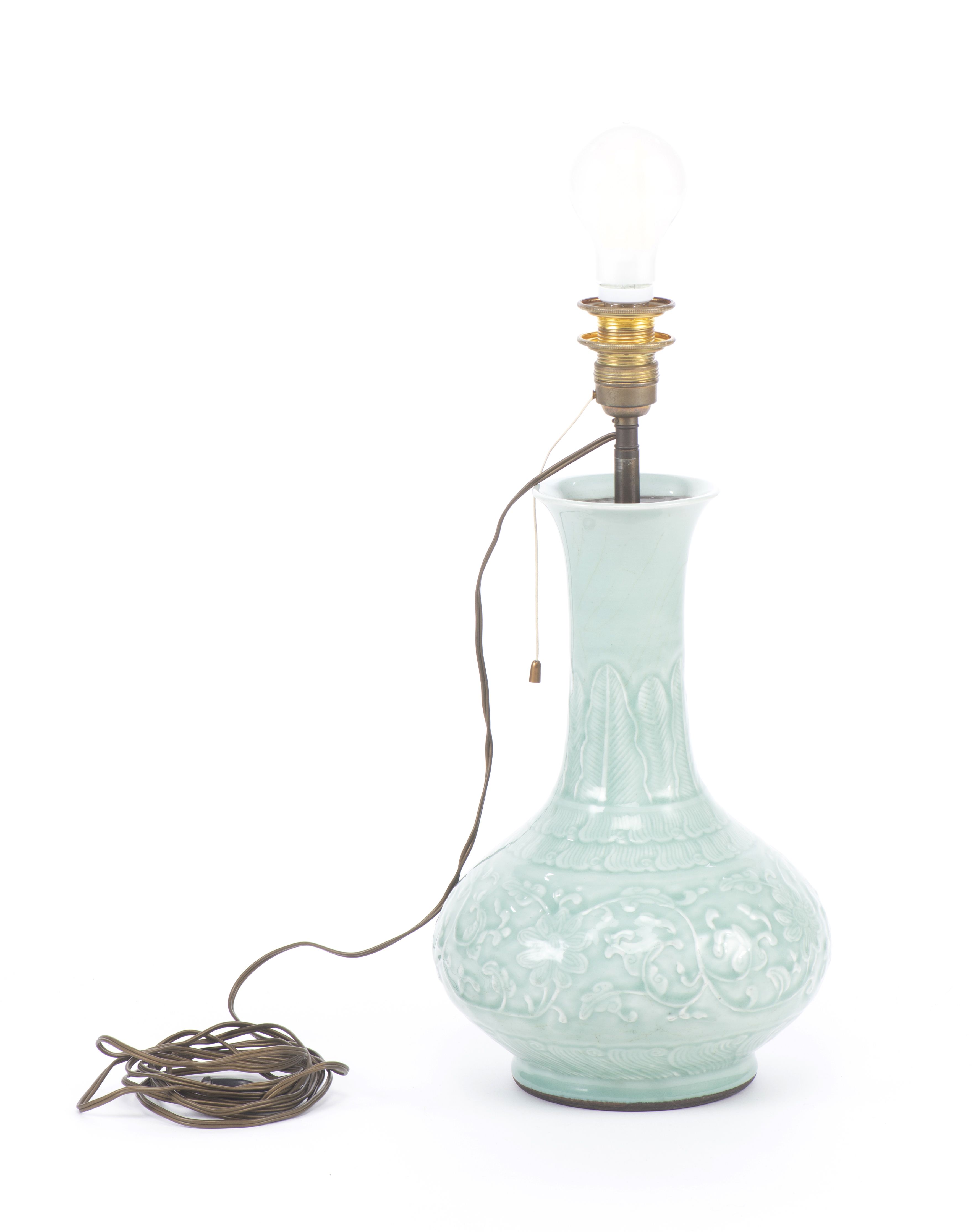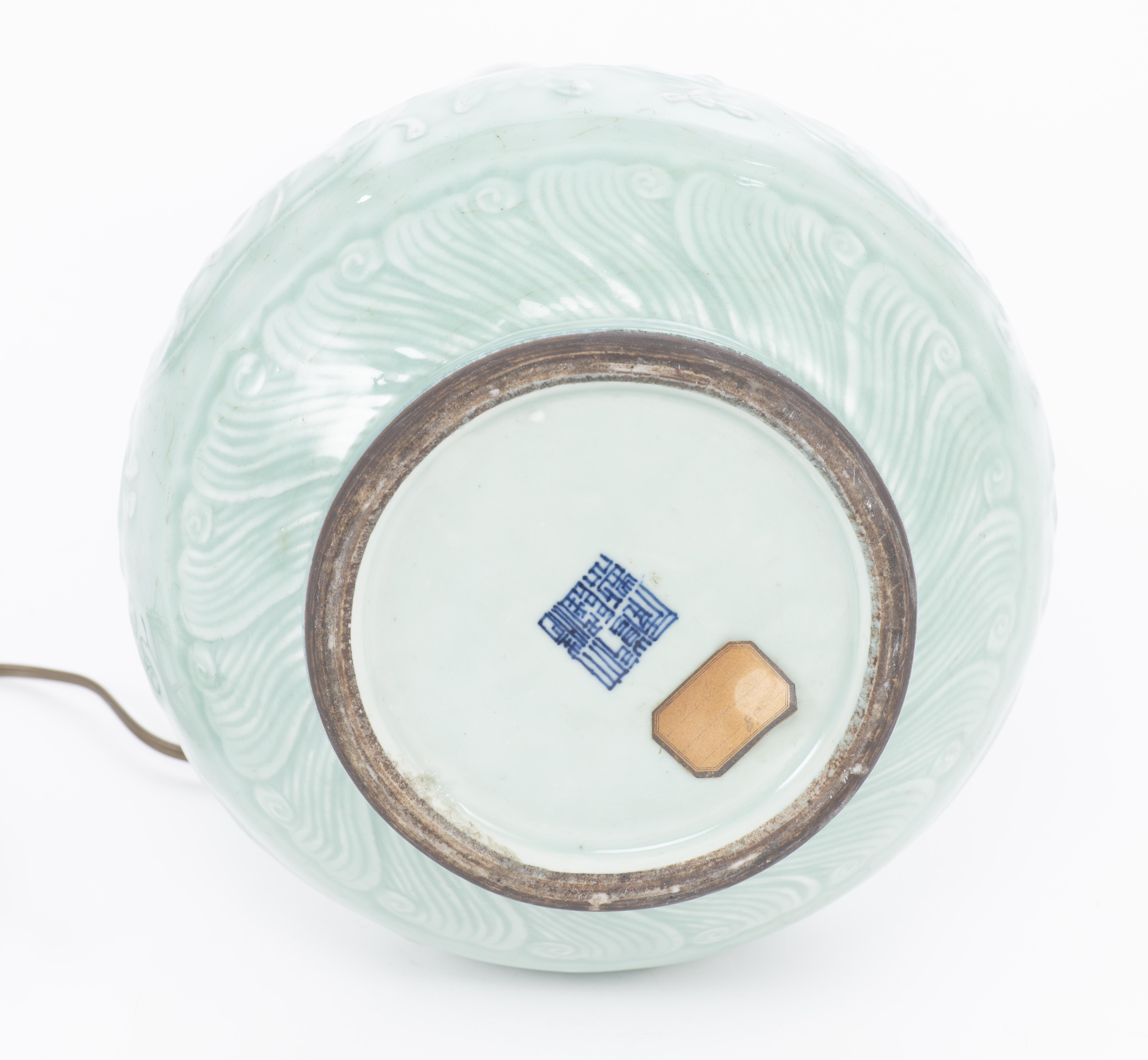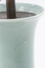 Pied de lampe de table en porcelaine de Chine à couverte céladon et décor en léger relief de fleurs de lotus et feuilles en arabesques pour le registre central; bas de la panse et épaule à frise de vagues, col trompette à frise de Banian. Marque apocryphe à 6 caractères sous la base Daqing Qianlong nianzhi. XIXe
