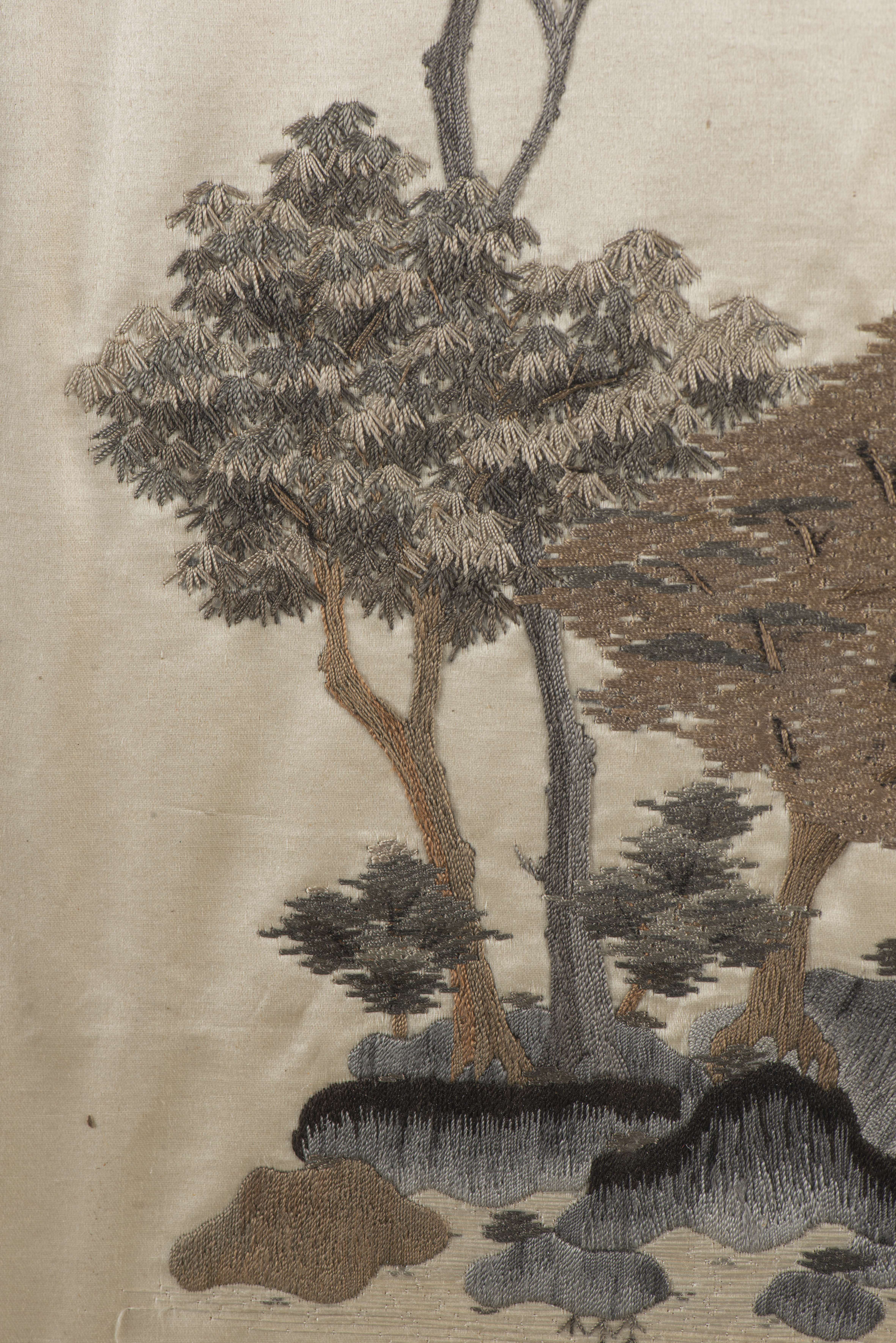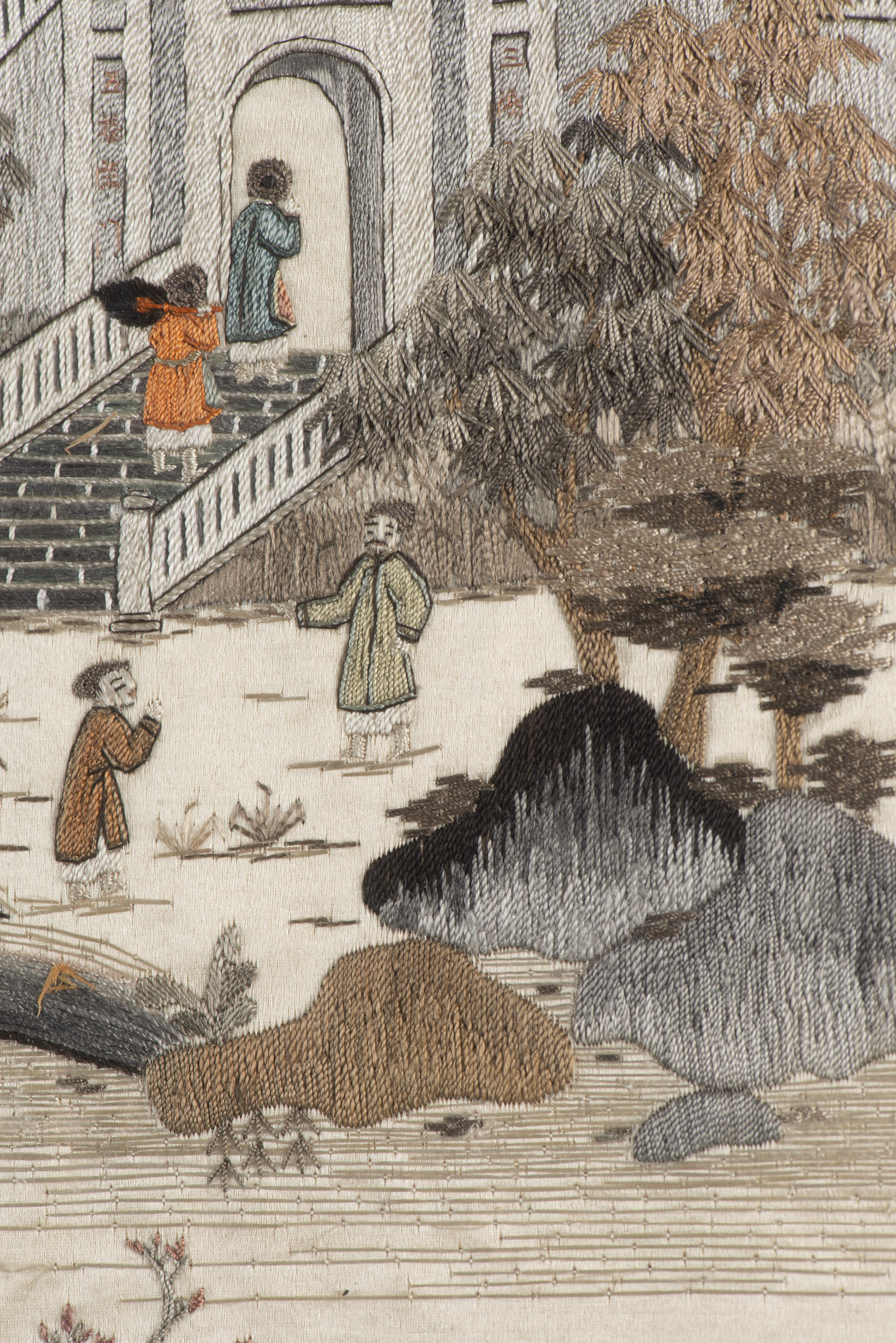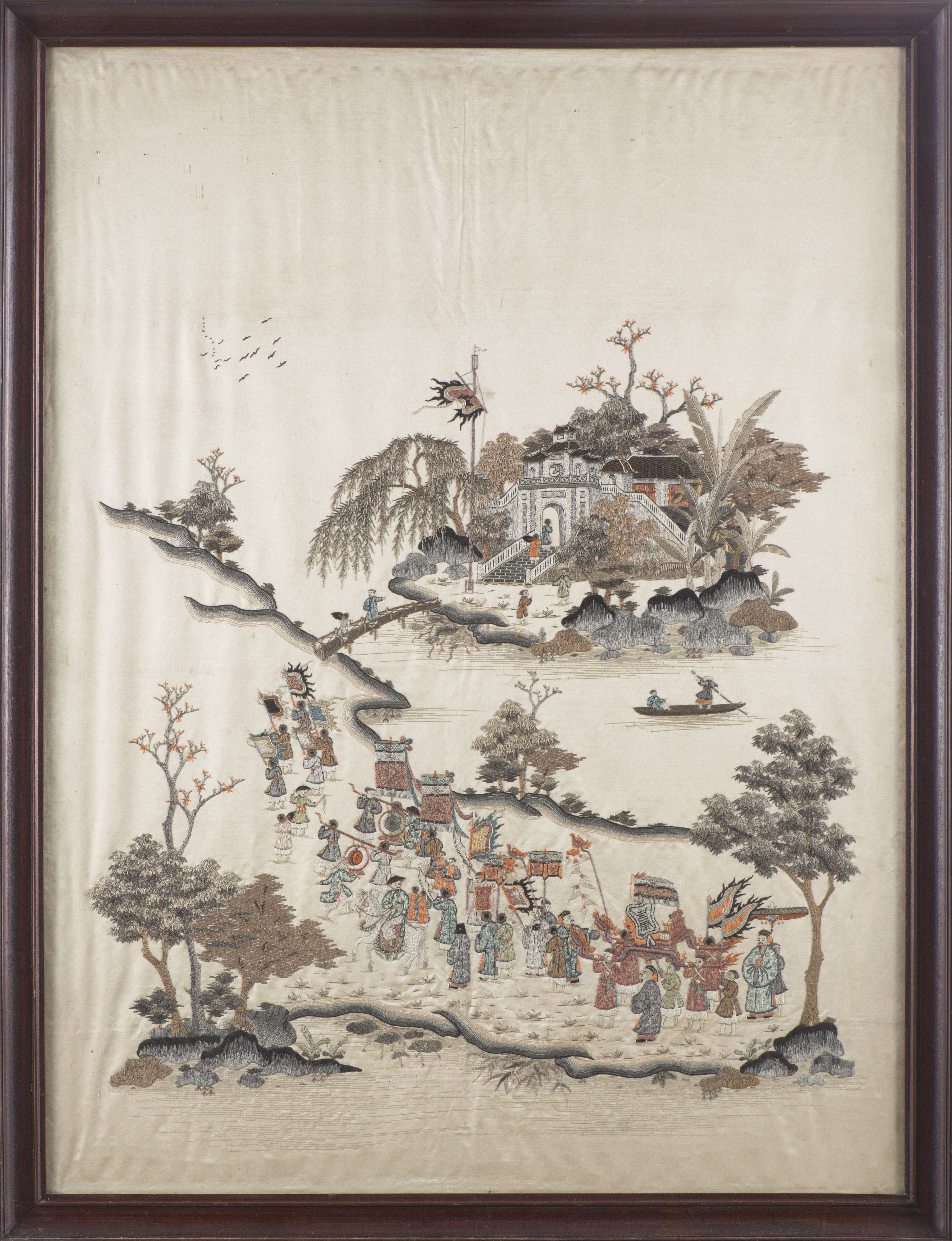 Tenture chinoise ou broderie sur soie illustrant une procession.