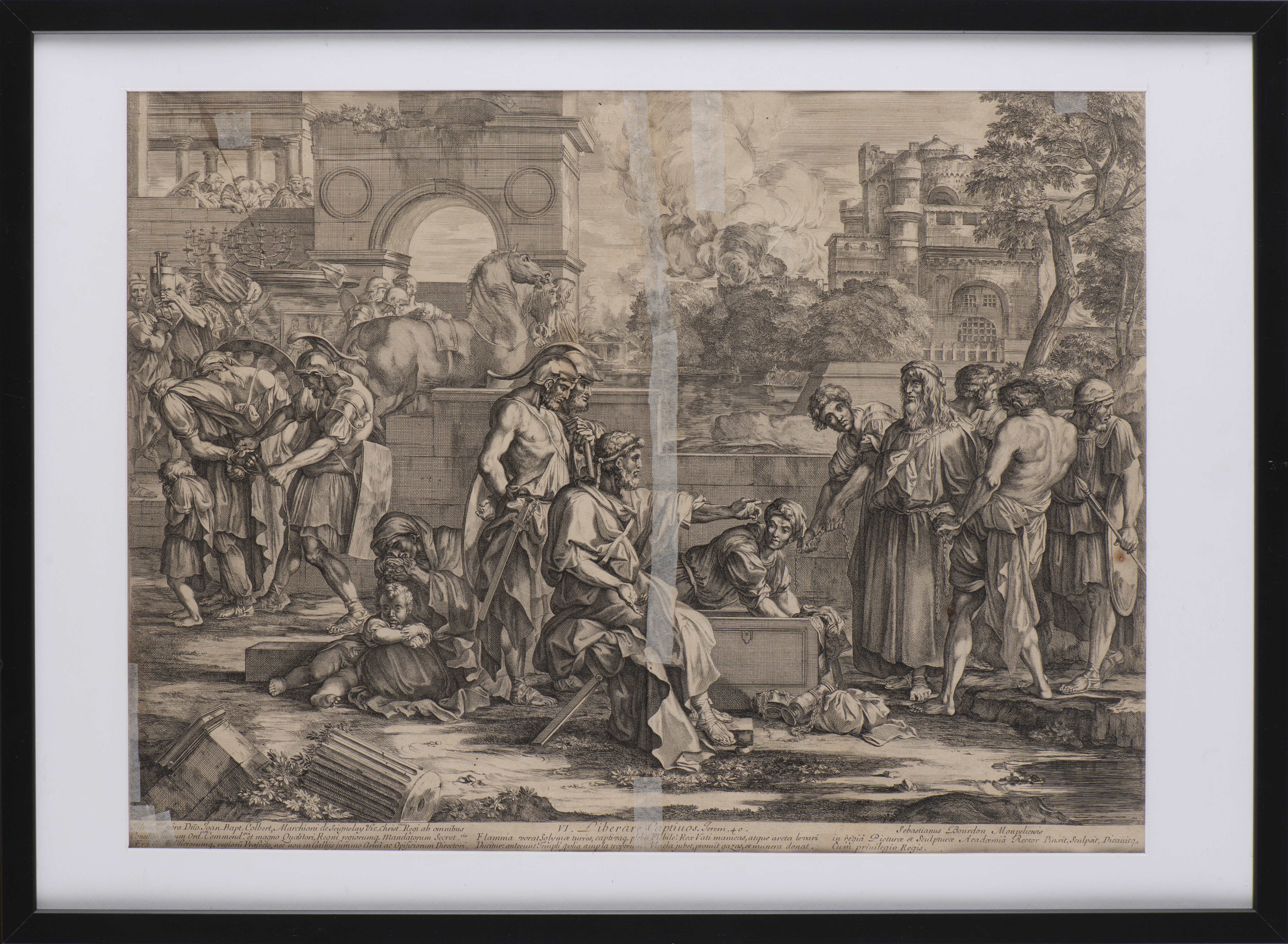 - "Après la prise de Jérusalem, Nabuzardam fait ôter les chaines à Jérémie", sixième numéro de la suite "Les Sept œuvres de miséricorde, Liberare captivos", gravure sur cuivre avec filigrane, ref.: Dutuit page 65, Robert-Dumesnil 7, 42.5x58 cm.