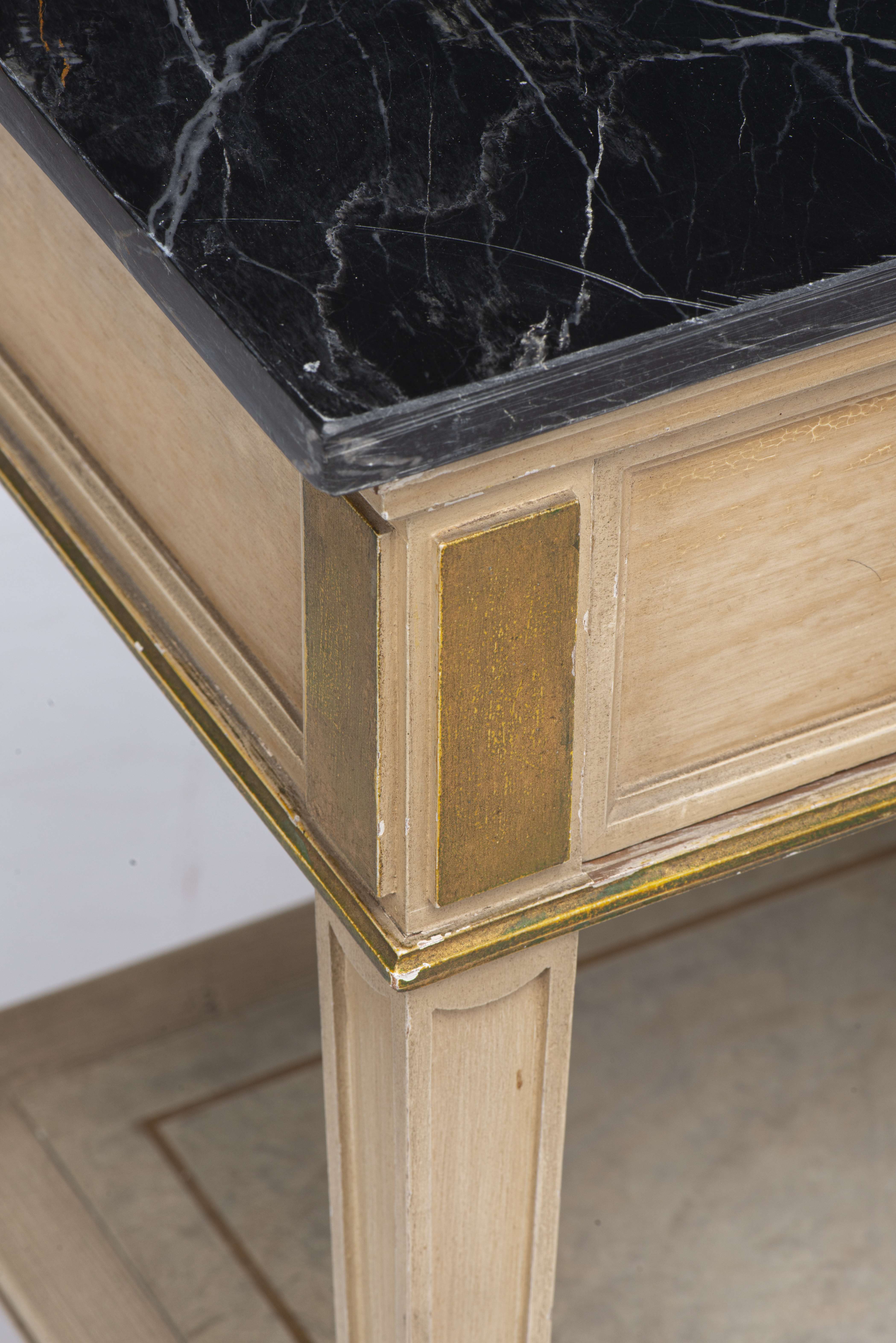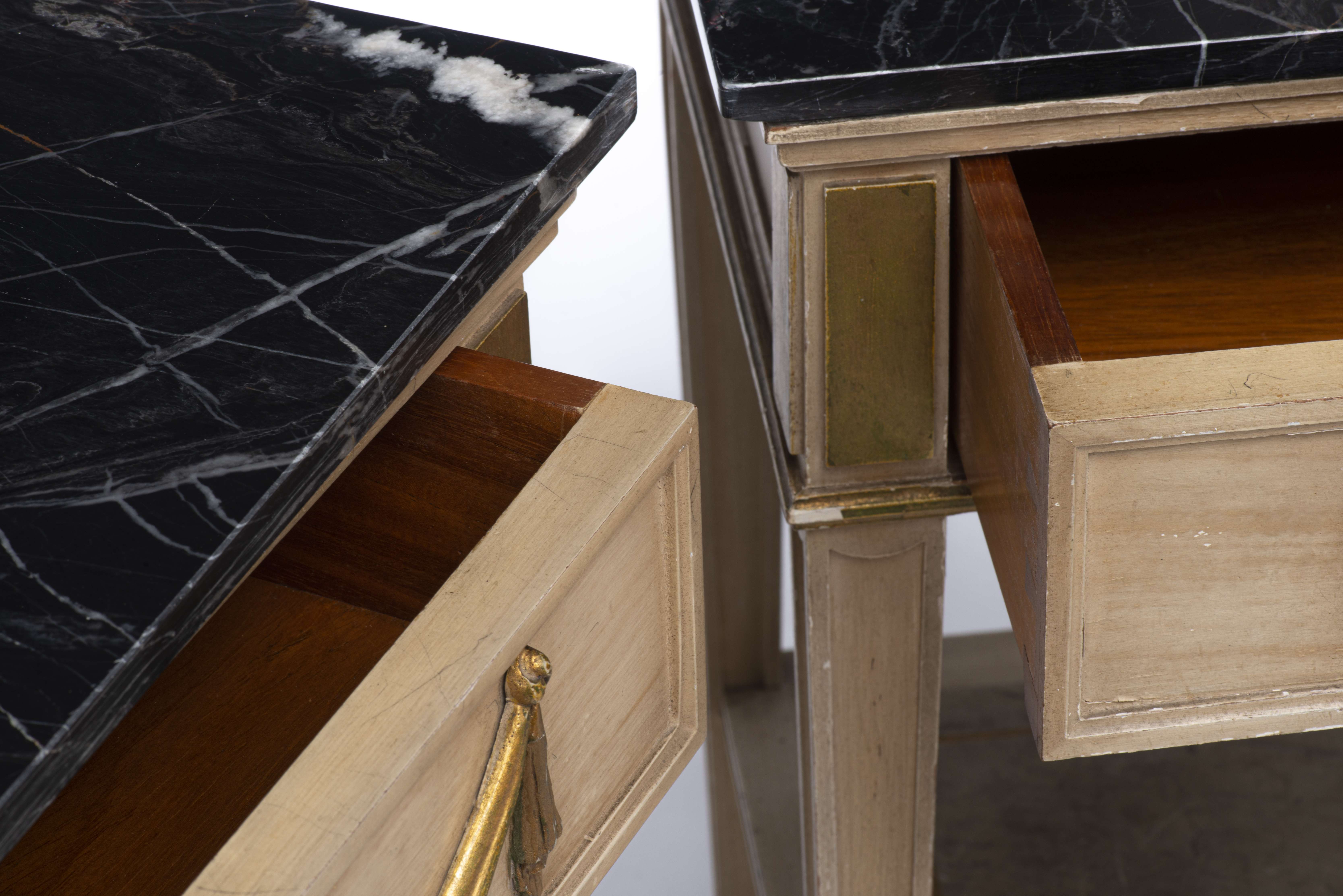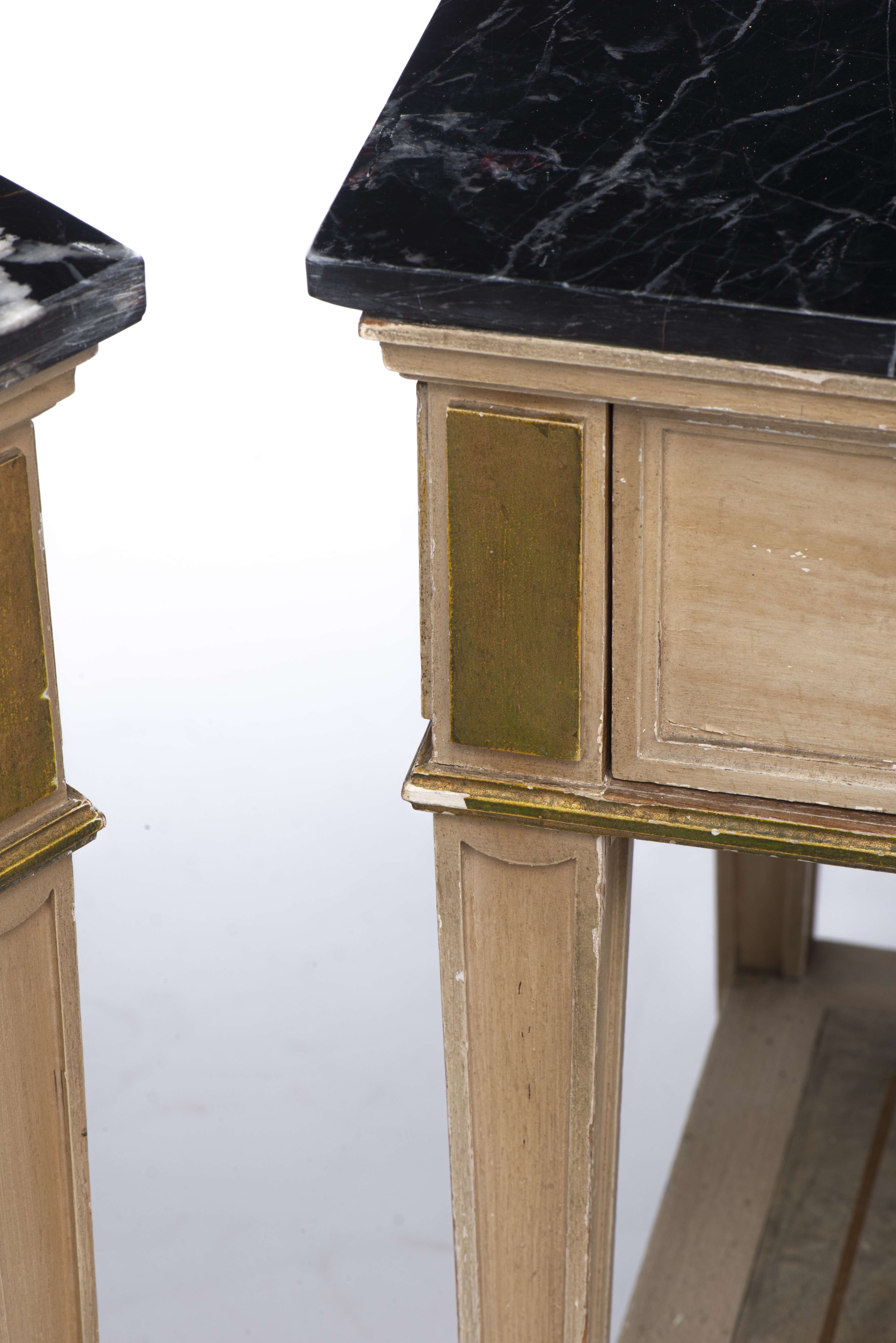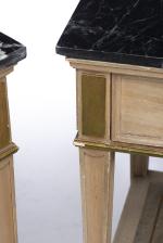 Paire de chevet de style Louis XVI, bois teinté, 1 tiroir dans le bandeau, dessus de marbre noir.