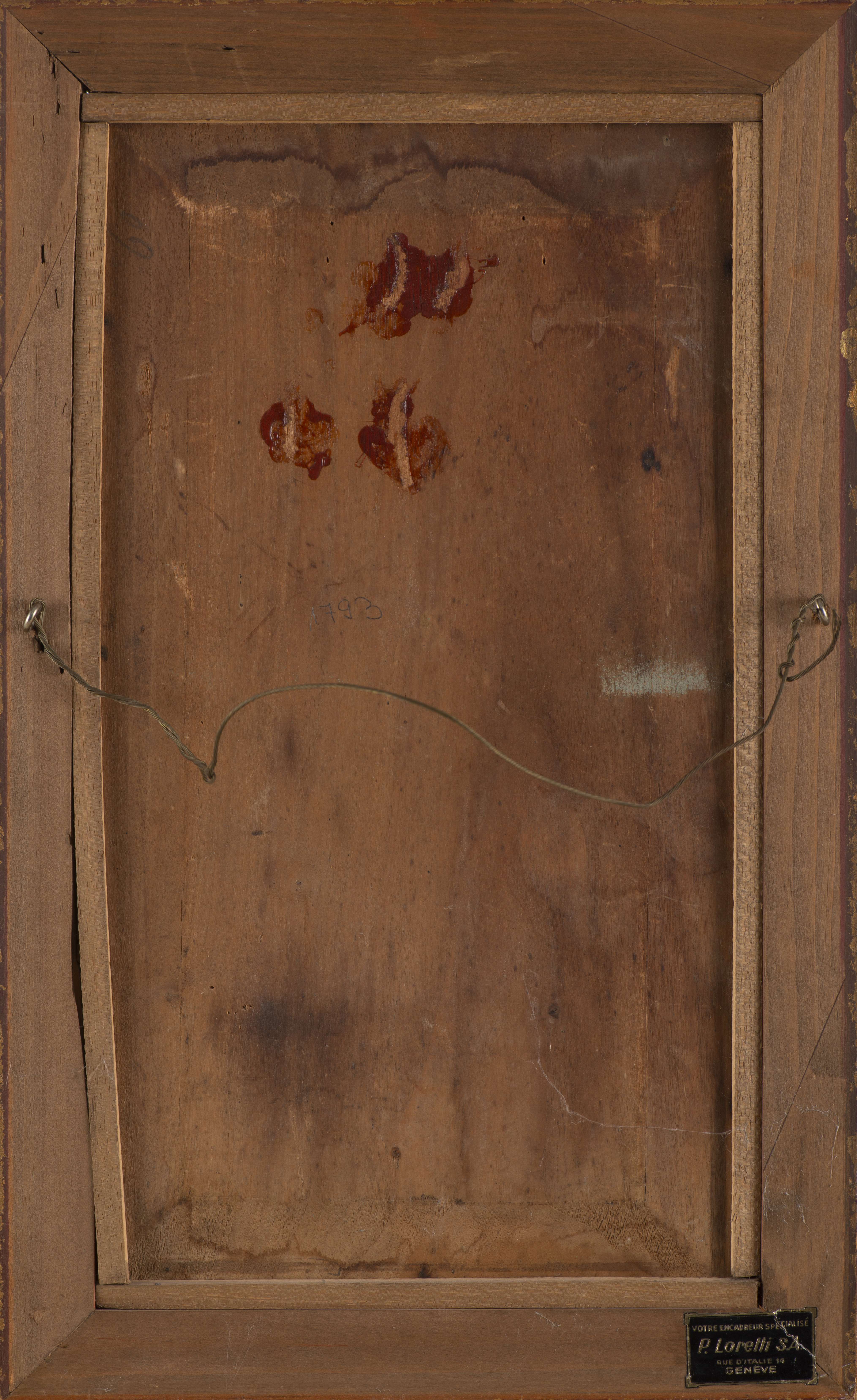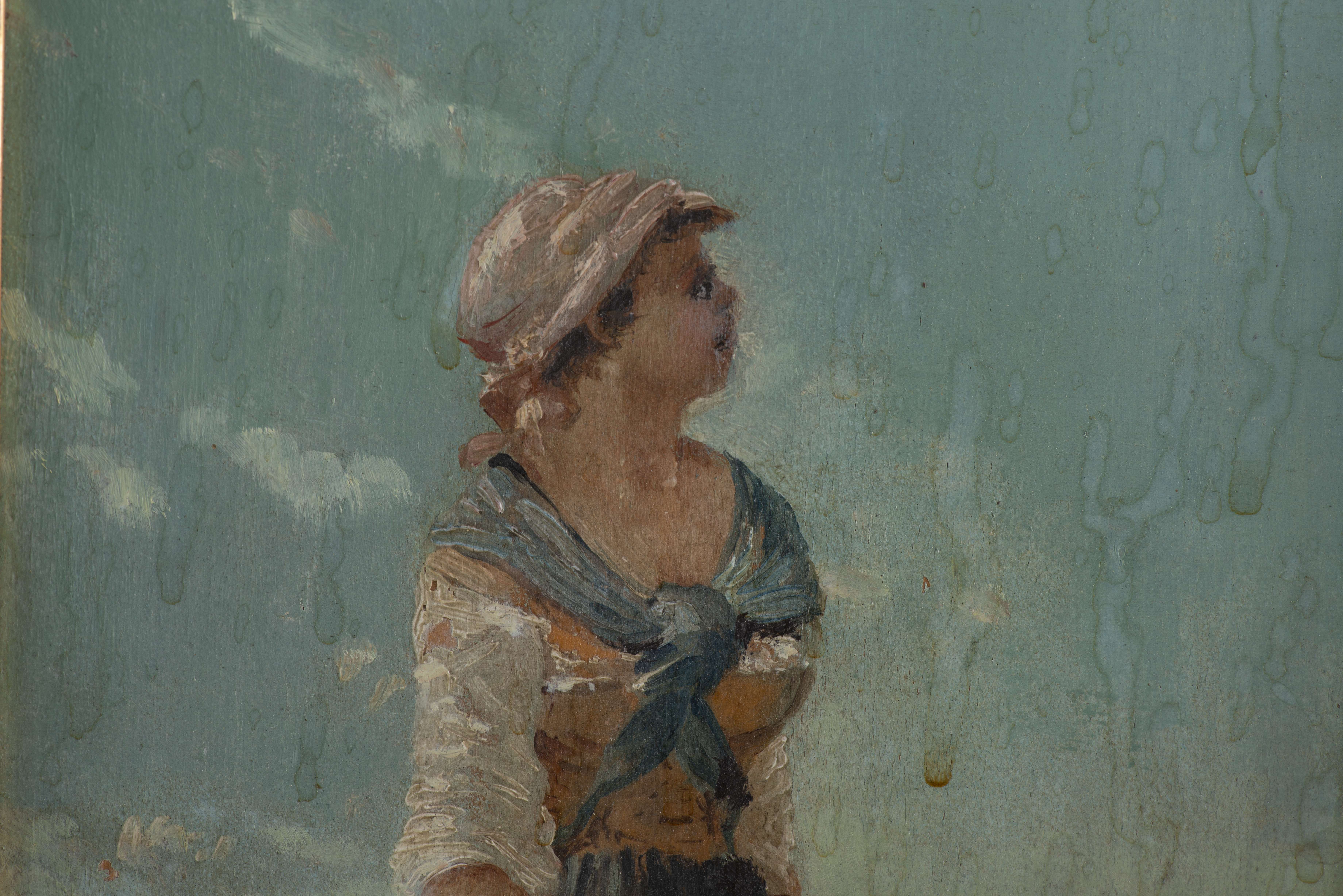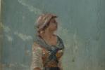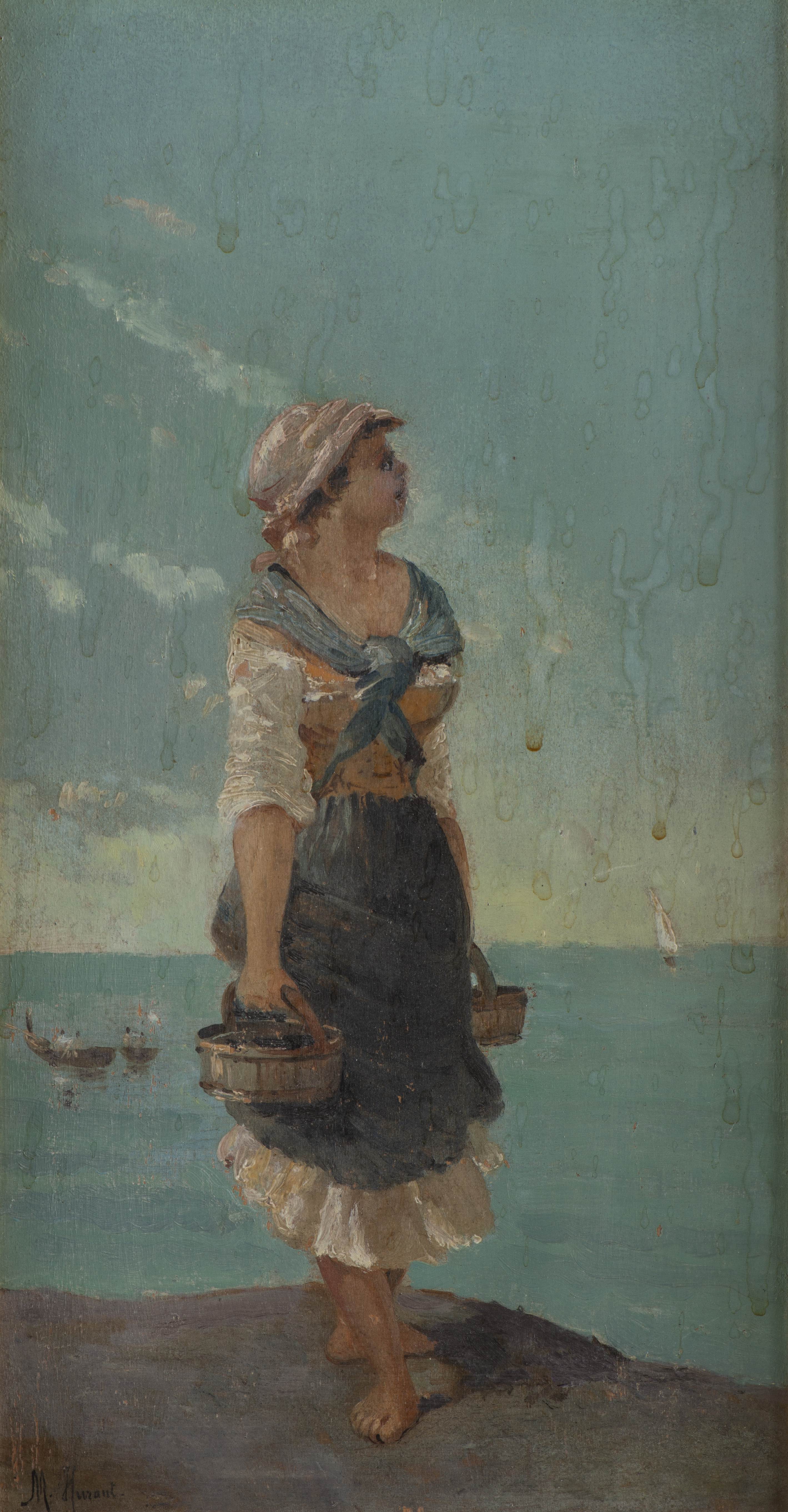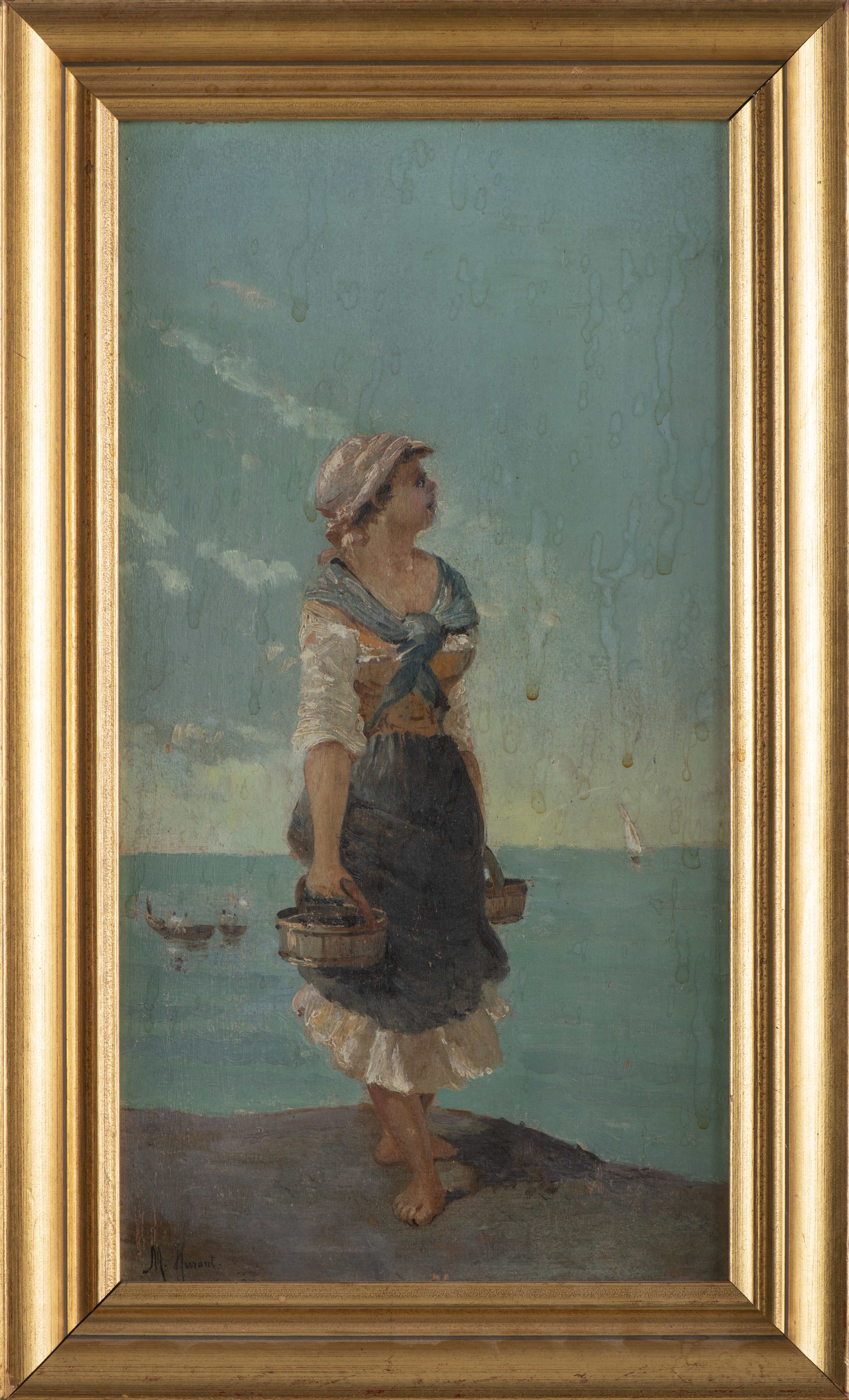 - "La poissonnière devant la mer", huile sur bois signée en bas à gauche.