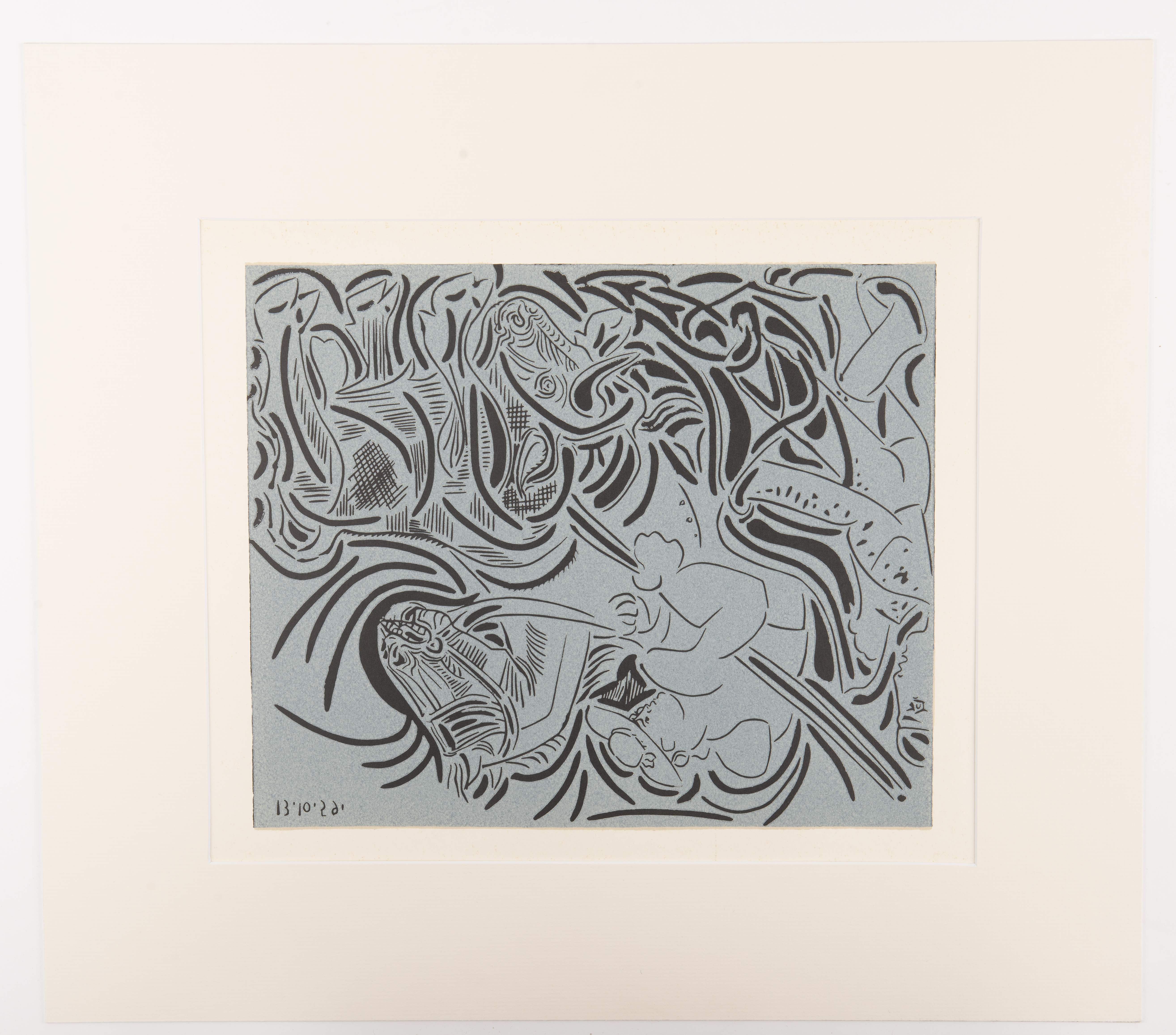 Pablo PICASSO (1881-1973, d'après), trois linogravures, "Bacchanale", "Bacchanale au taureau noir" et "Pique"