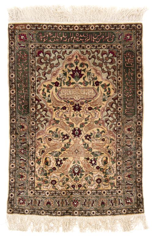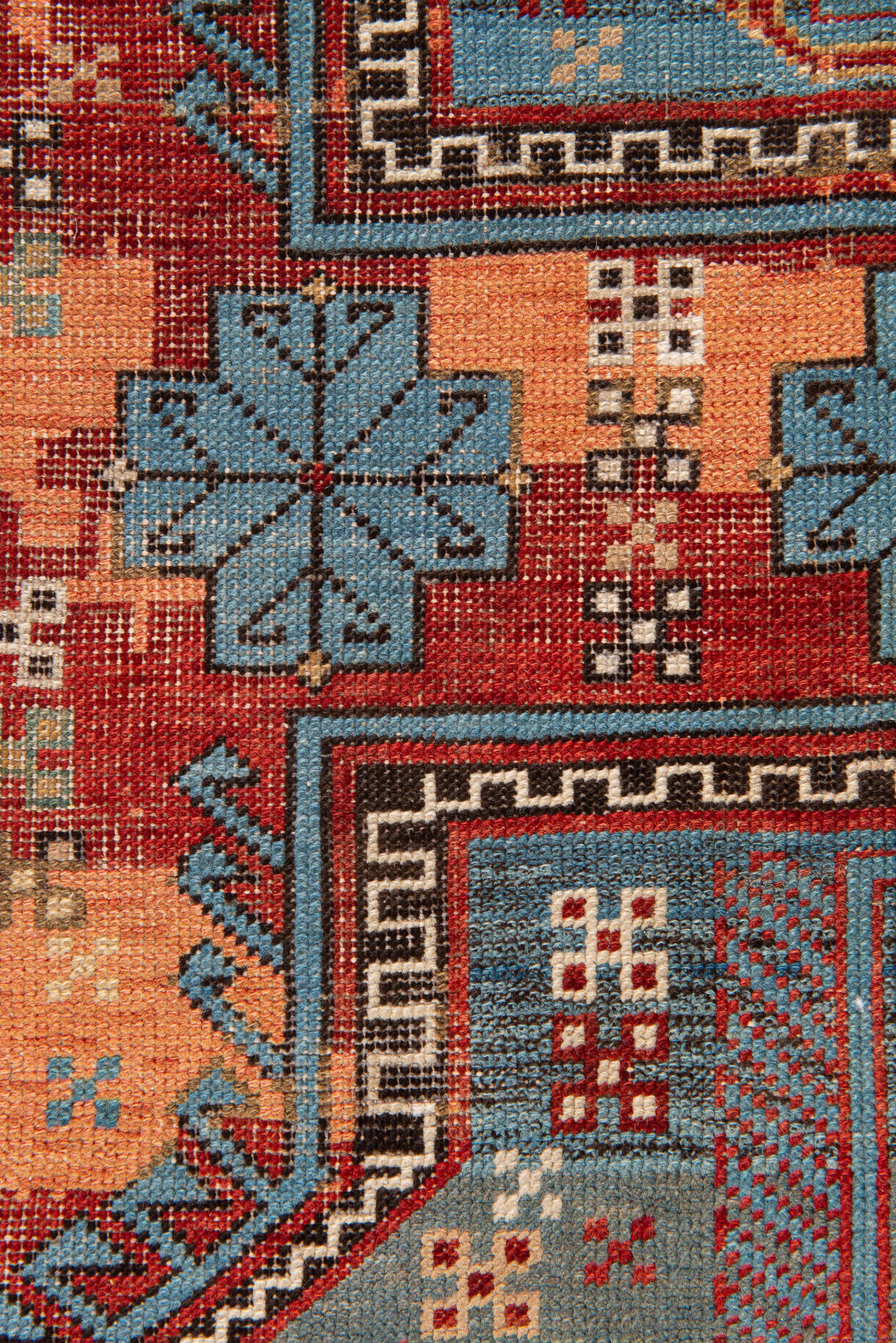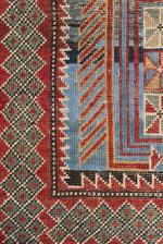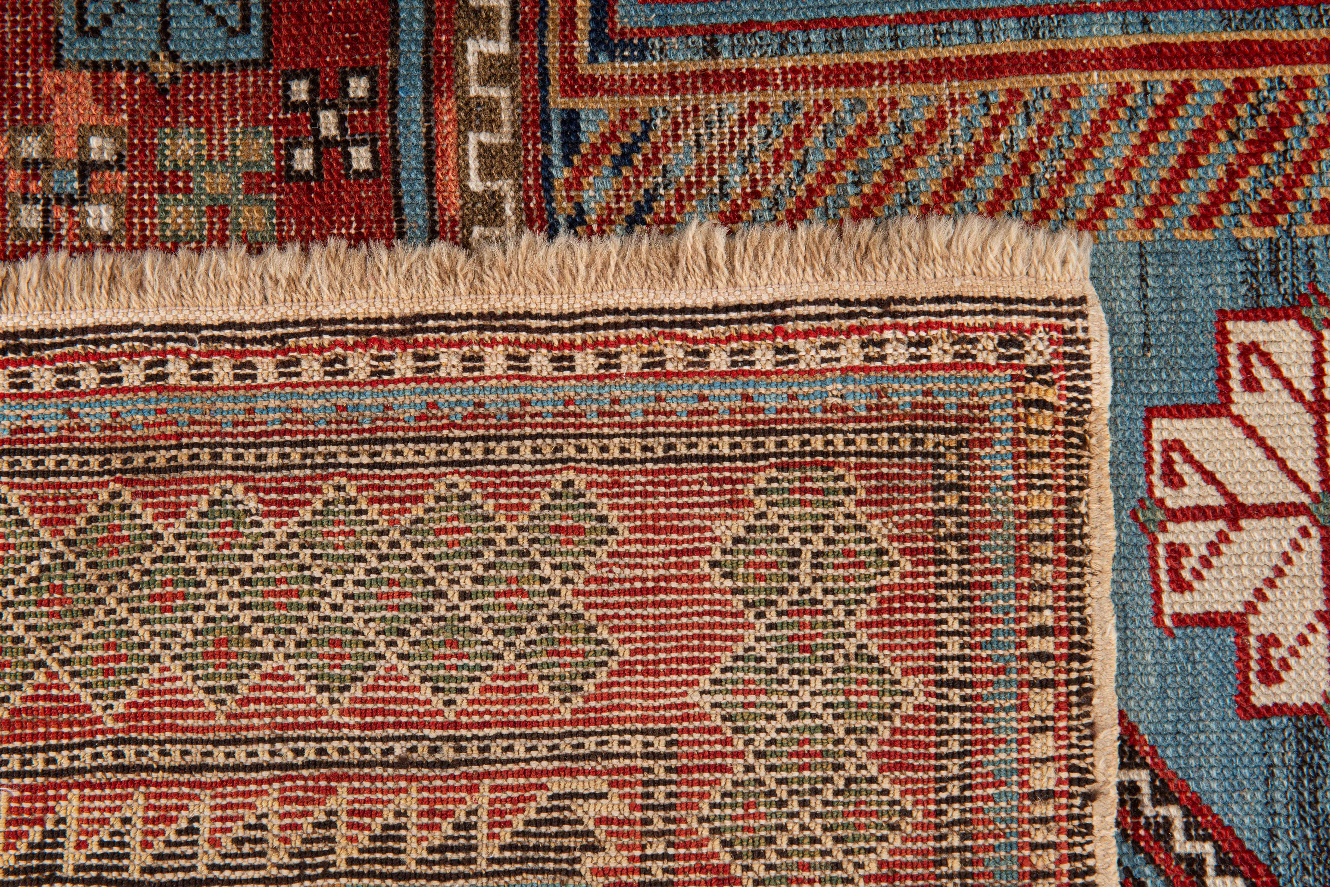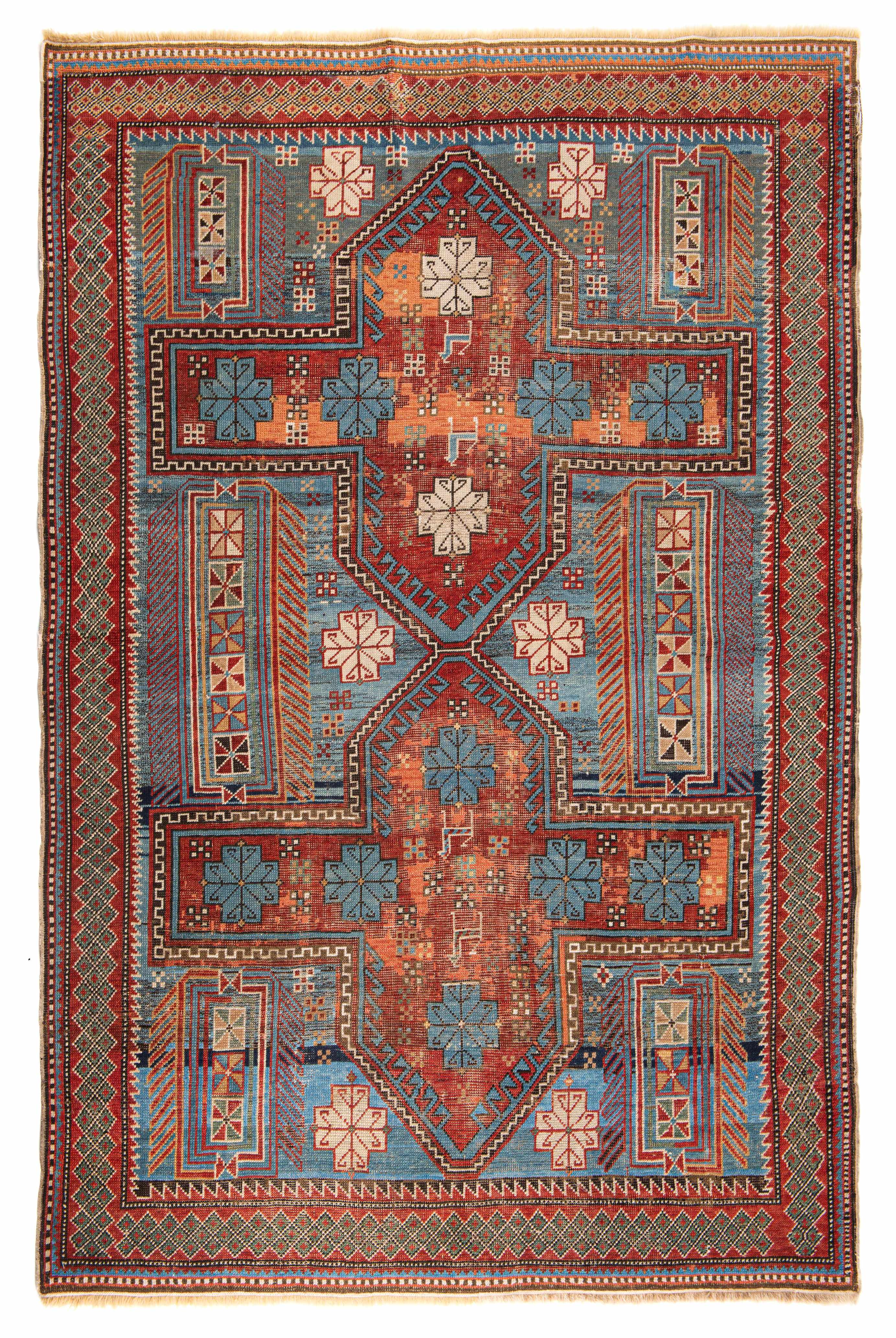 Tapis du Caucase Kuba du XIXe en laine sur trame de laine de chèvre à champ principal à deux jardins en croix à pourtour crénelé et décor d'animaux et fleurs sur champ rouge, sur un champ principal bleu cial parsemé d'étoiles.