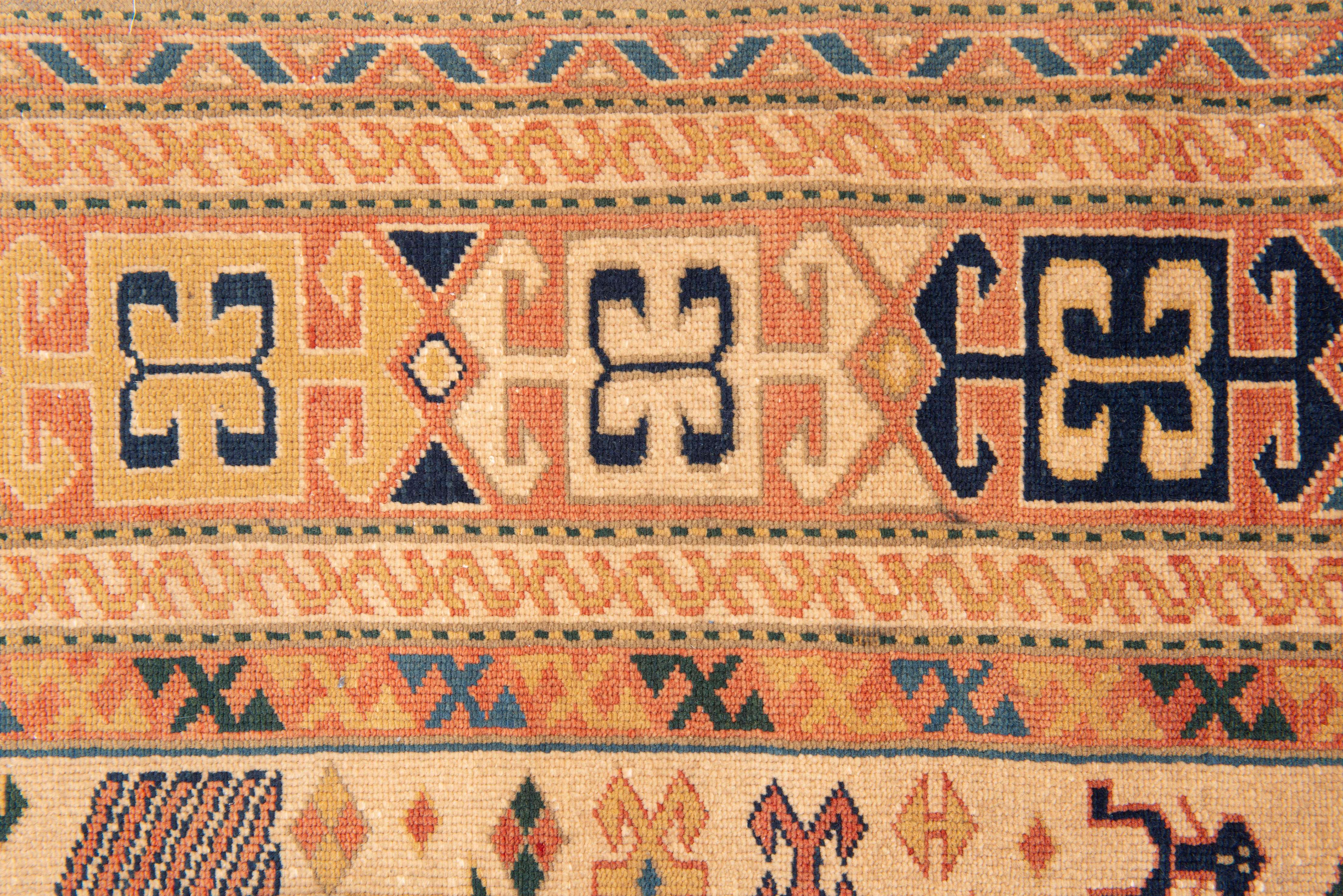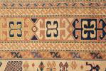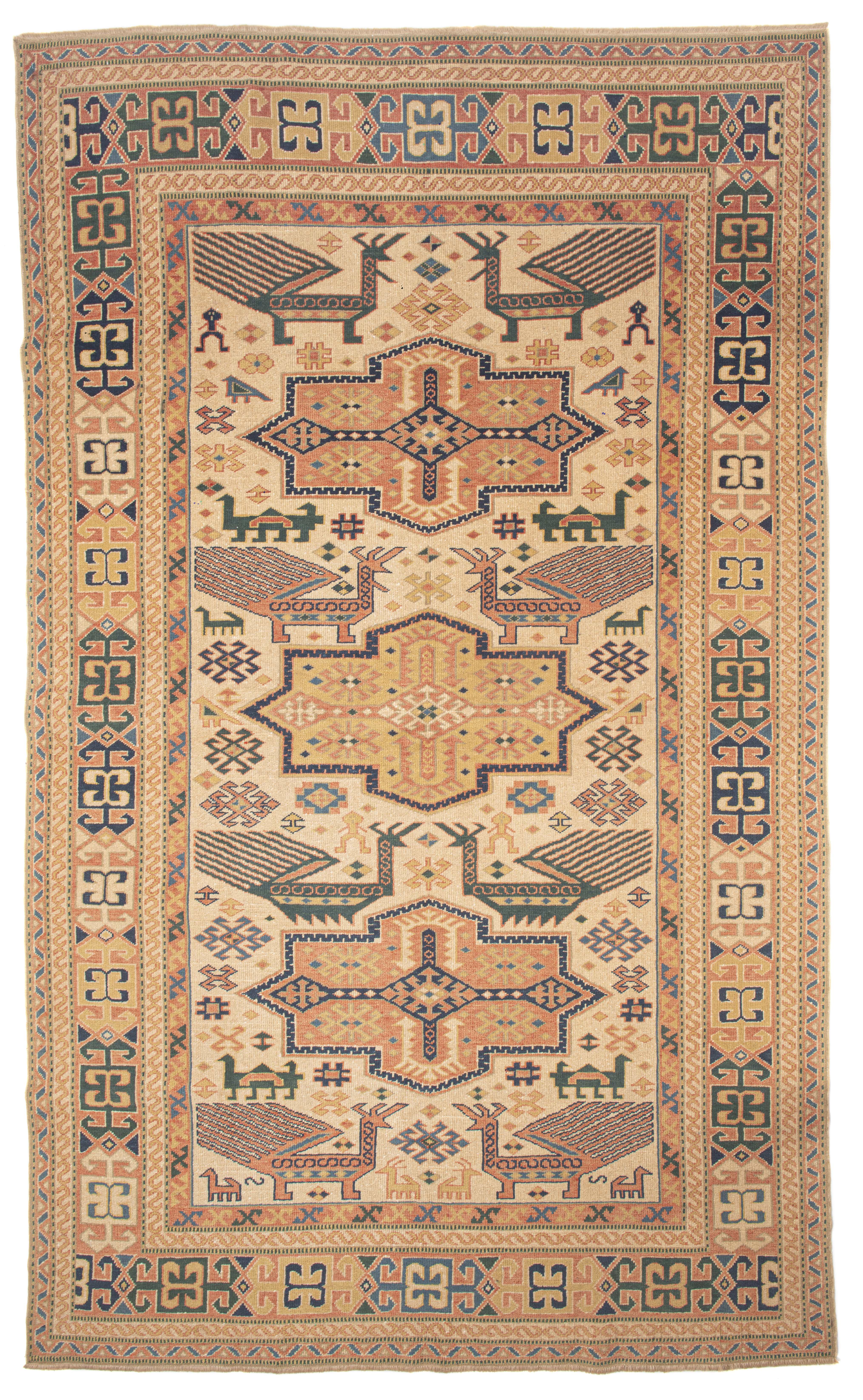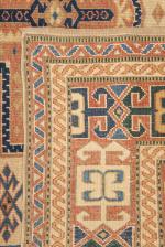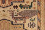 Tapis Shirvan en laine et trame de chèvre à décor central de 3 médaillons en croix en rouge noir et blanc sur champ beige, champ principal à décor d'étoiles et d'animaux sur champ beige, bordure principale à frise géométrique en noir blanc et beige sur champ brique. Antique