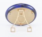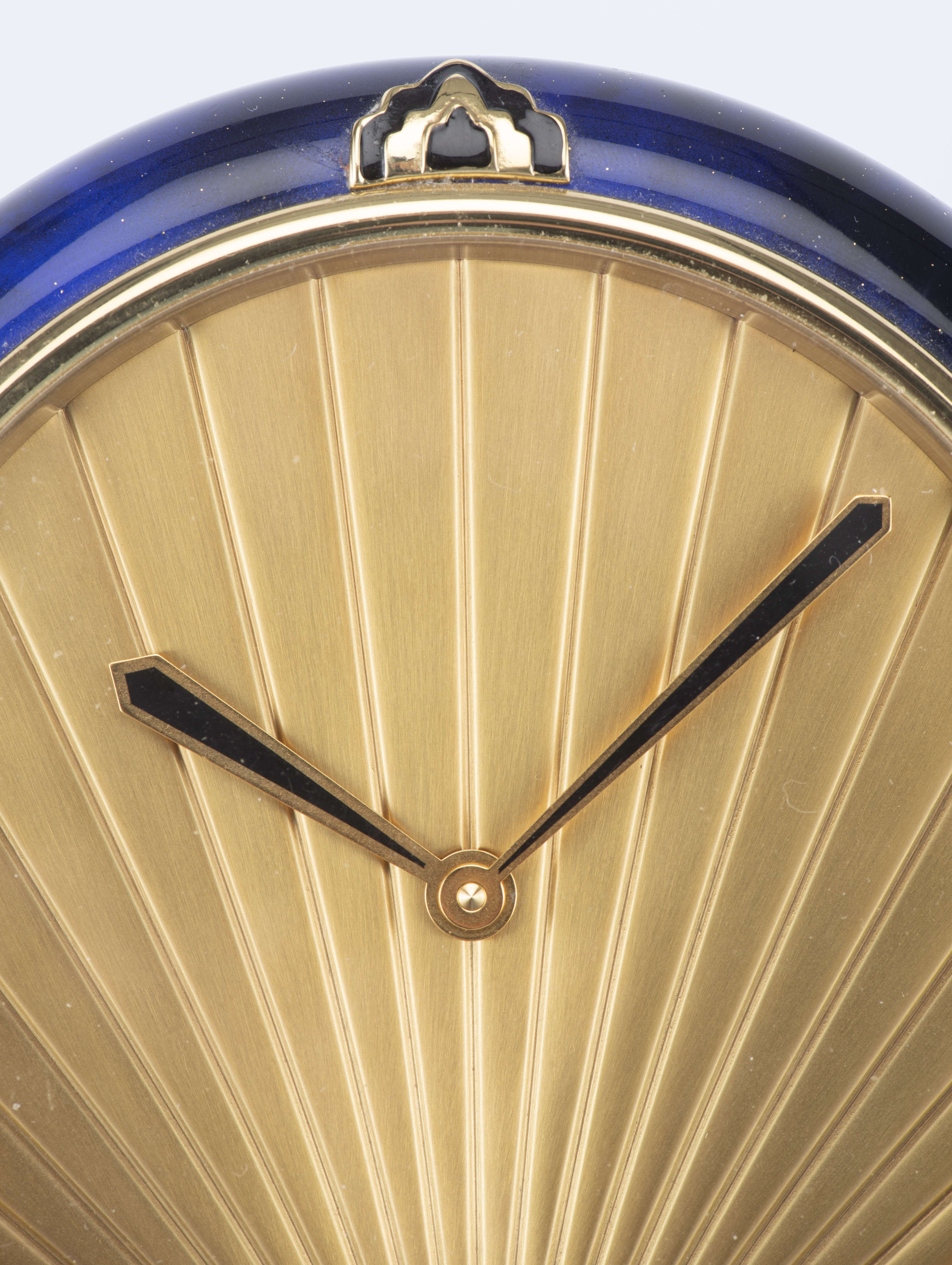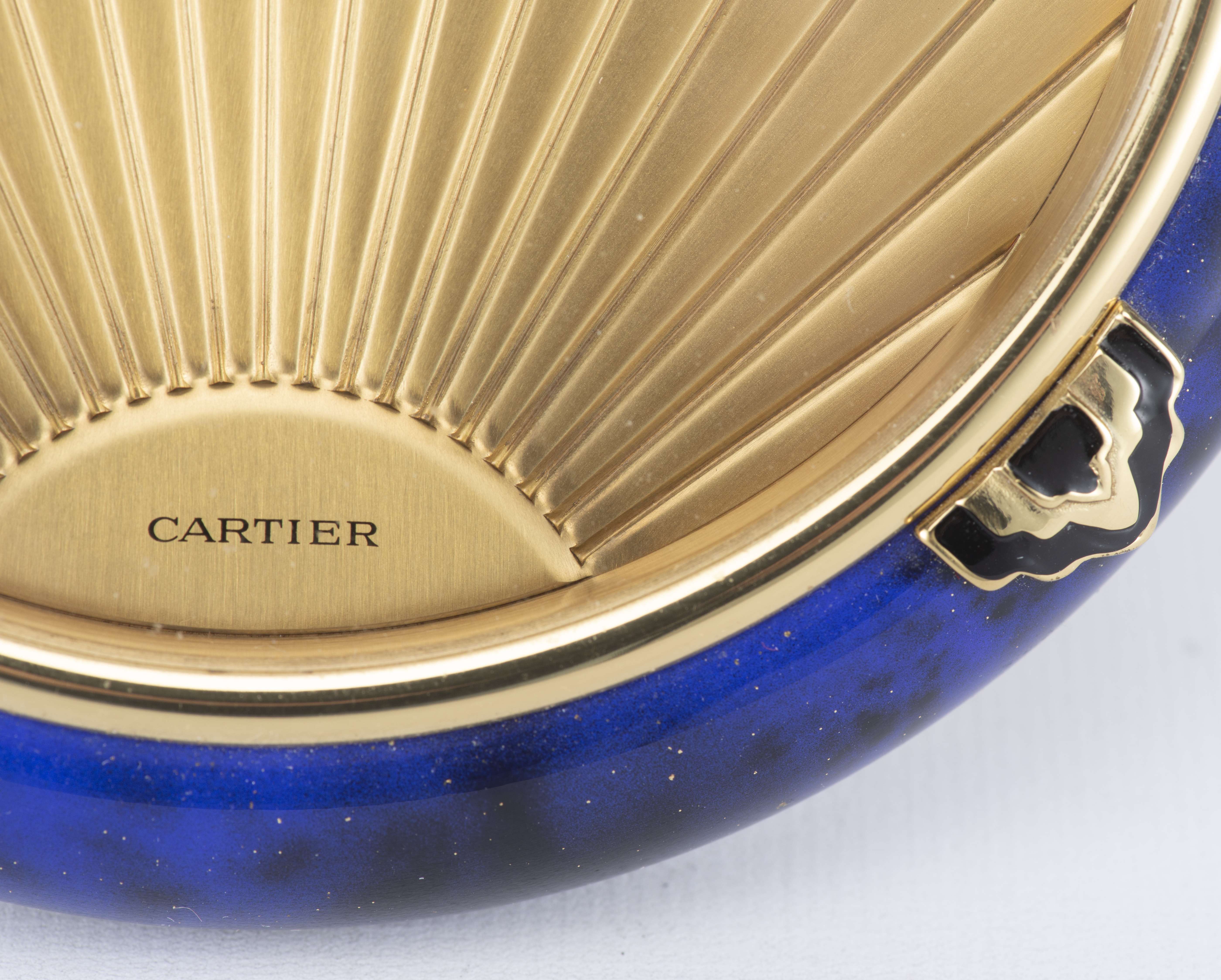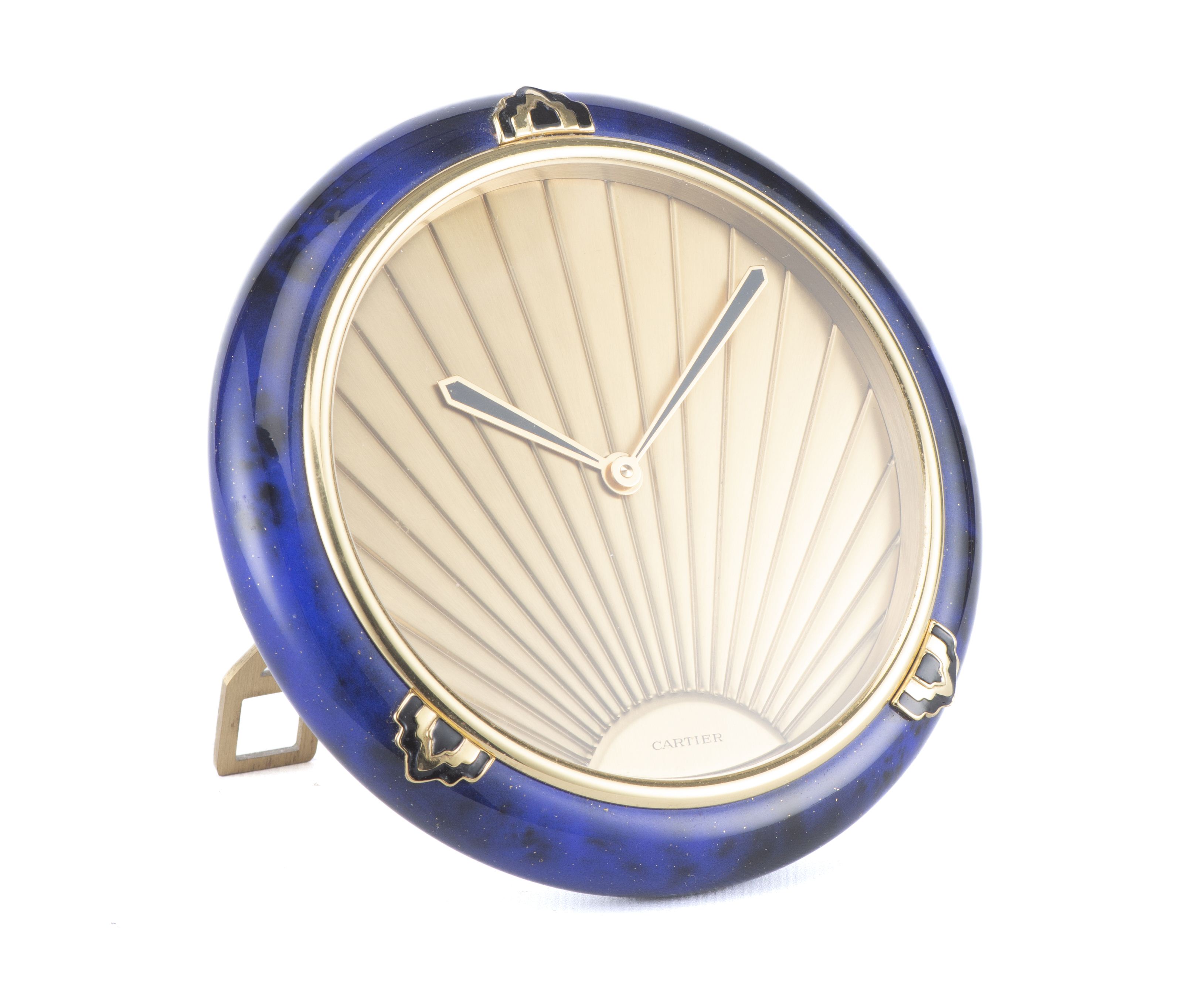 Cartier, Must de, pendulette de bureau lapis-lazuli d'inspiration Art-déco en métal doré à cadran doré muet à lignes rayonnantes depuis 6h, où il est inscrit Cartier, aiguilles "glaive" émaillées noires et or. Support chevalet en laiton. Lunette laquée Lapis à 3 cabochons émaillés noir et or. Mvt: calibre et remontage à quartz signé. Circa 1980.
