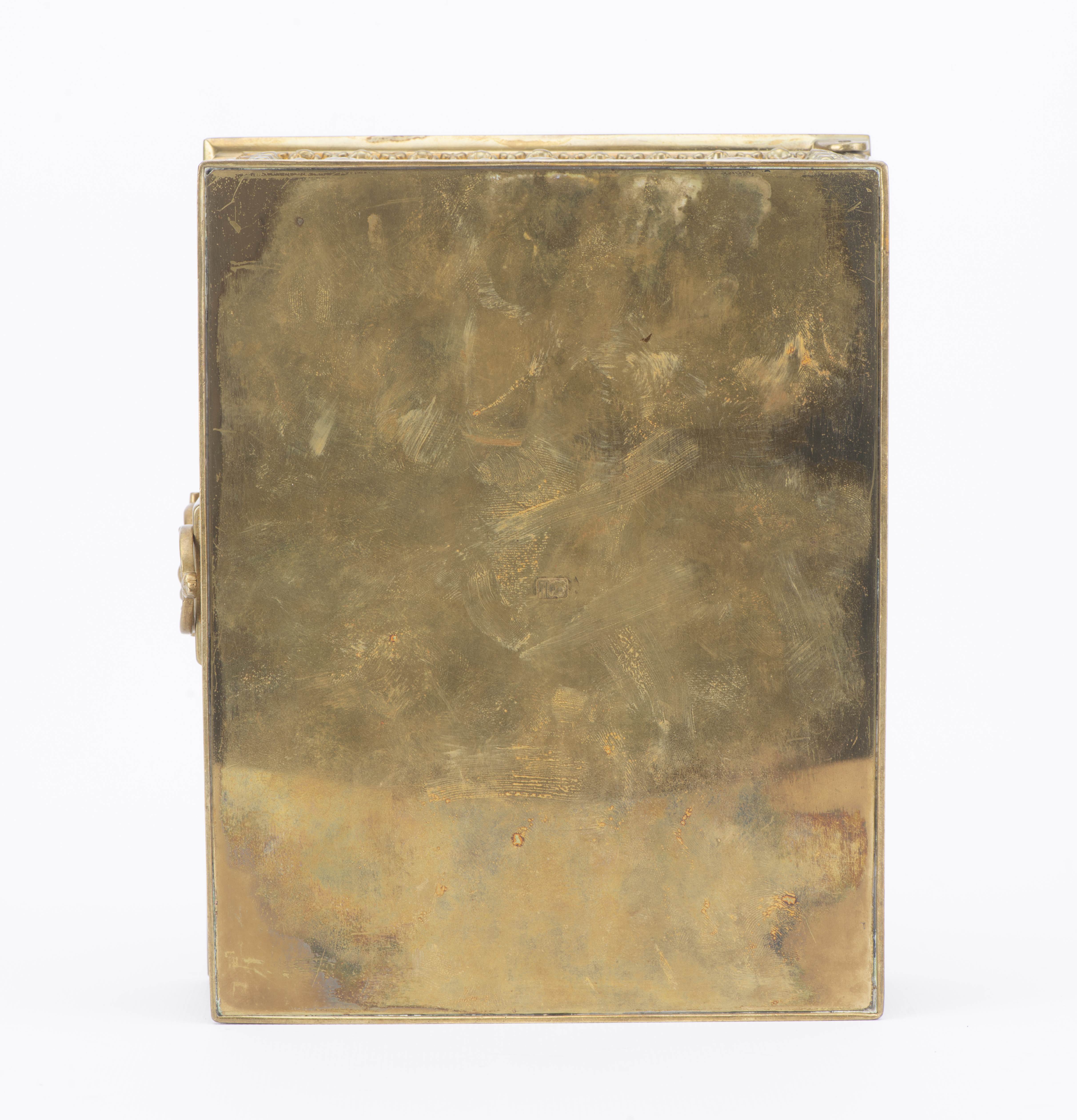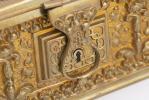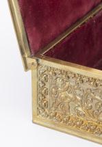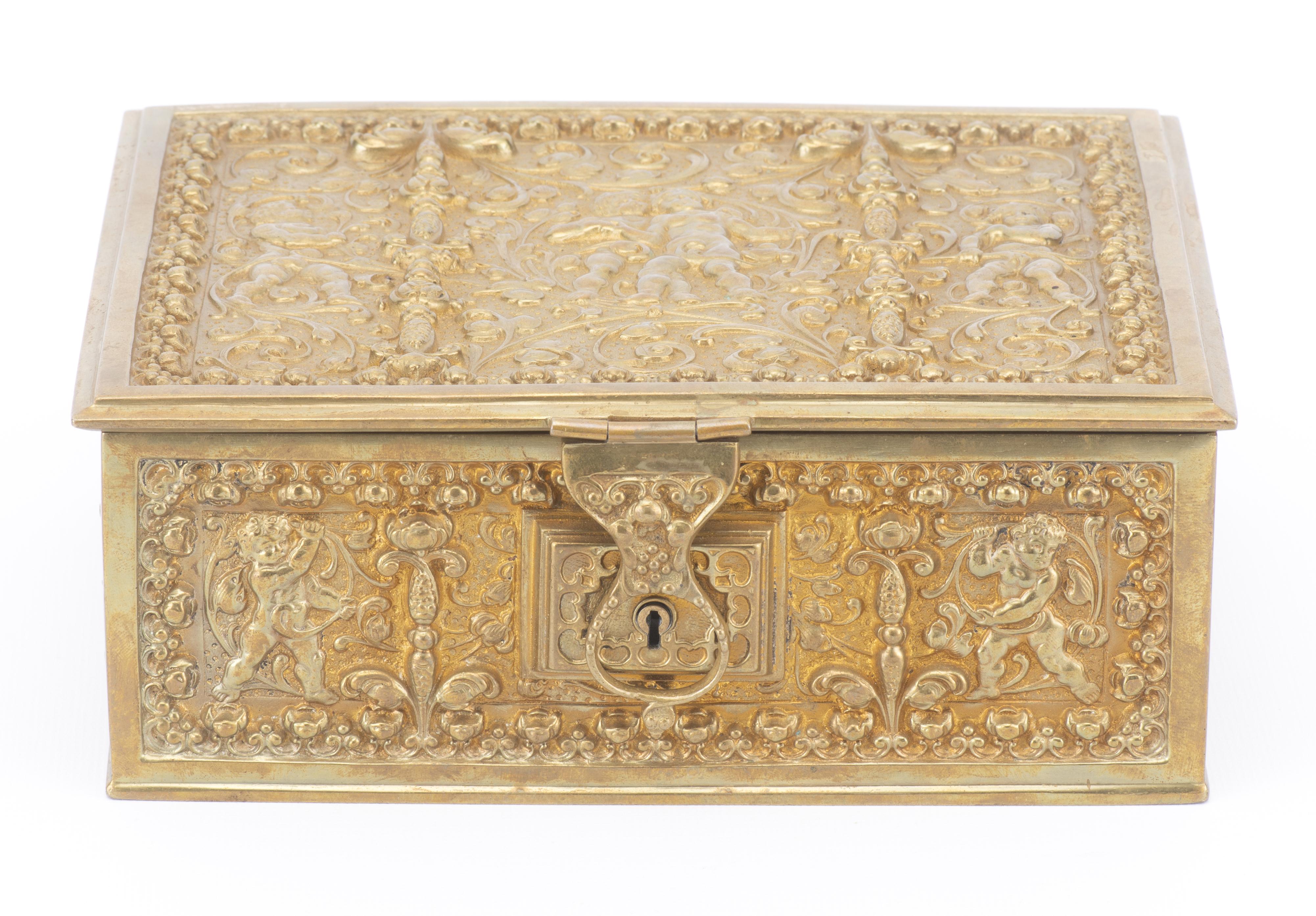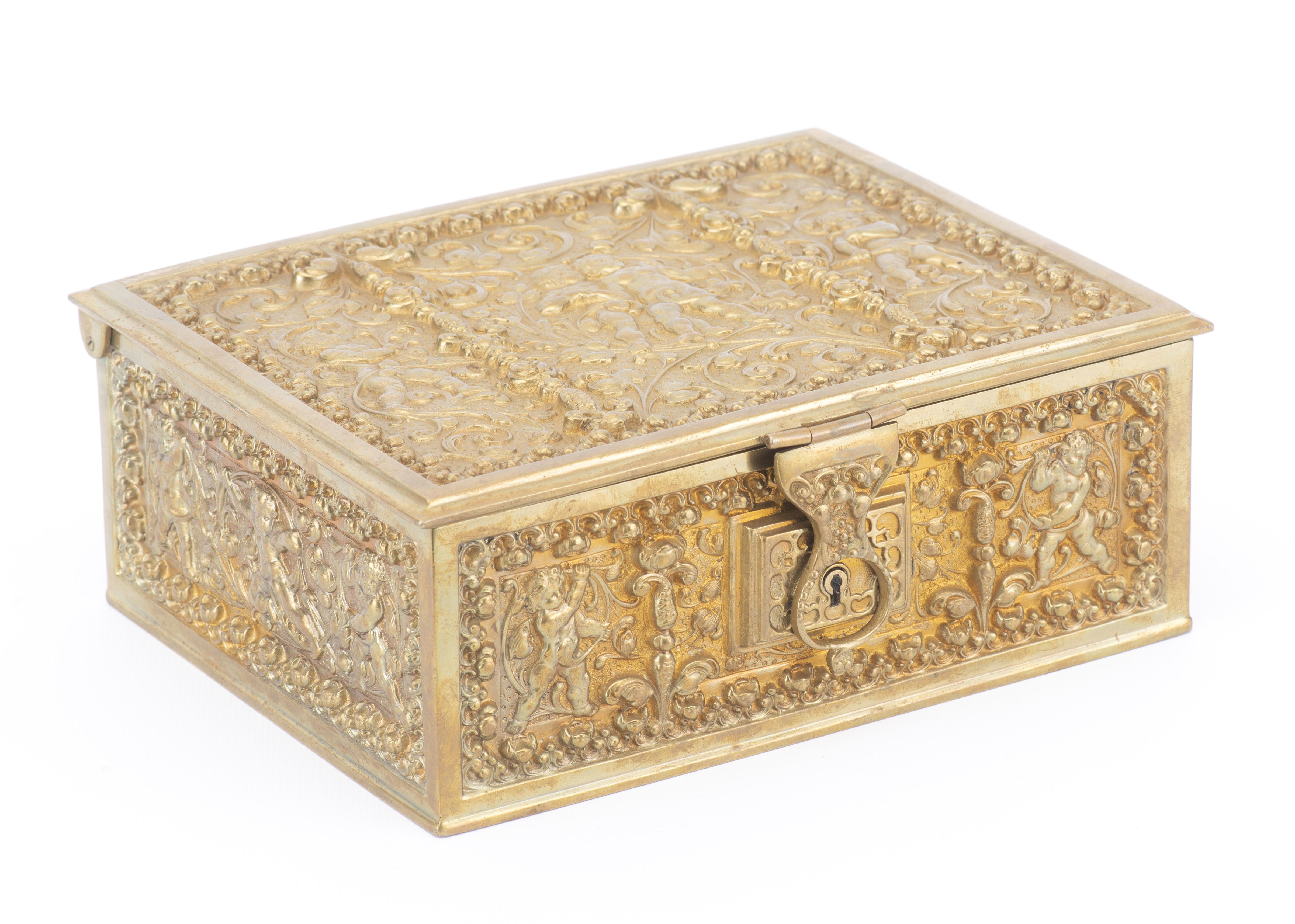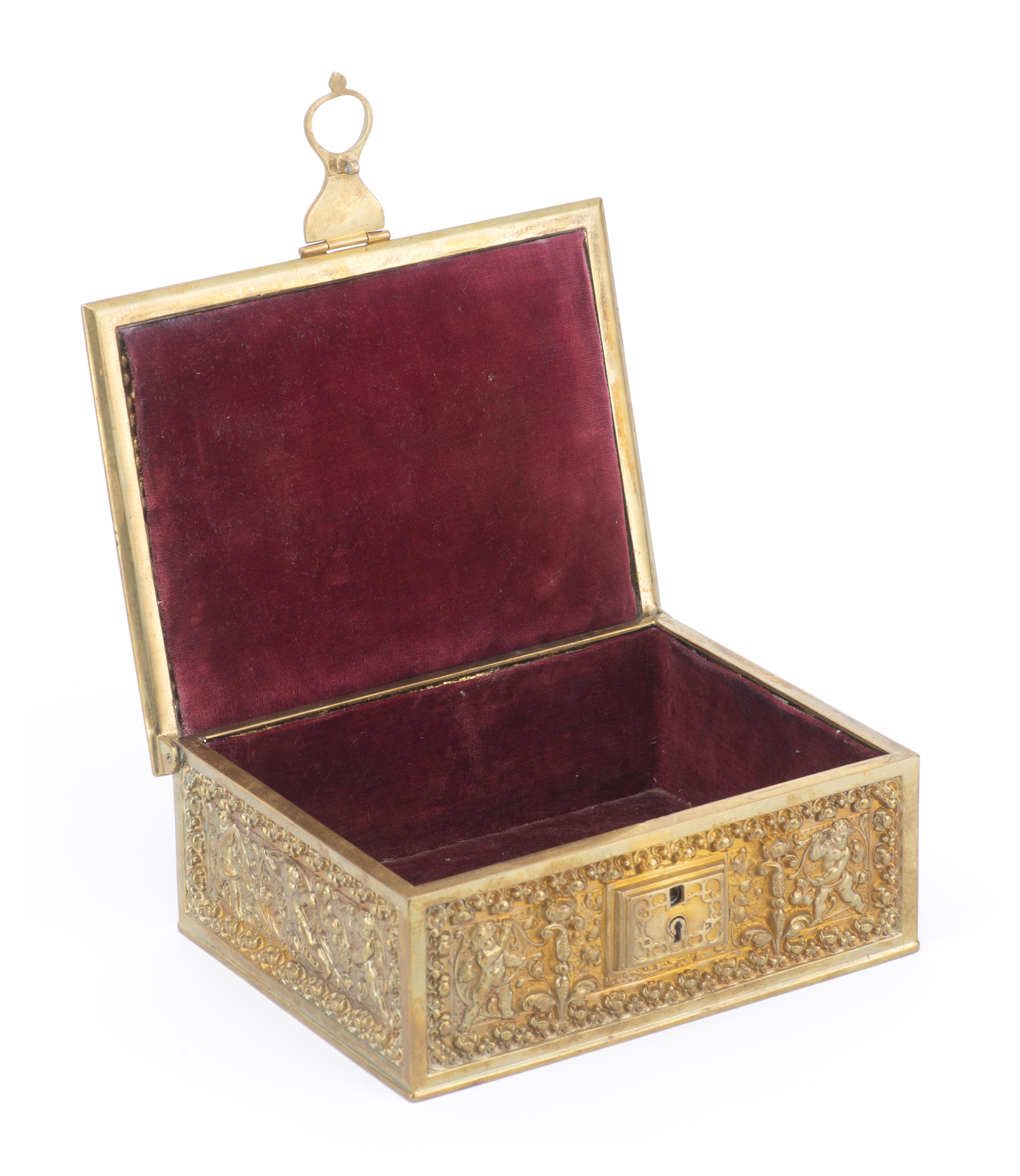 Boîte rectangulaire en laiton doré de style Renaissance à décor de putti, fleurs et ornements, intérieur en velours rouge. Sans clef.