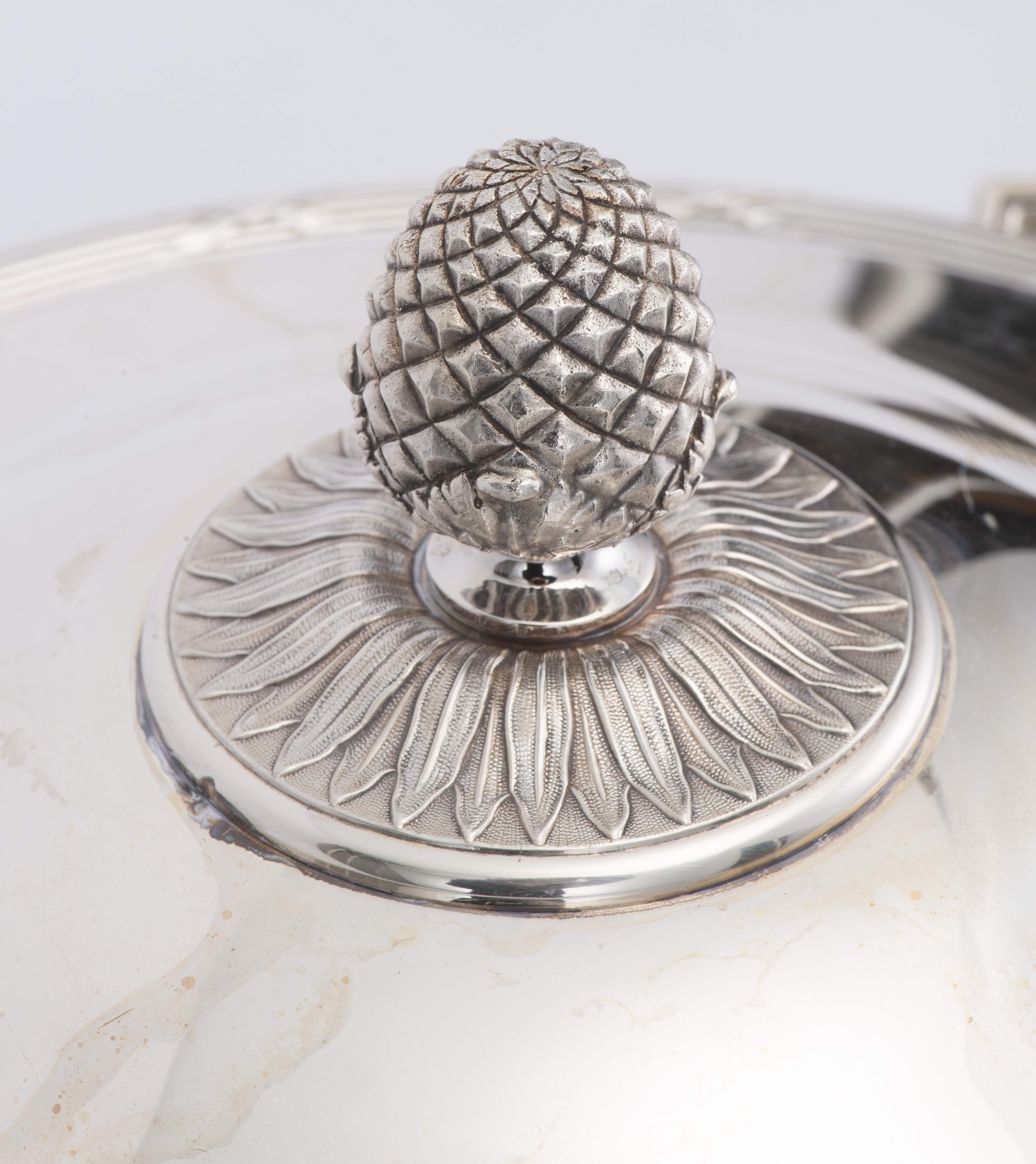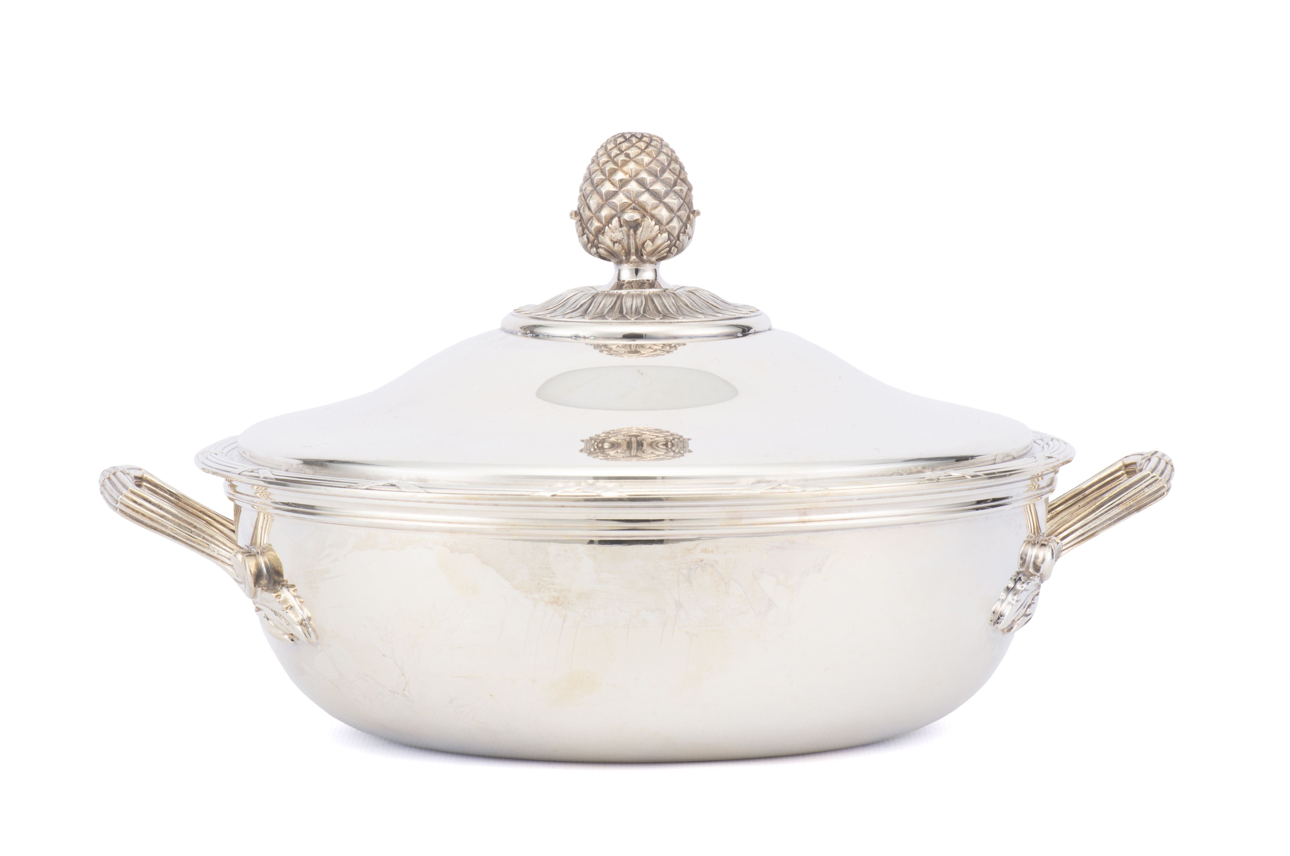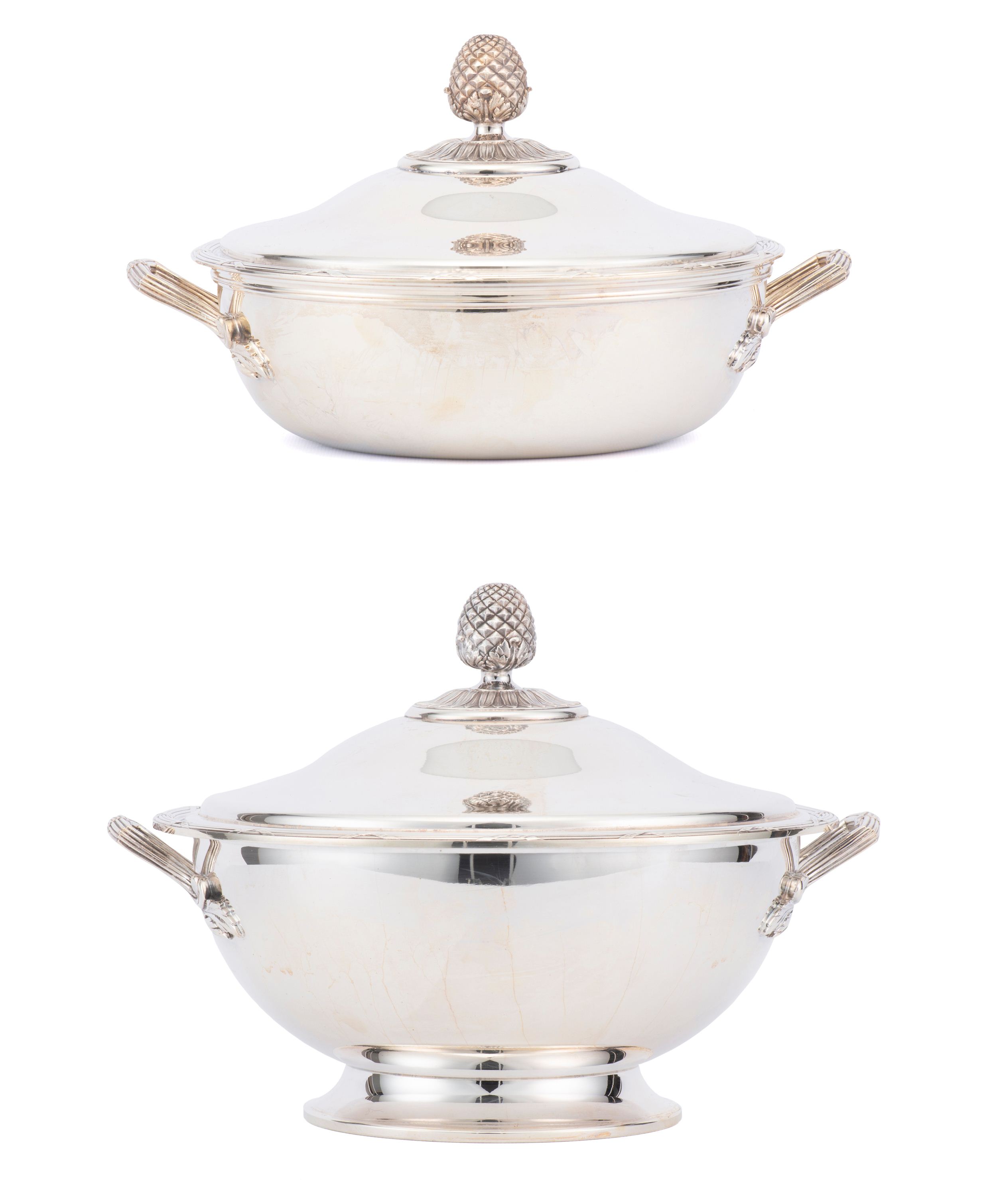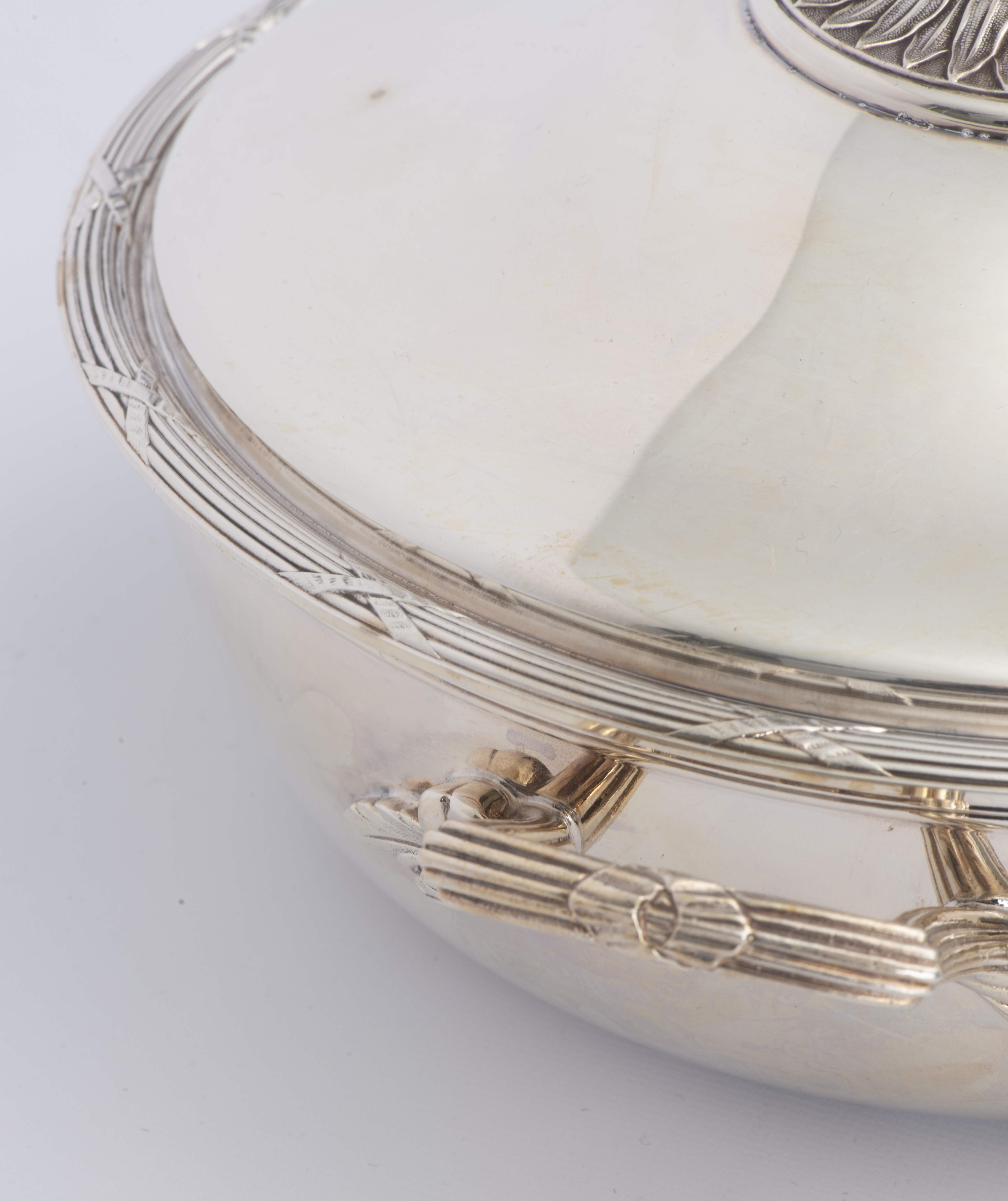 Christofle, une soupière et un plat creux couvert à décor de style Louis XVI, frises de rubans croisés, prises des couvercles en forme de pomme de pin.