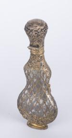 - flacon à sel avec décor en argent ajouré de motif végétal et rubans et emblème de l'automne. H. 10.5 cm