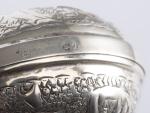 - 2 bougeoirs en argent ronds qui se fermes en forme de boîte ronde, à décor de caractère hébraïque en argent repoussé. H. 3.2x6 cm