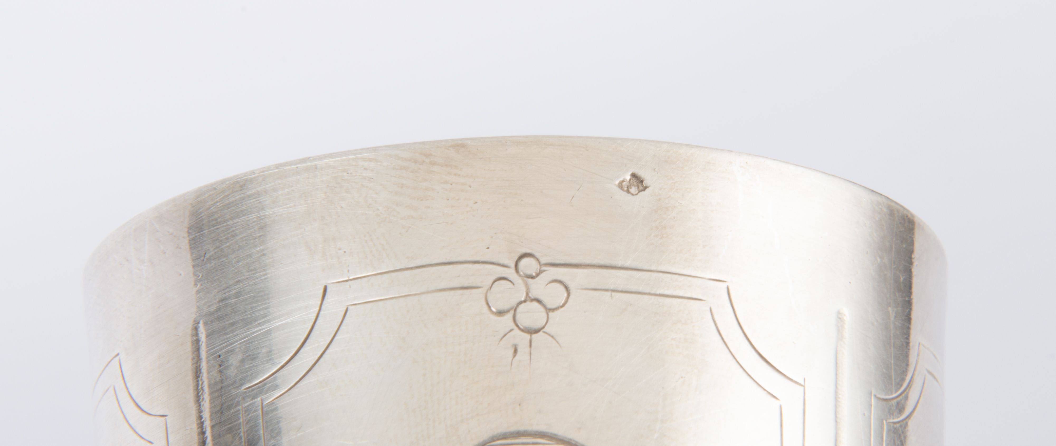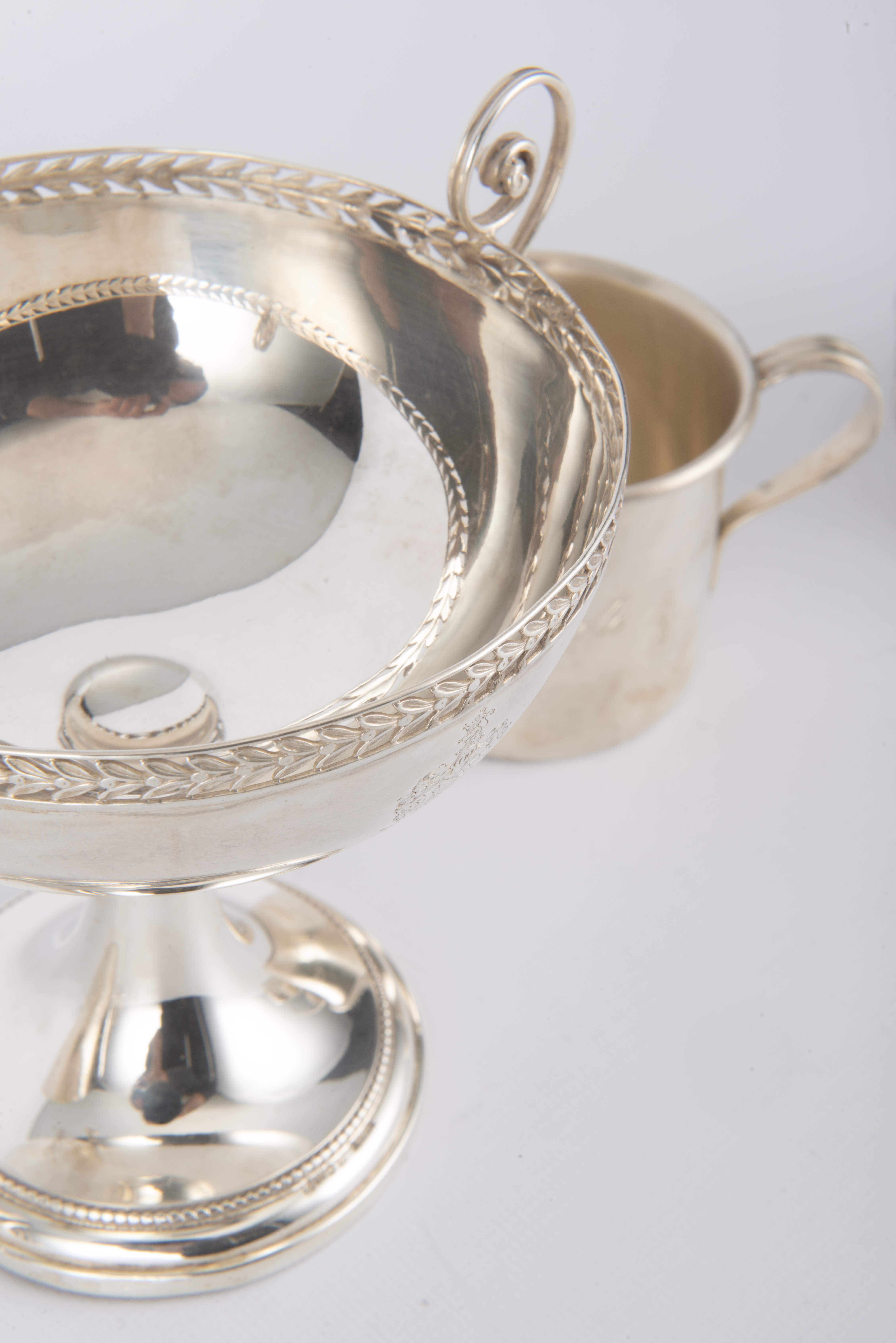 - 2 timbales, 1 en argent français 1er titre et une second à une anse en argent .925 par Links gravée Nicole et date de naissance. H. 8 & H. 5.5 cm