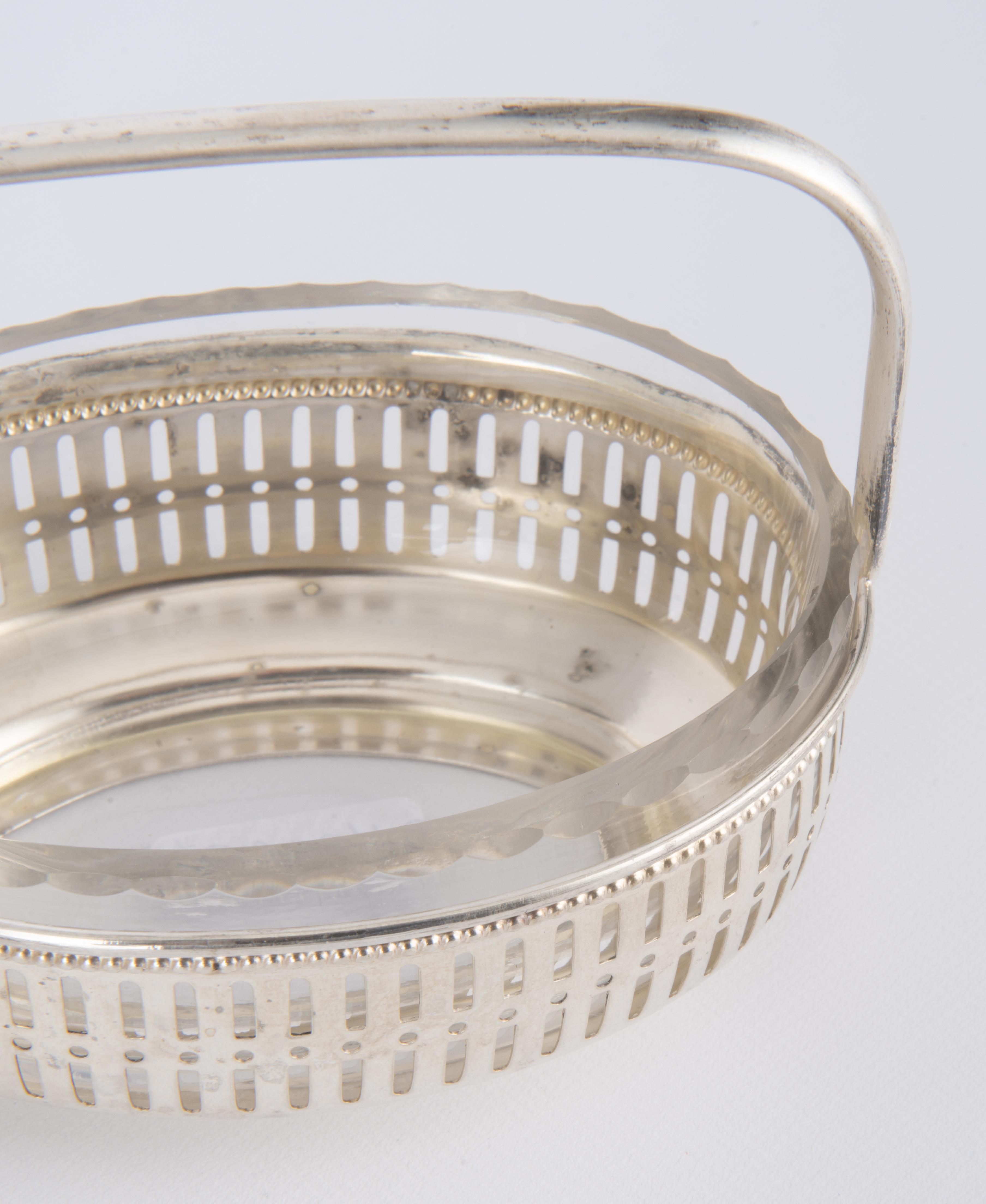 - 1 panier à une anse en argent .800, insert en verre, H. 8.3x11x8 cm