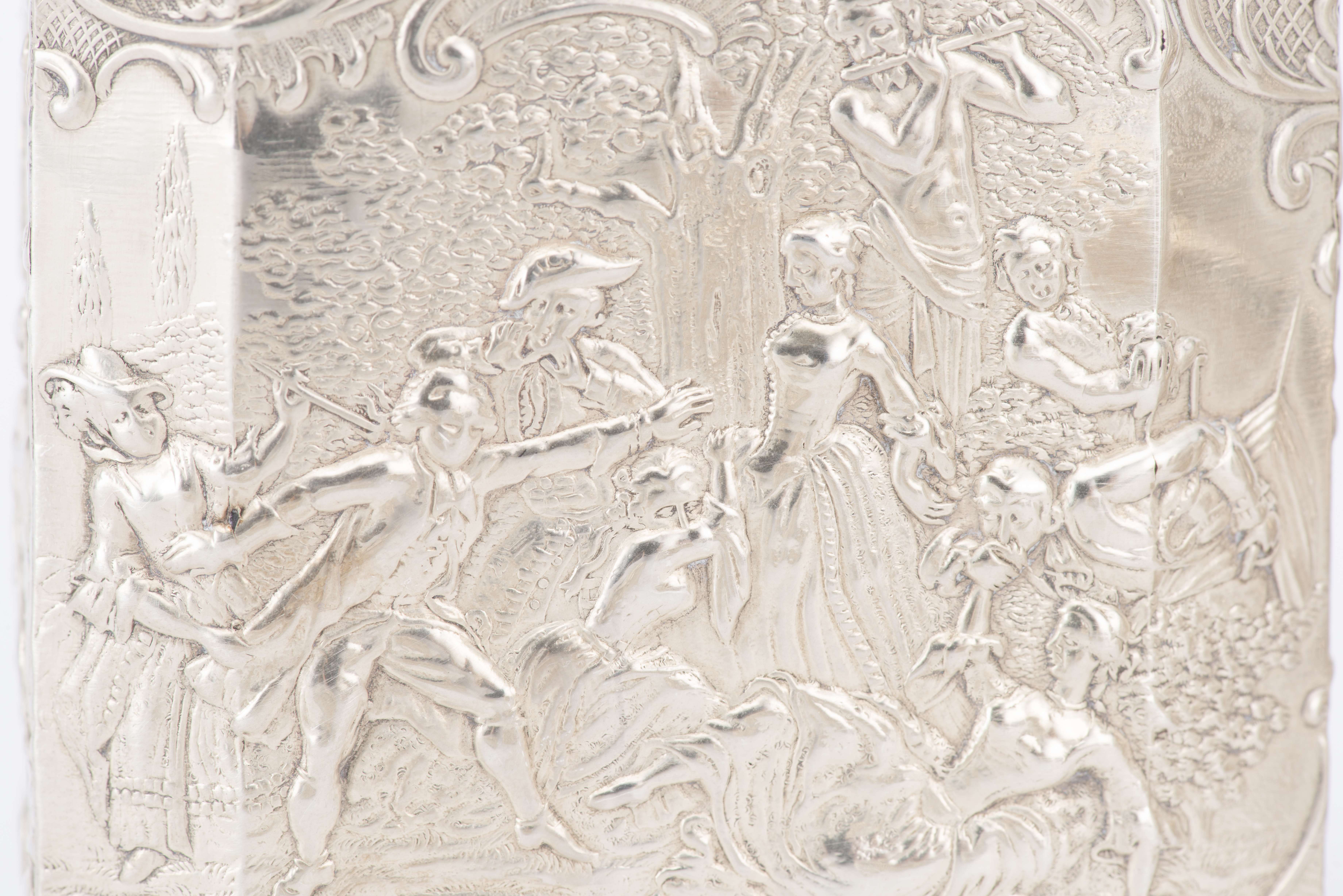 - 1 boîte en argent .800 à décor en repoussé de scène galante. H. 9.5x7.5x4 cm
