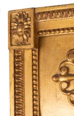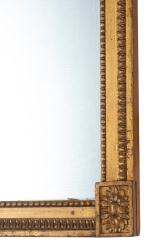 Miroir trumeau de style Louis XVI du XIXe à cadre en bois doré et fronton à motif végétal.