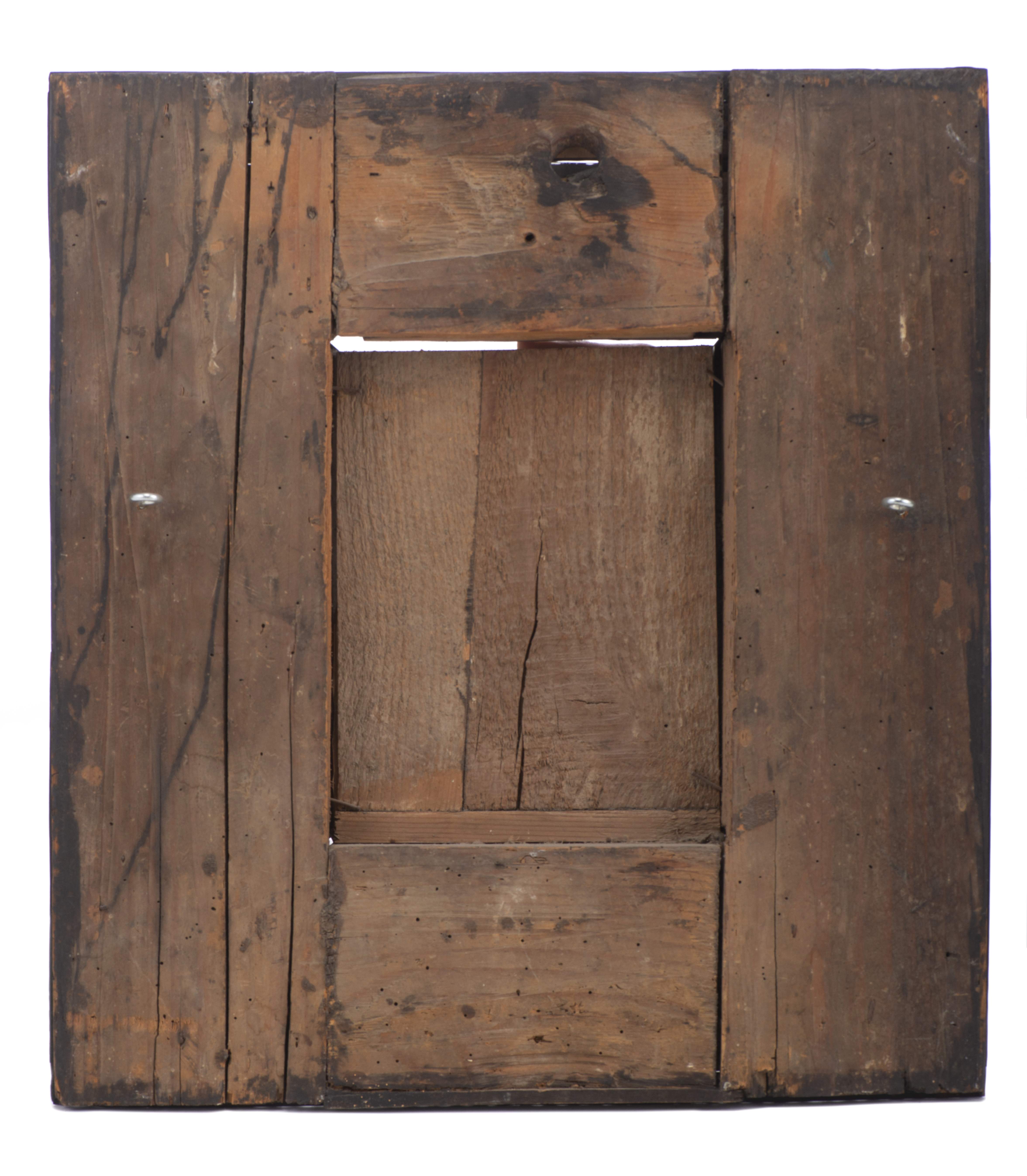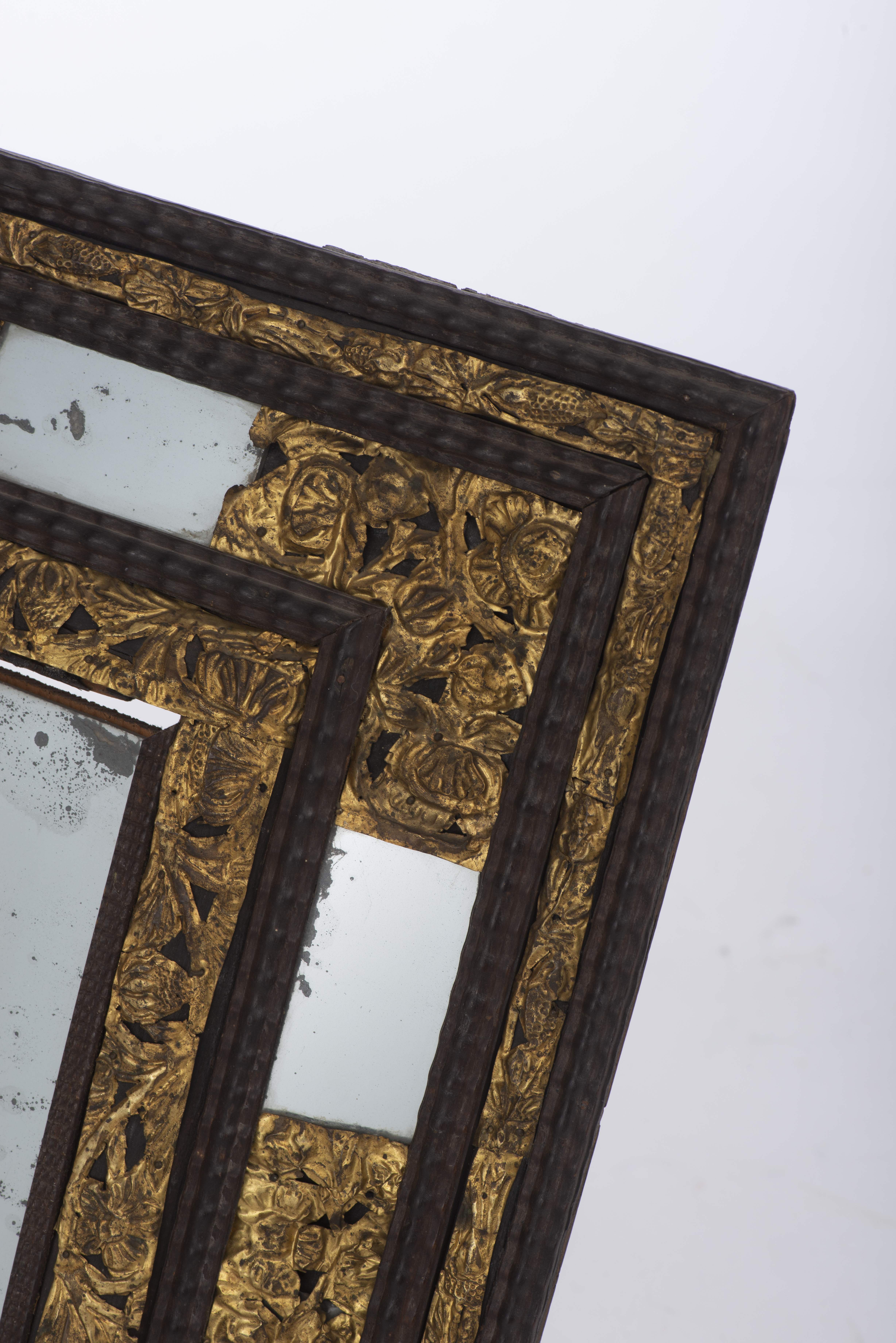 Petit miroir hollandais rectangulaire à décor de baguettes d'ébène et plaques de tombac repoussé, glace au mercure en parcloses, le tout monté sur un bâti en sapin.