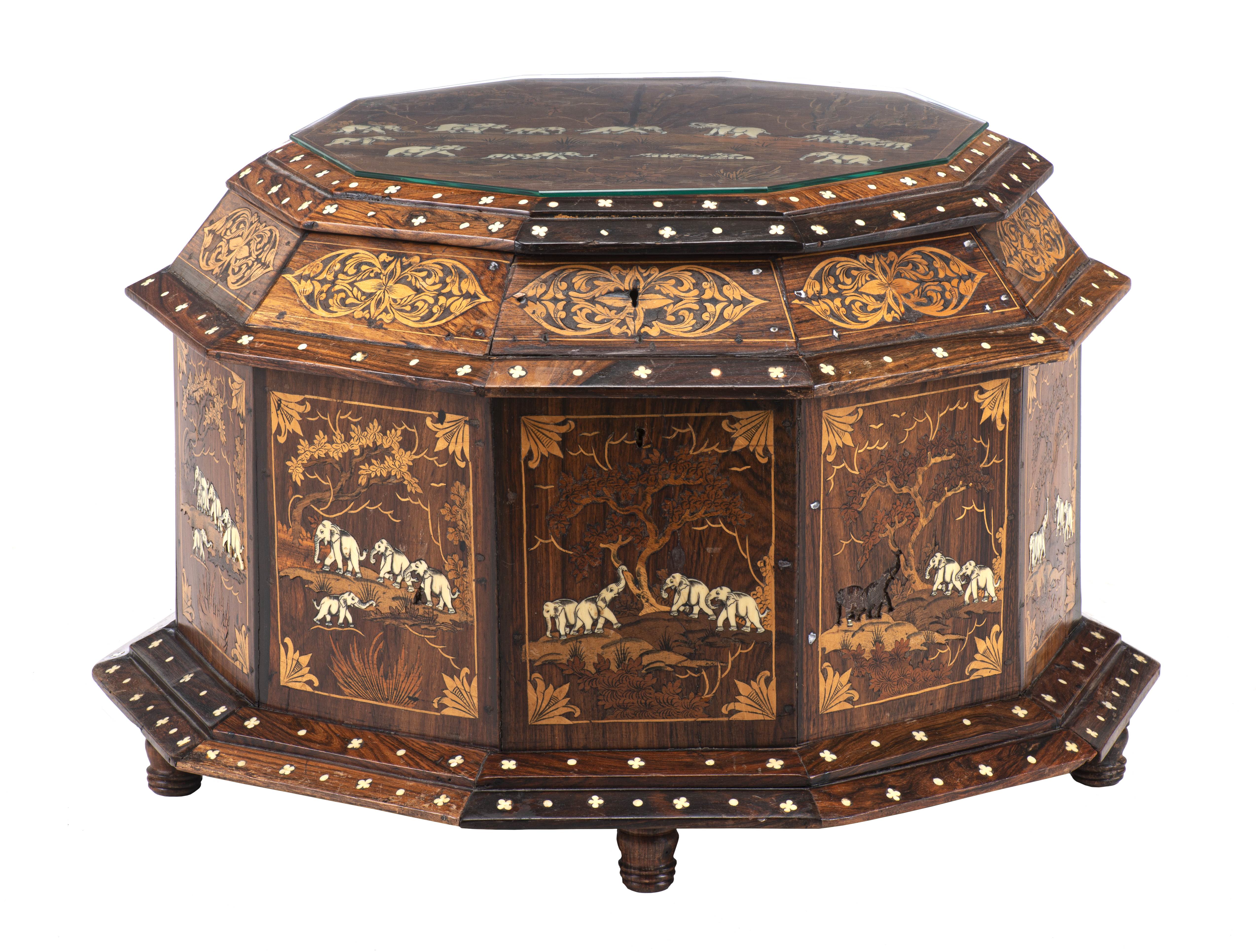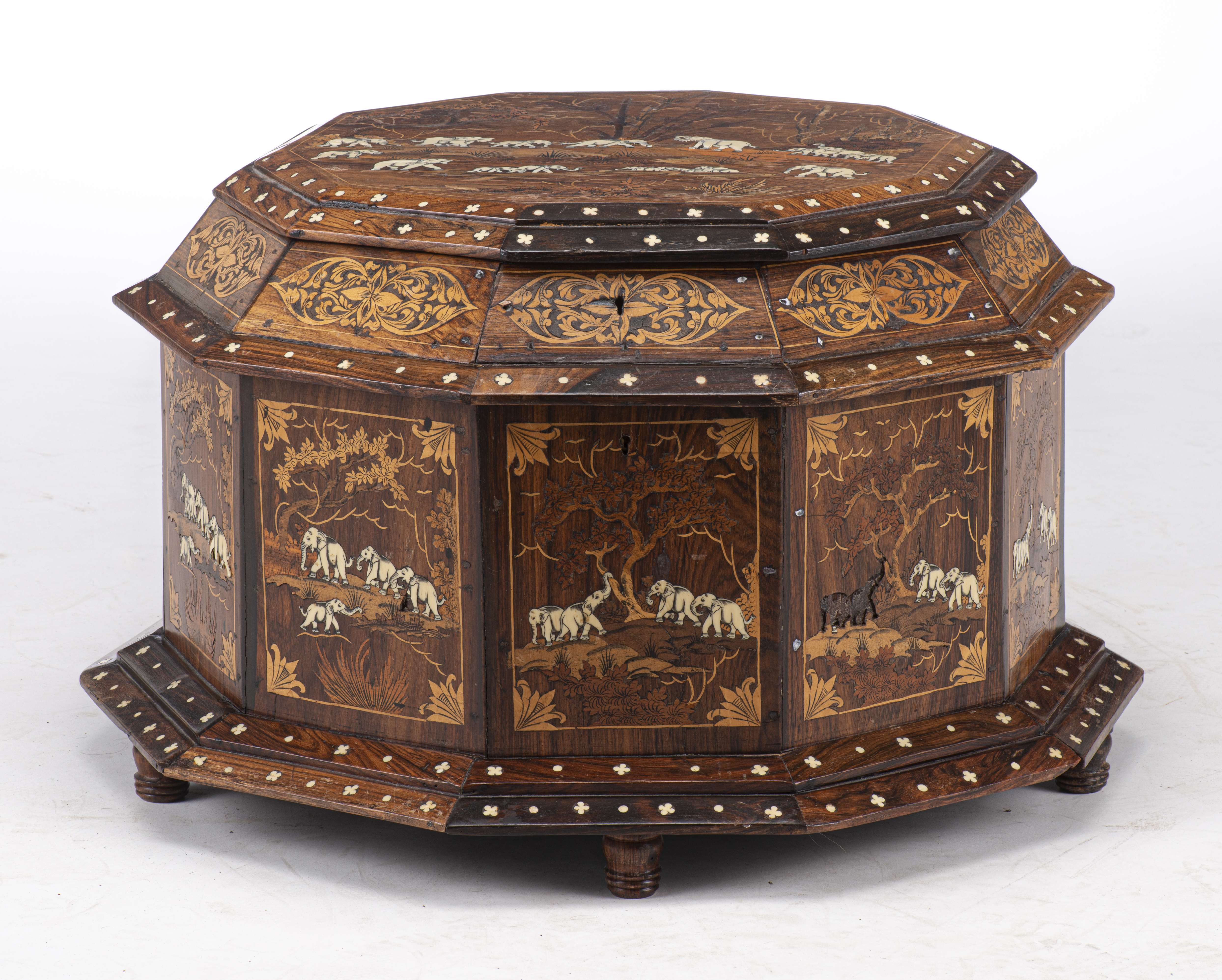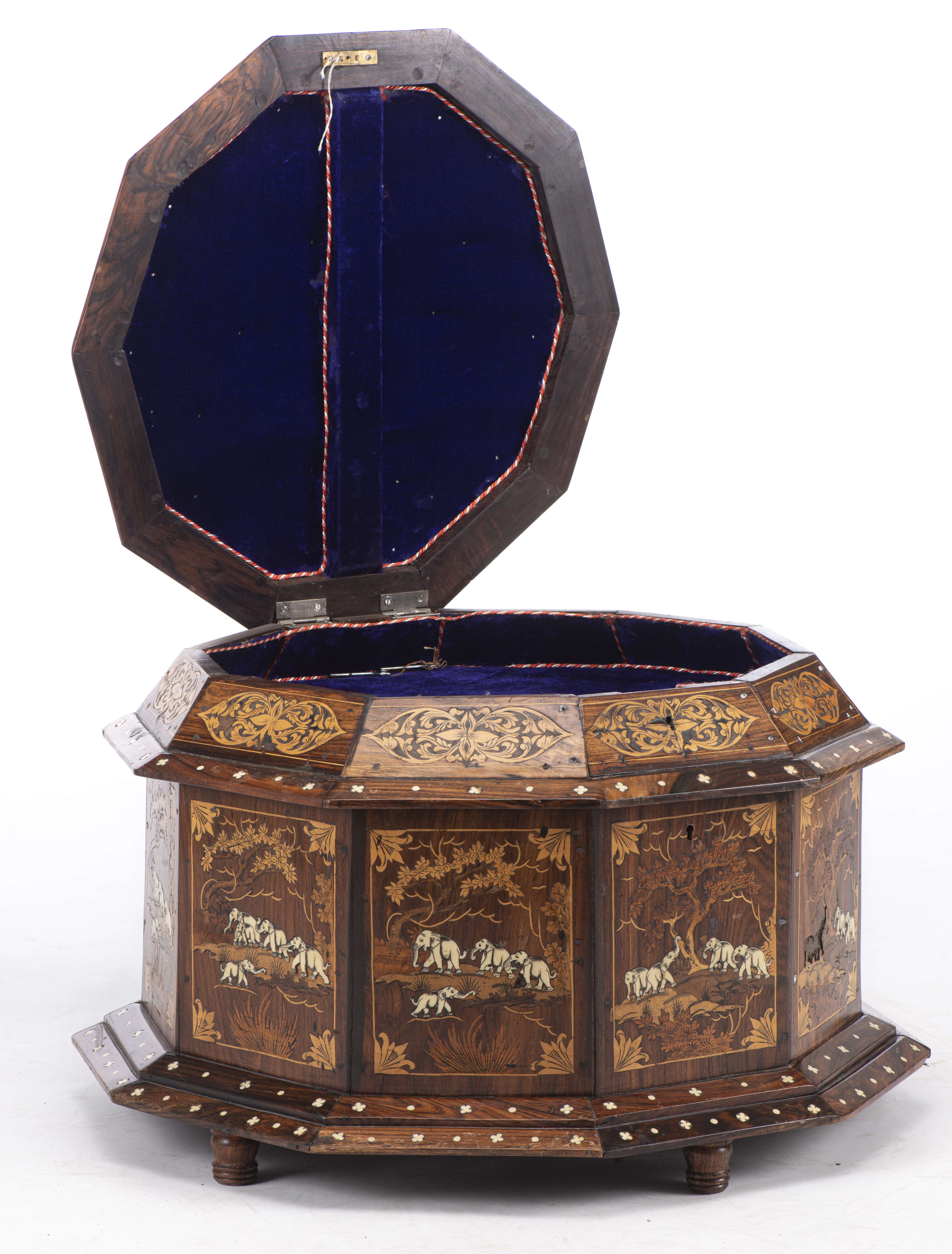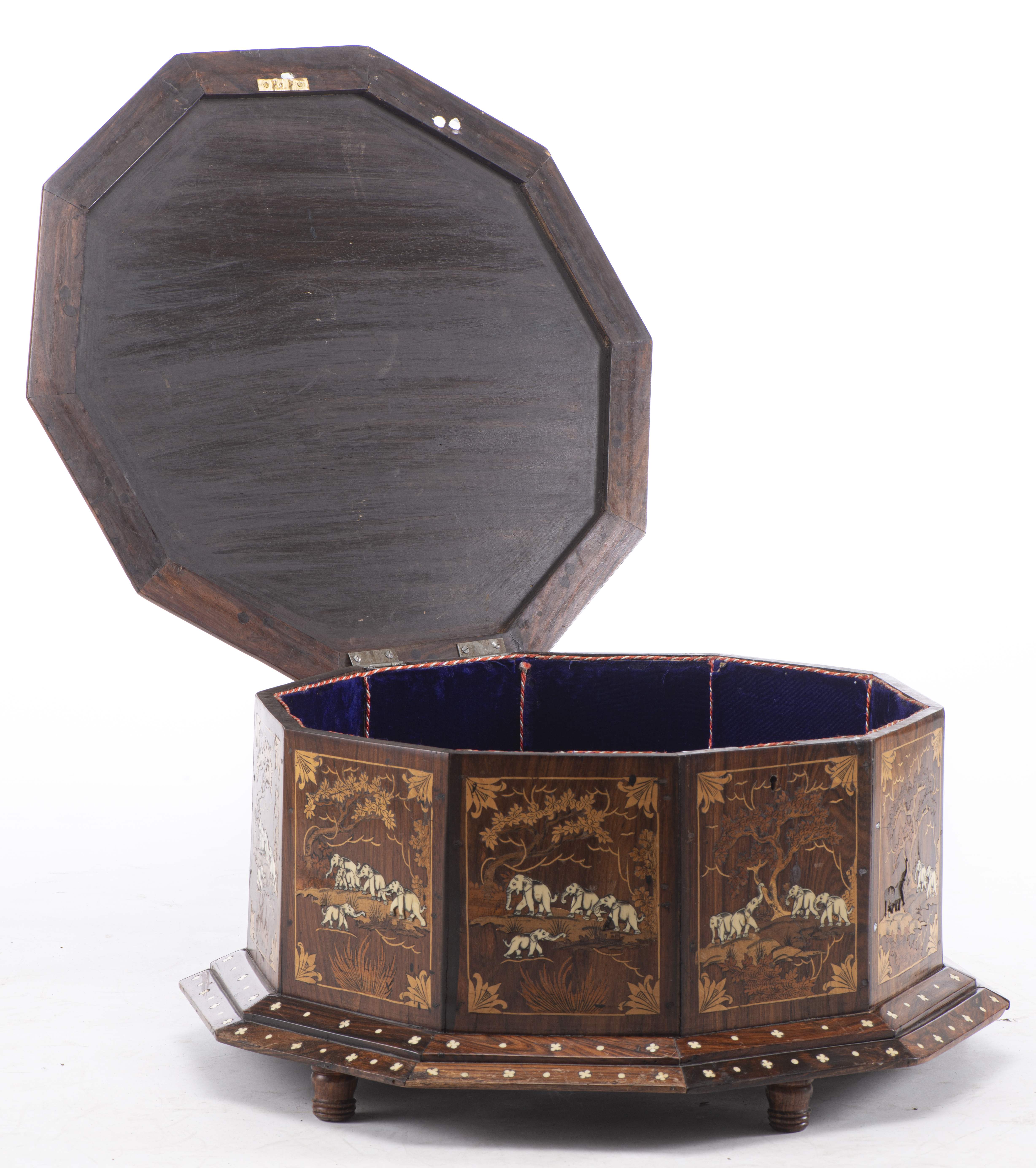 Coffre décagonal colonial des Indes en bois de rose à décor incrusté d'éléphants en ivoire et bois clair.
