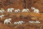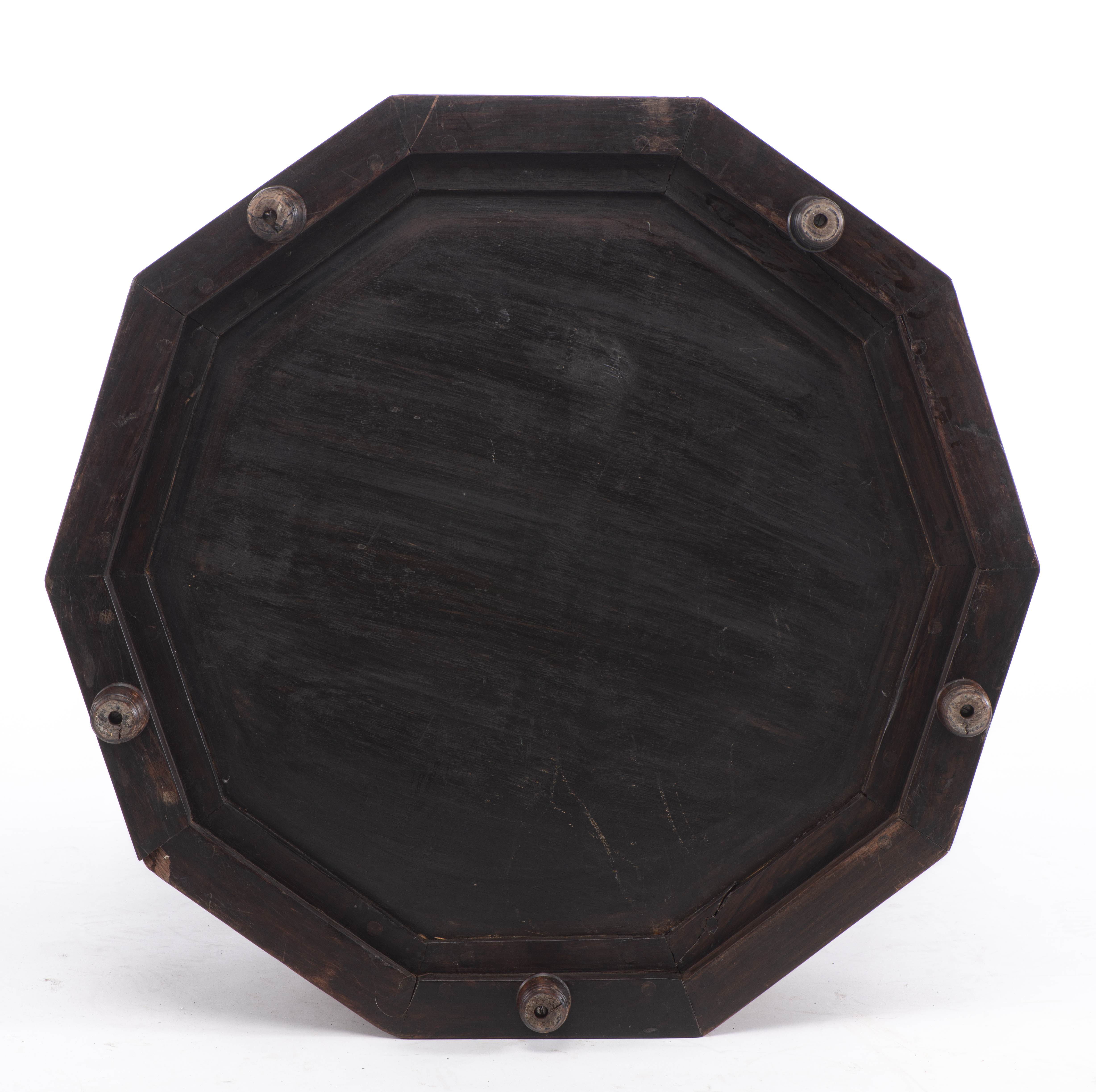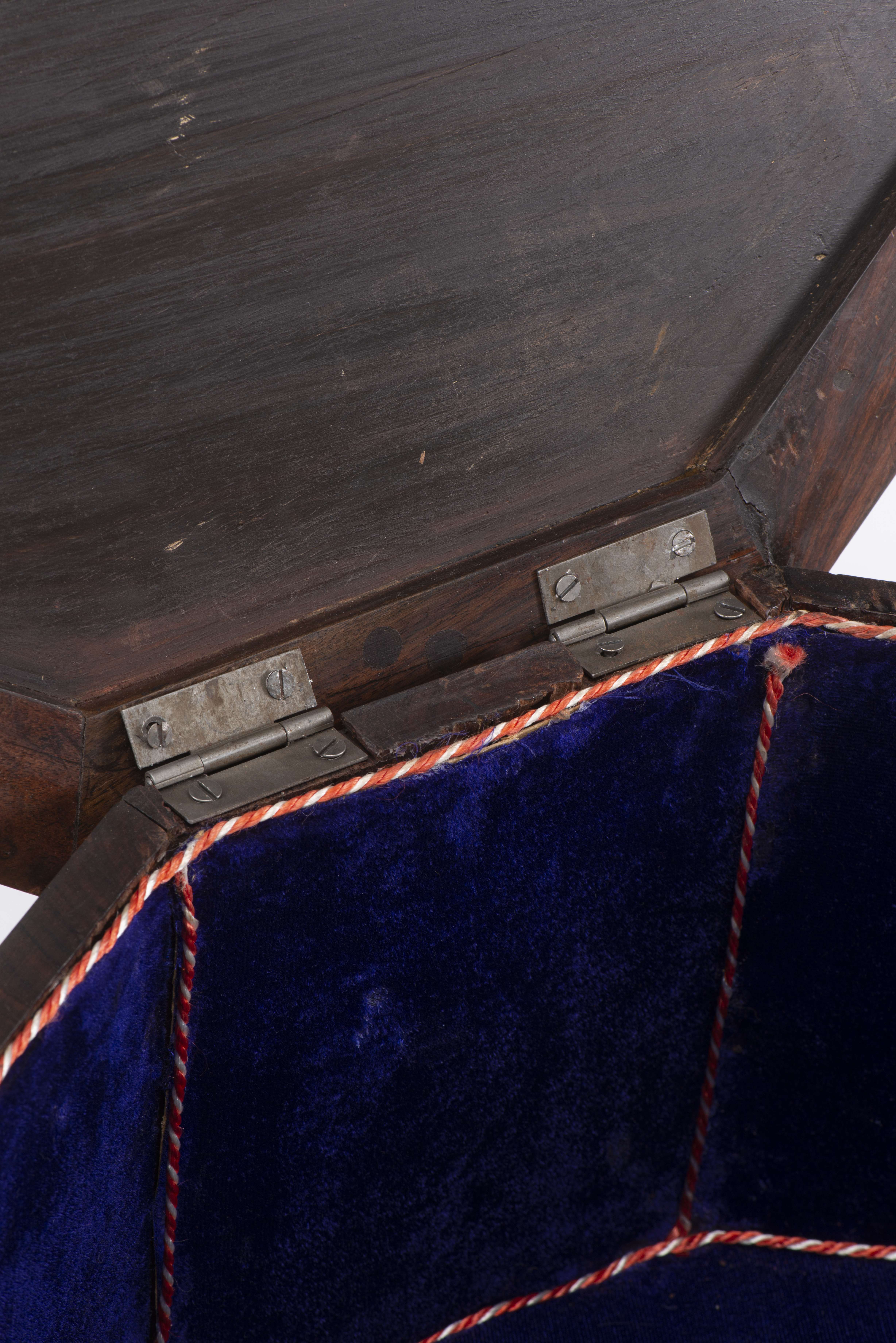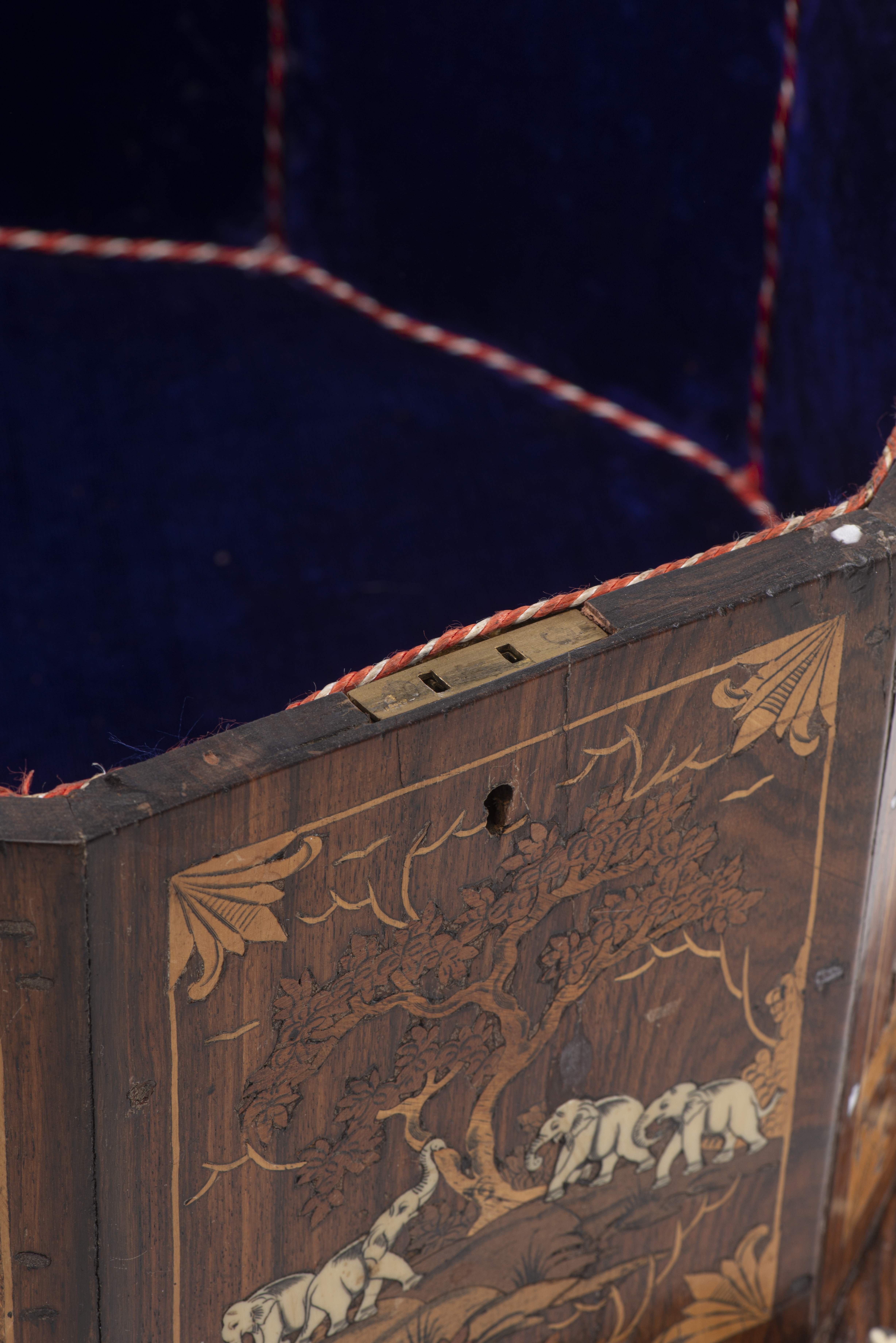 Coffre décagonal colonial des Indes en bois de rose à décor incrusté d'éléphants en ivoire et bois clair.