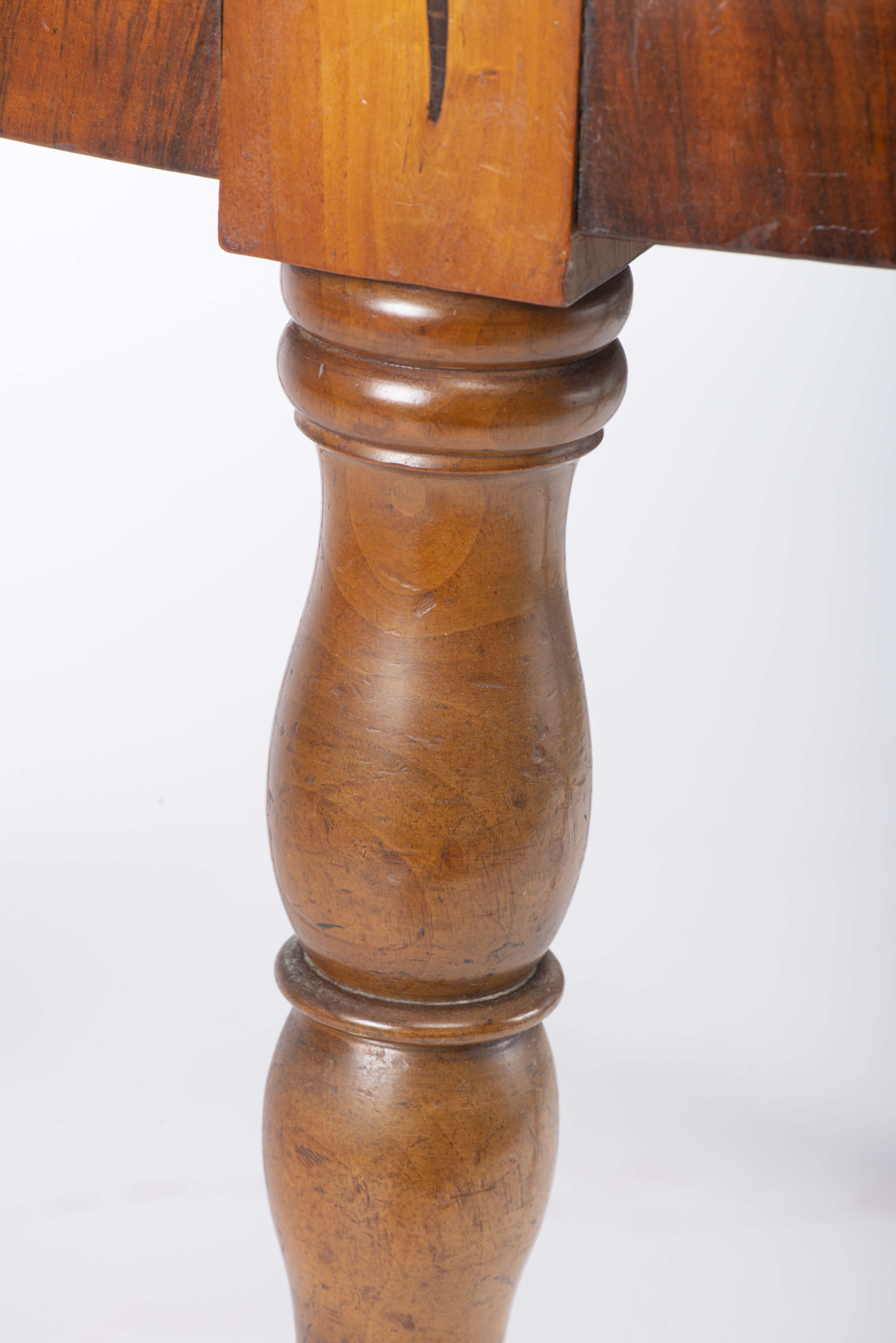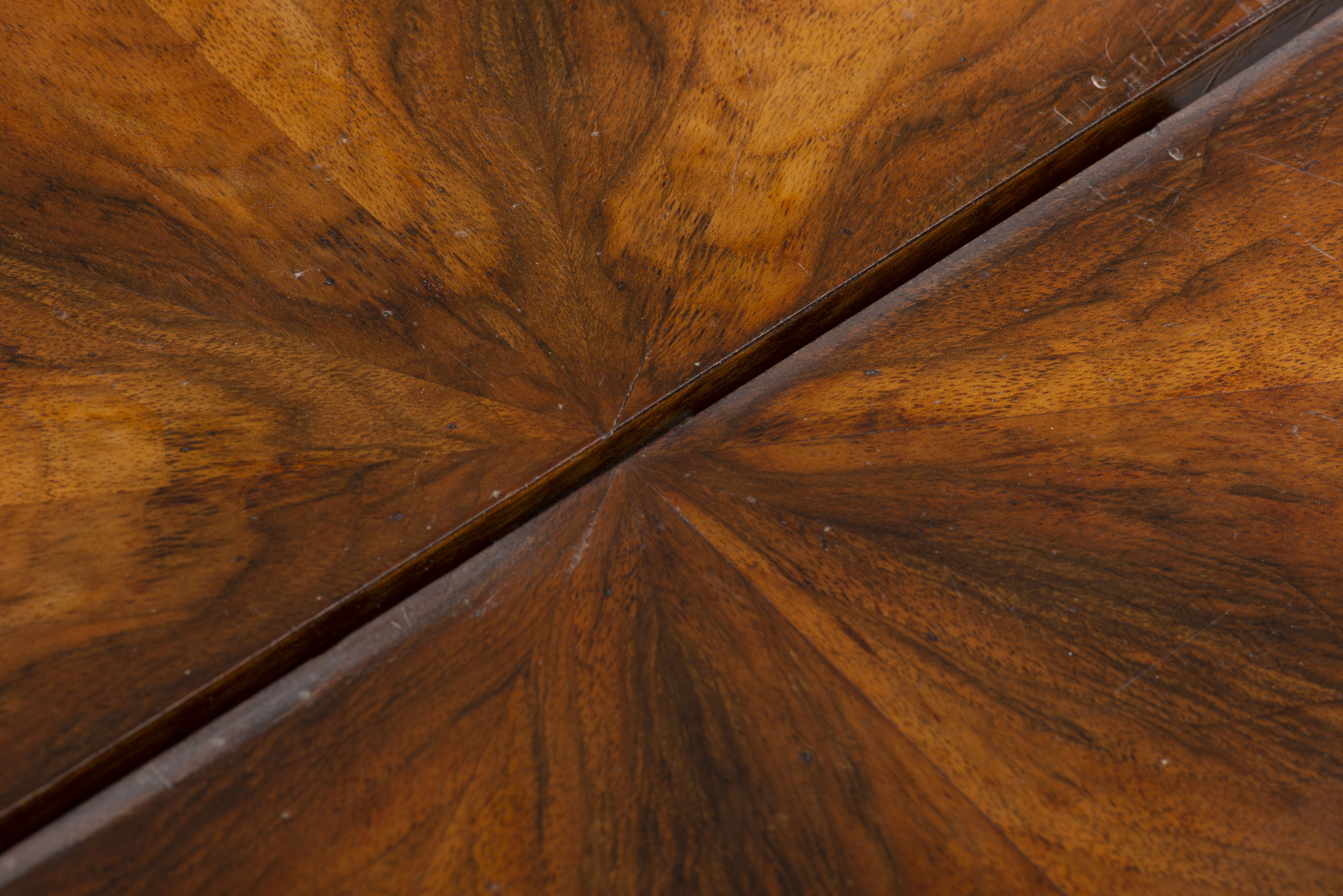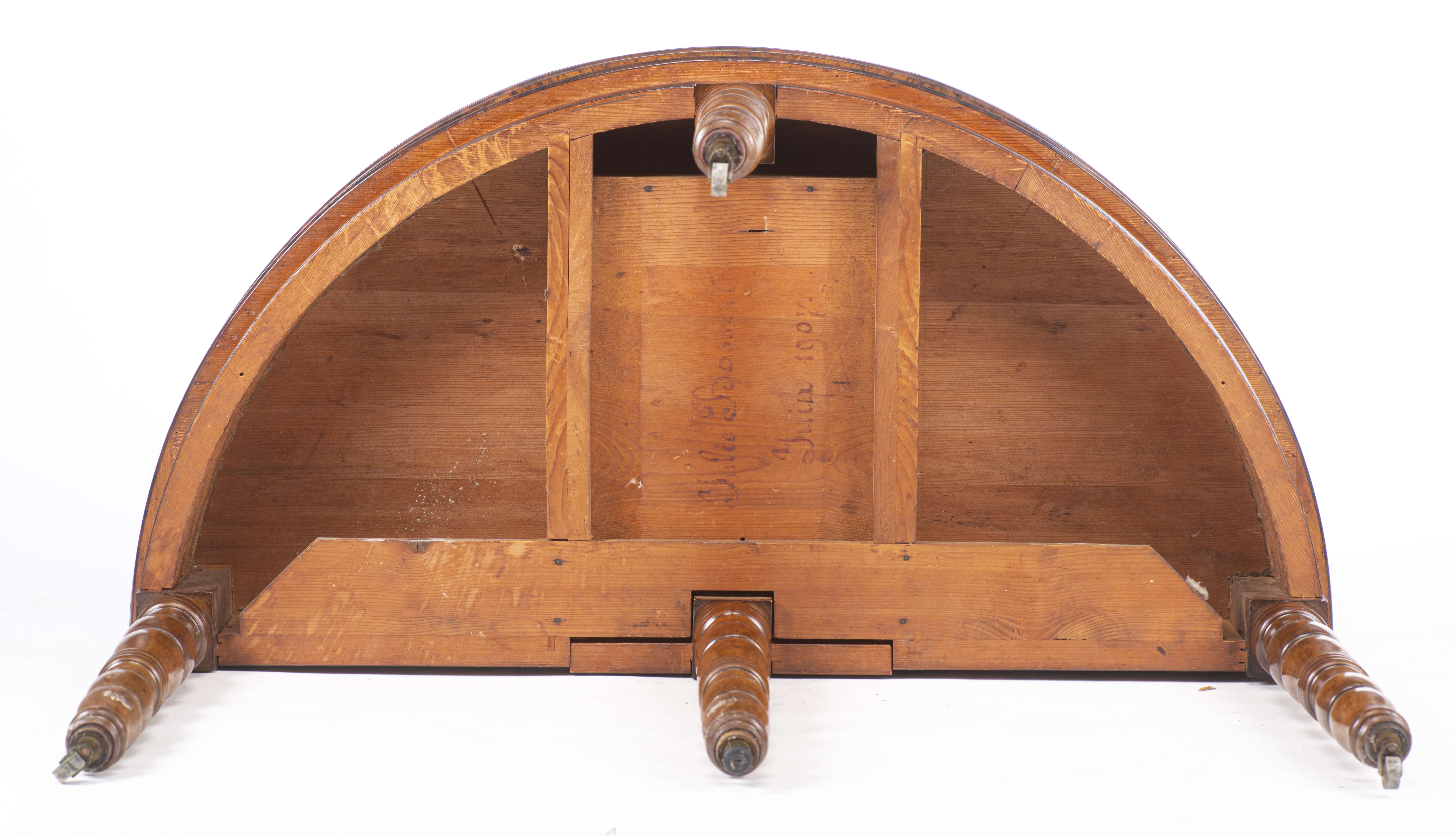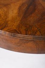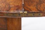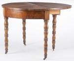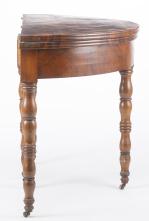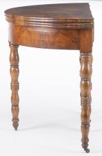 Table demi-lune en noyer, plateau à placage soleil recto et verso, pieds Jacob, XIXe.