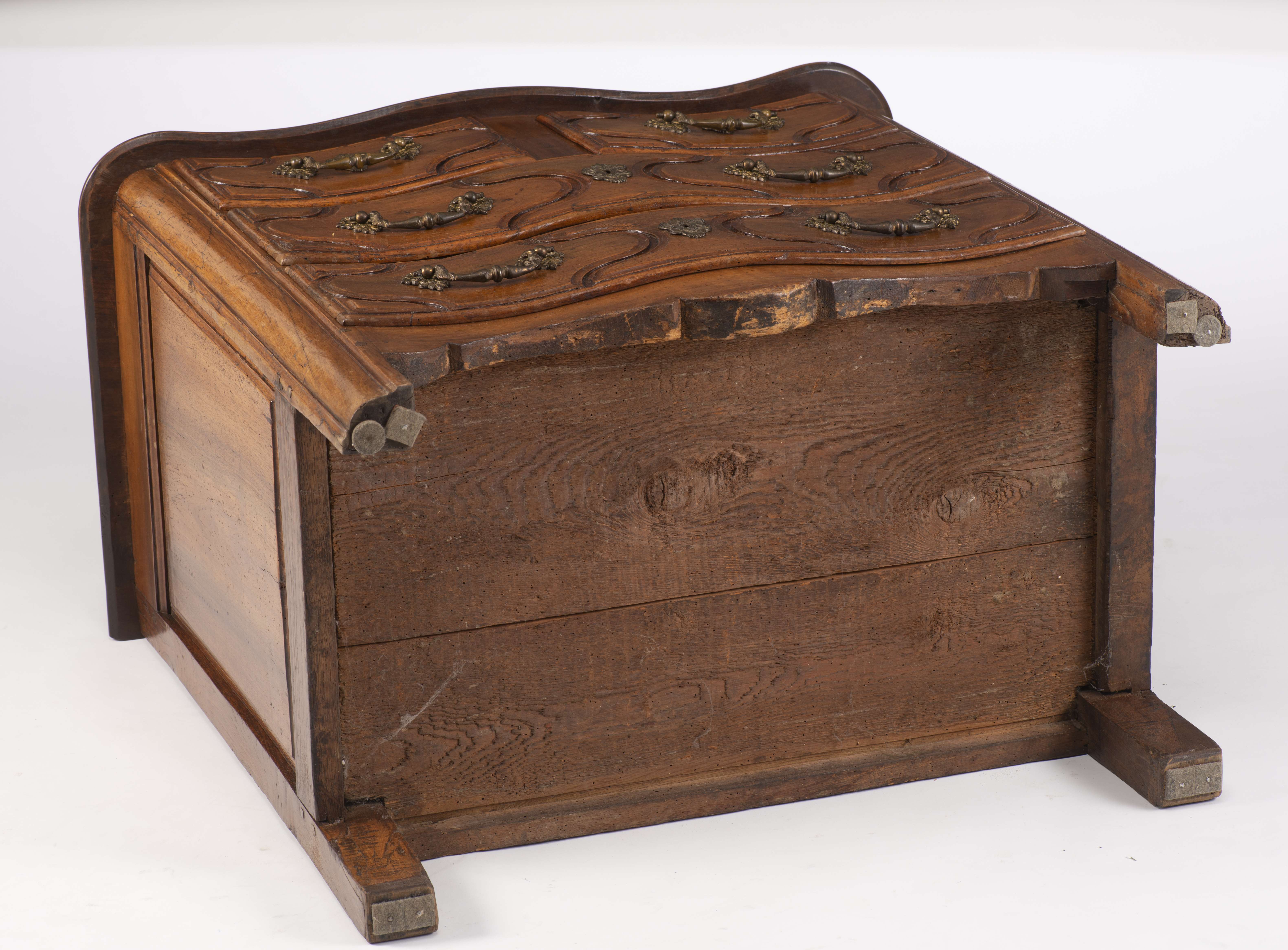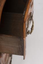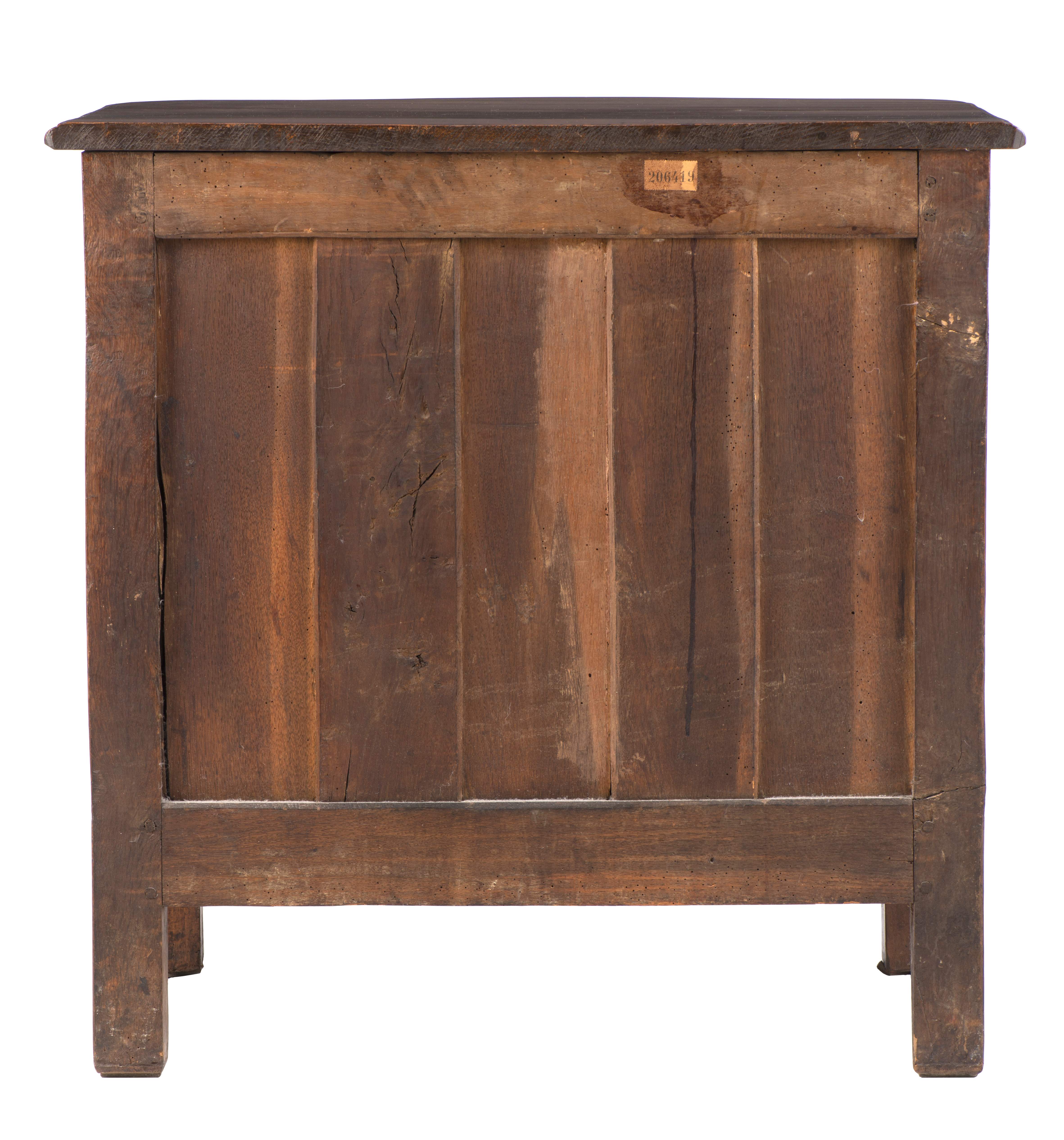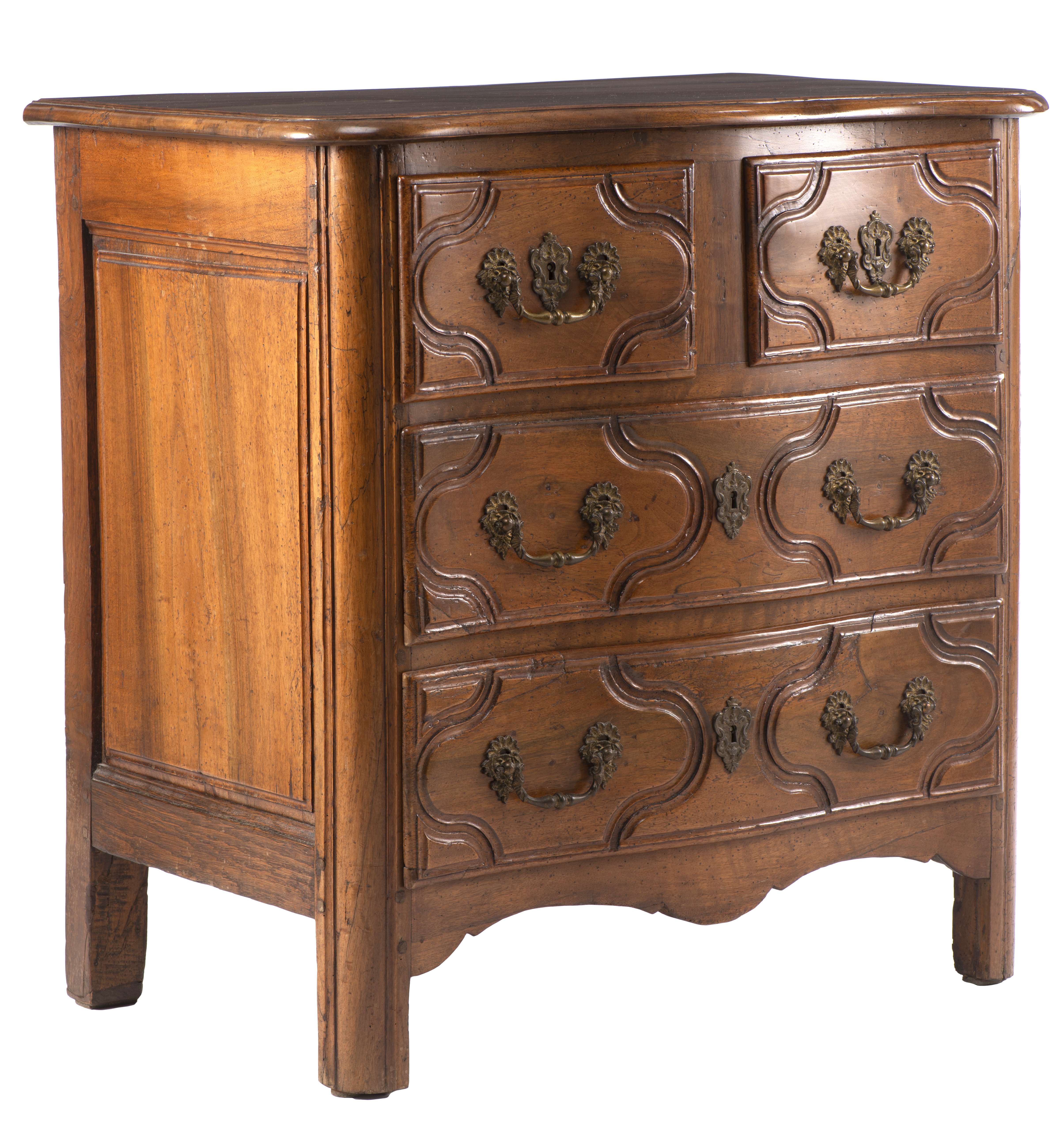 Commode d'époque Louis XIV en noyer avec bâti en chêne, 4 tiroirs, poignées et entrées de serrure en bronze. XVIIIe.