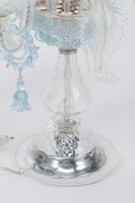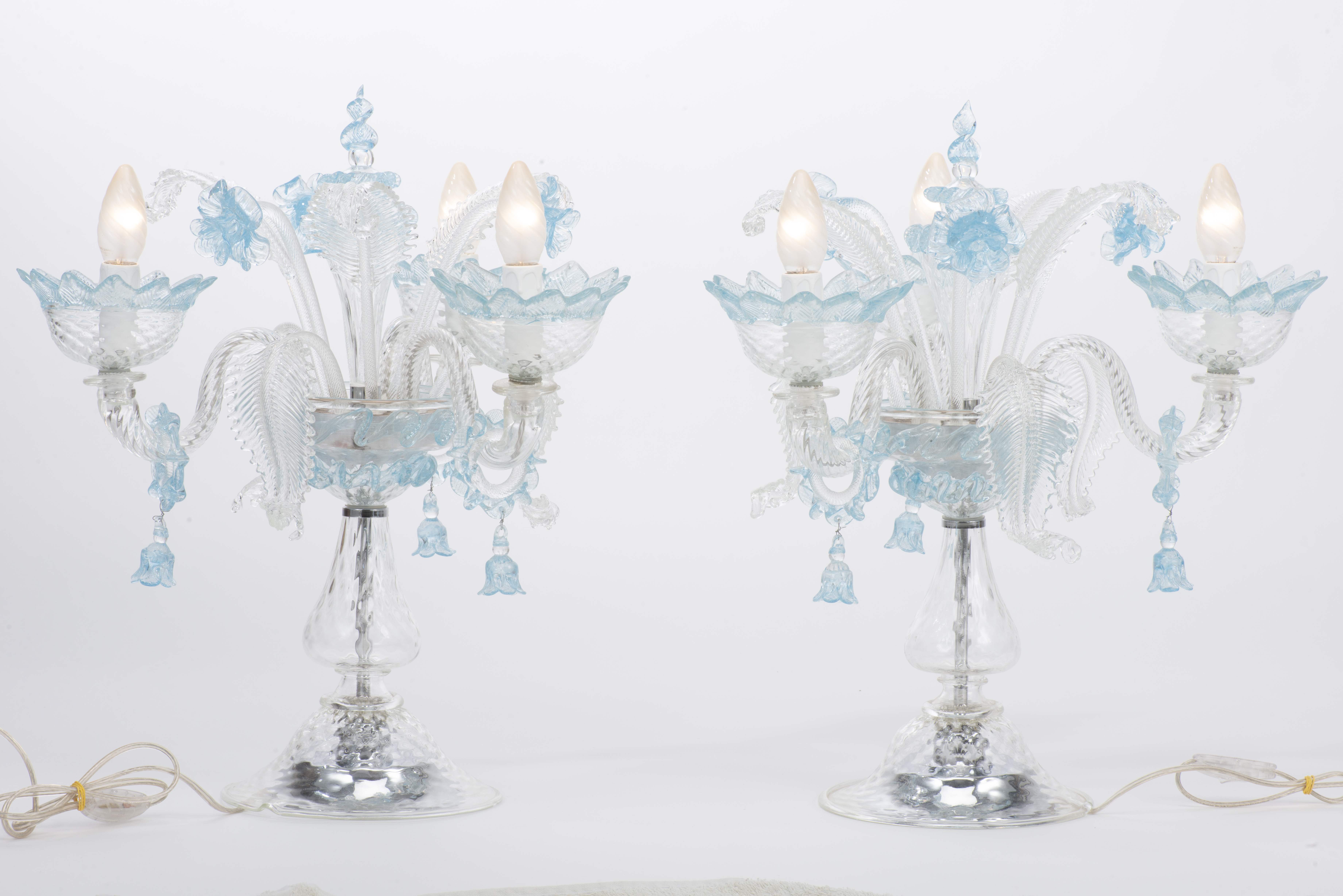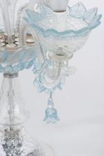 Paire de girandoles Murano à 3 feux en verre incolore et beu, fleurs et feuillage.