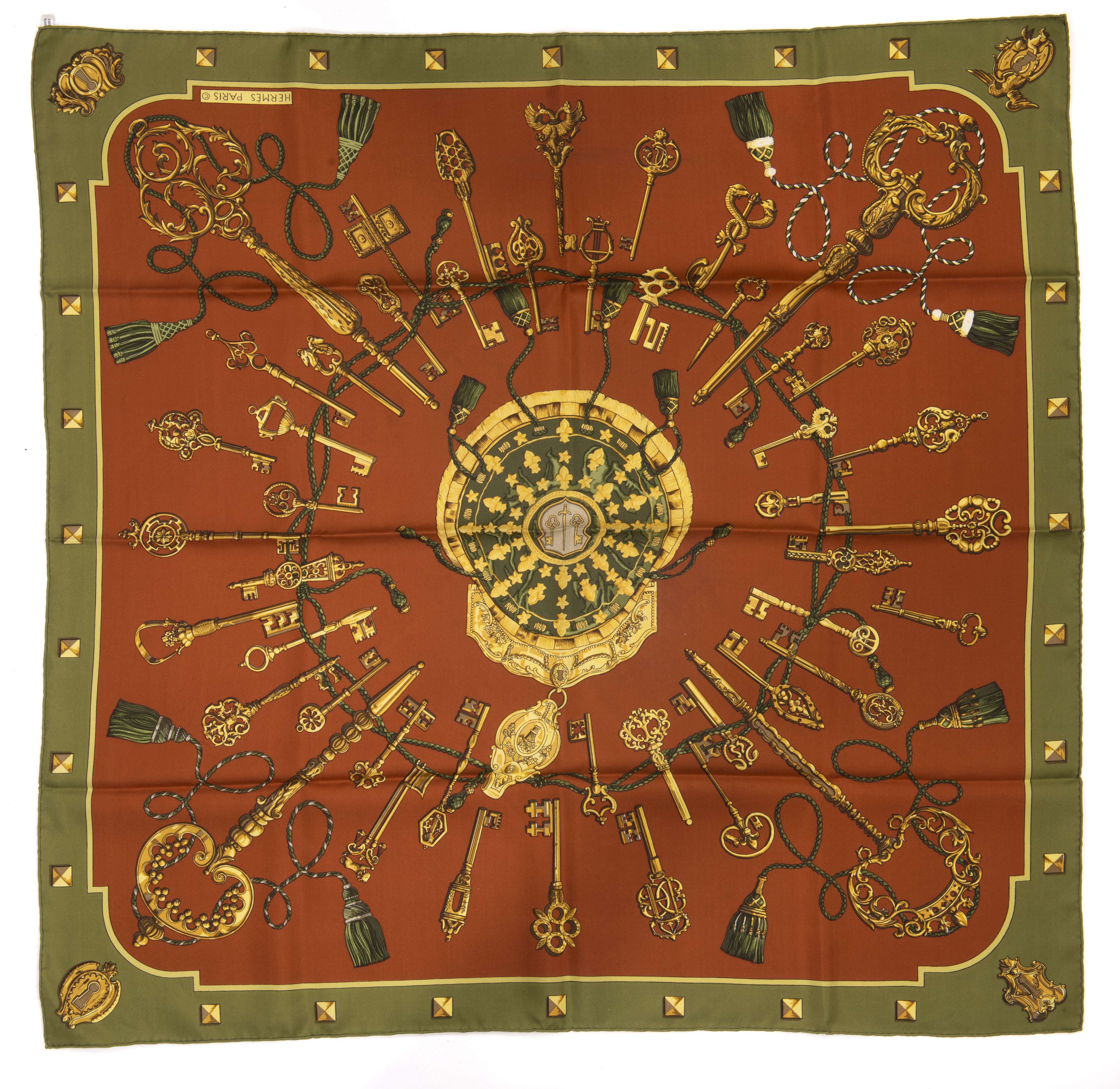 Hermès Paris, carré en twill de soie "Les clés" par Cathy Latham à bordure verte sur champ chocolat.