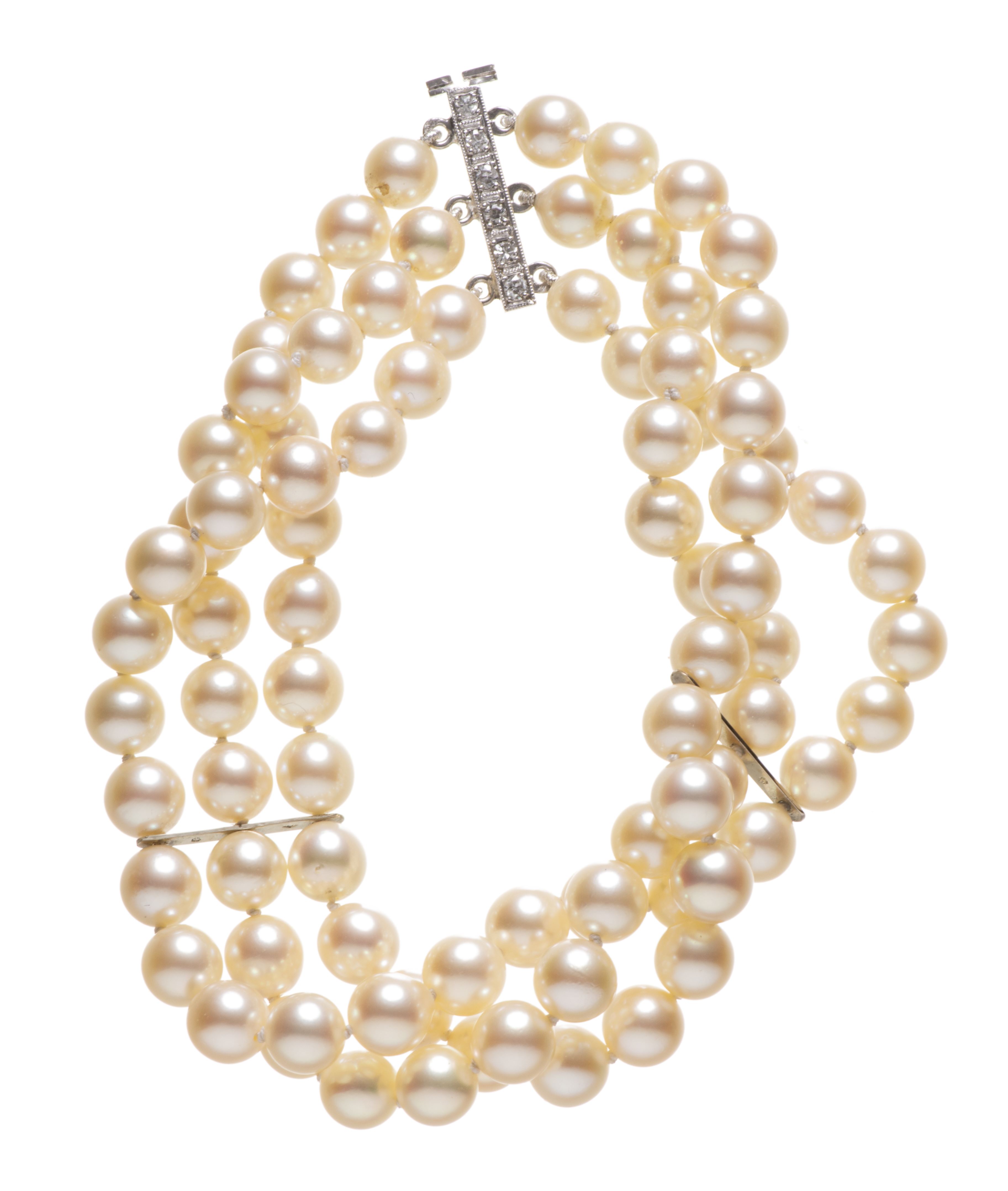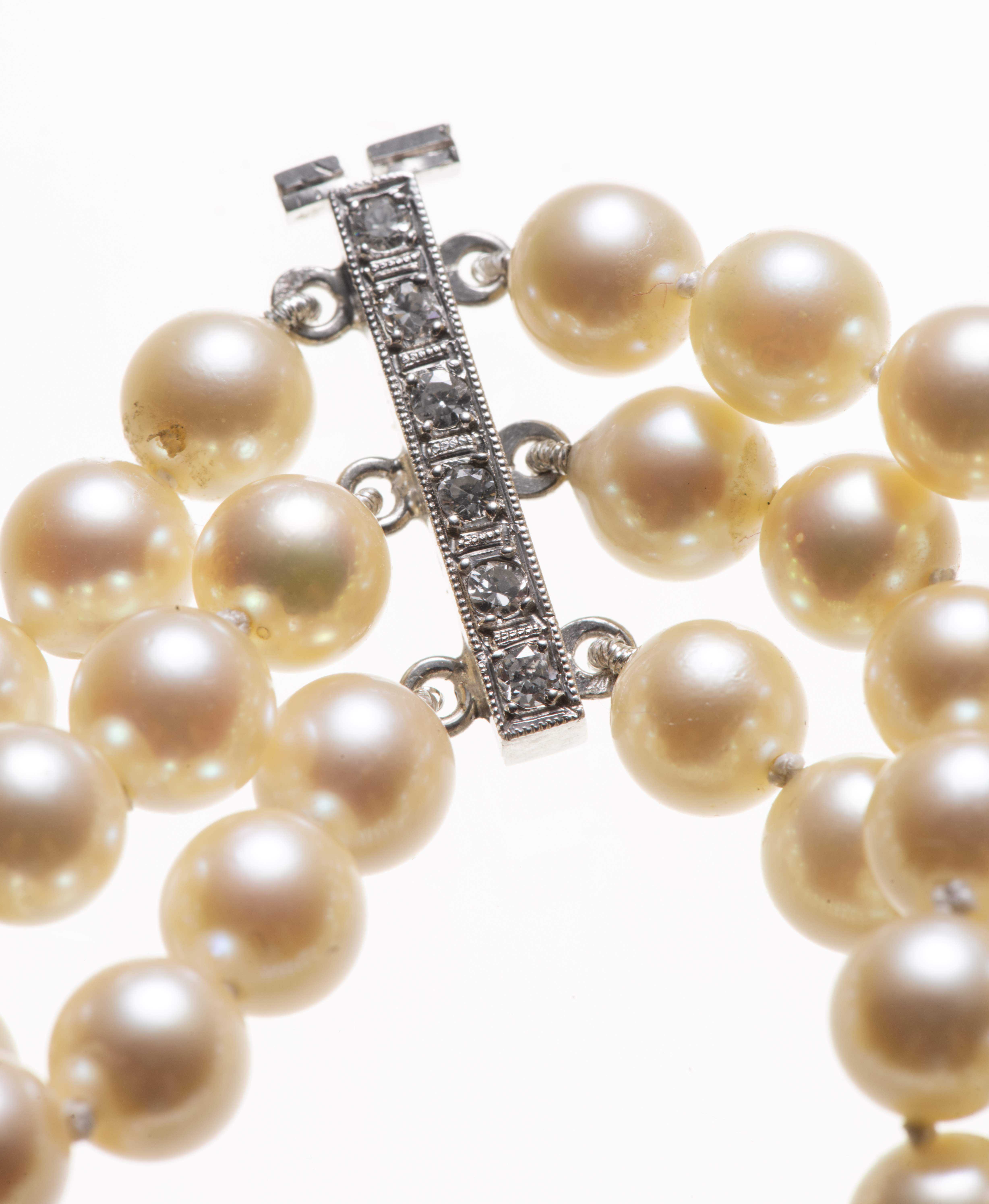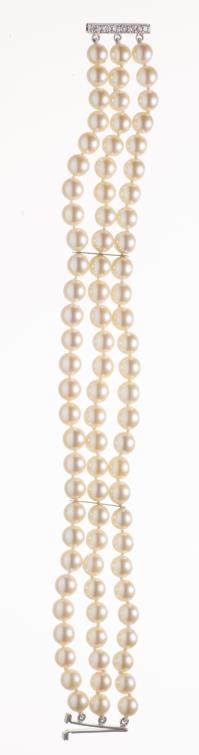 Bracelet à trois rangs de 84 perles de culture, fermoir en en or gris .750 à 6 diamants sertis à griffes