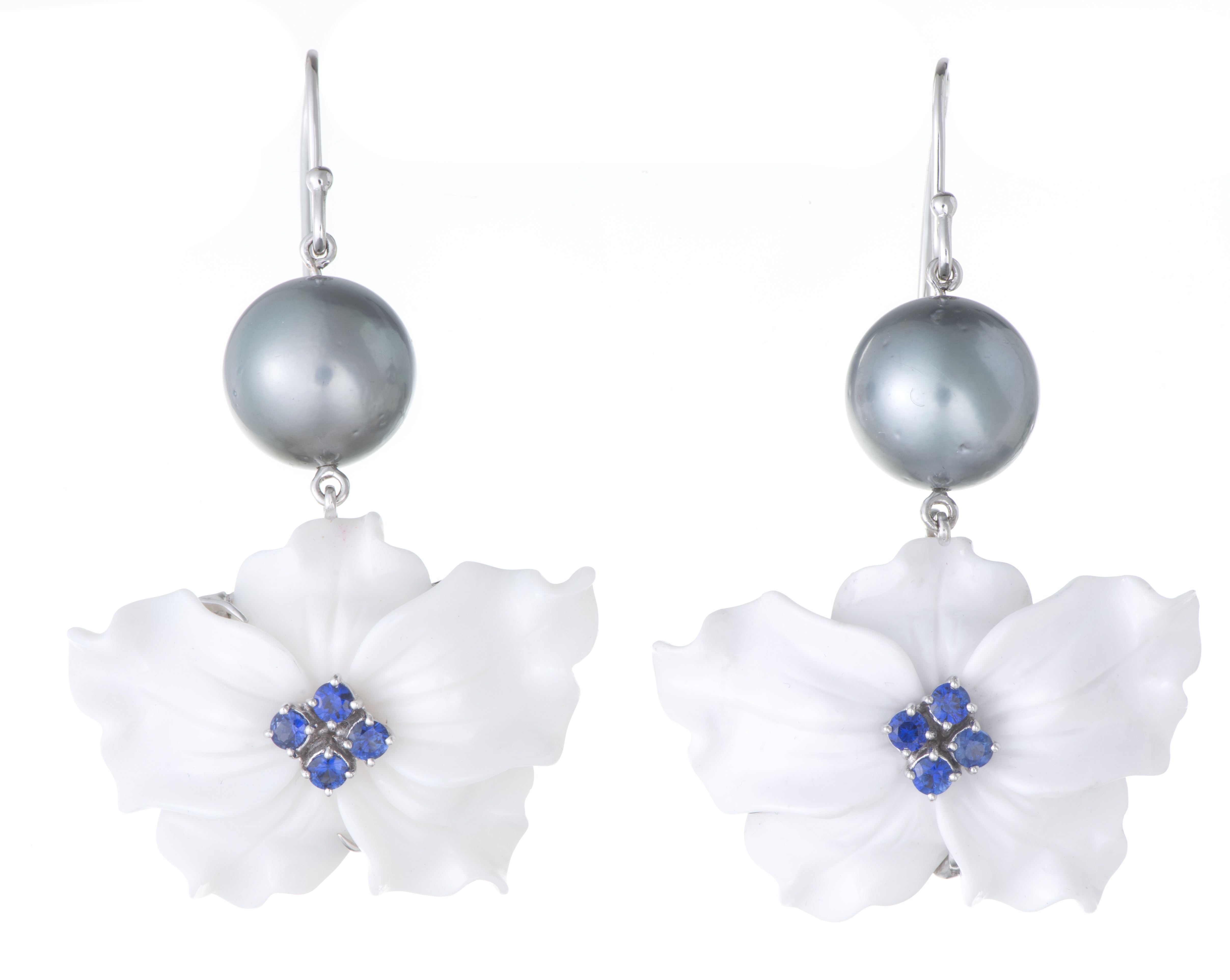 paire de boucles d'oreilles en perles de Tahiti de 12 mm et fleurs en agate blanches avec pistil à 8 saphirs facetés pour 0.40 ct.
