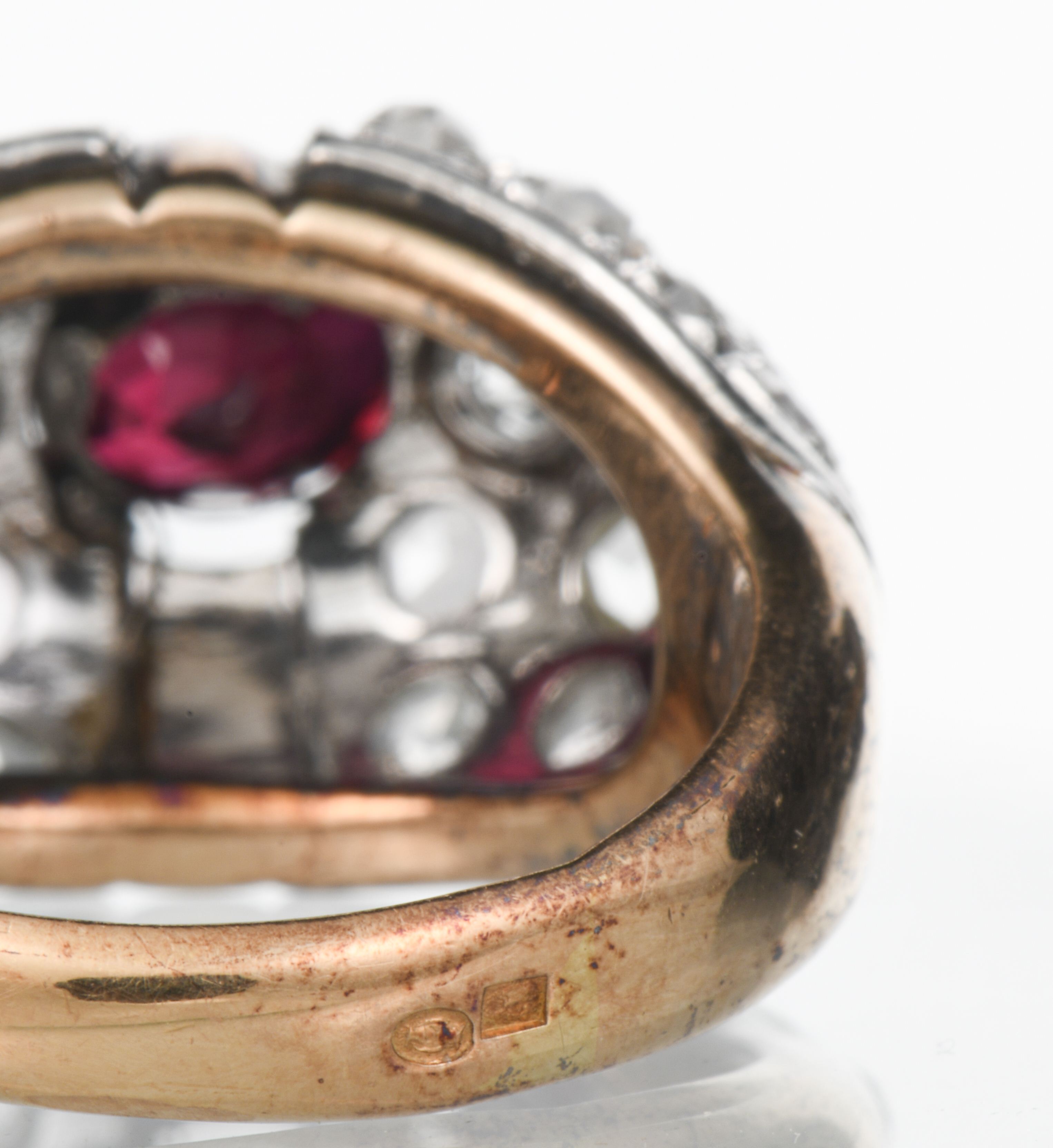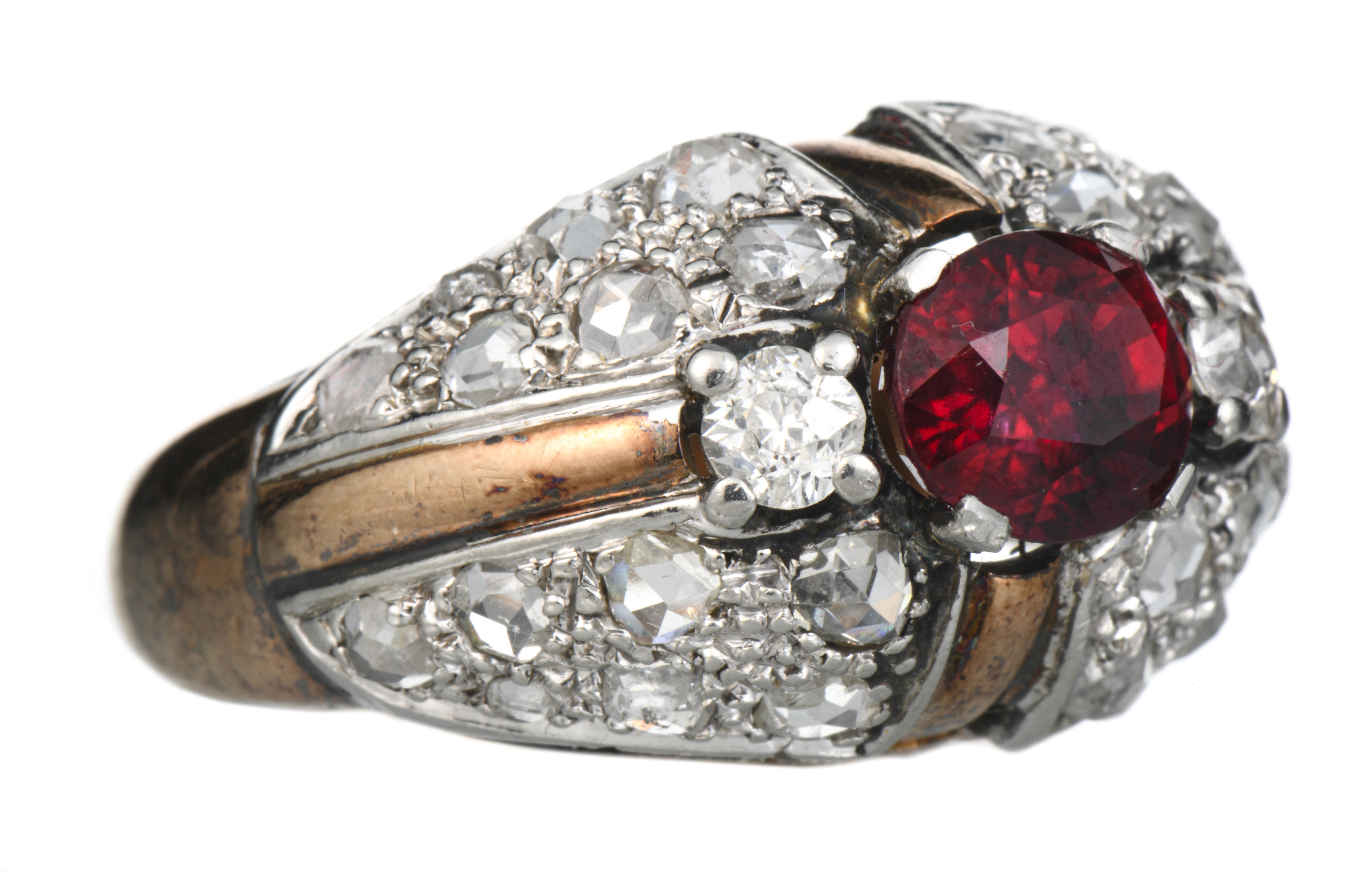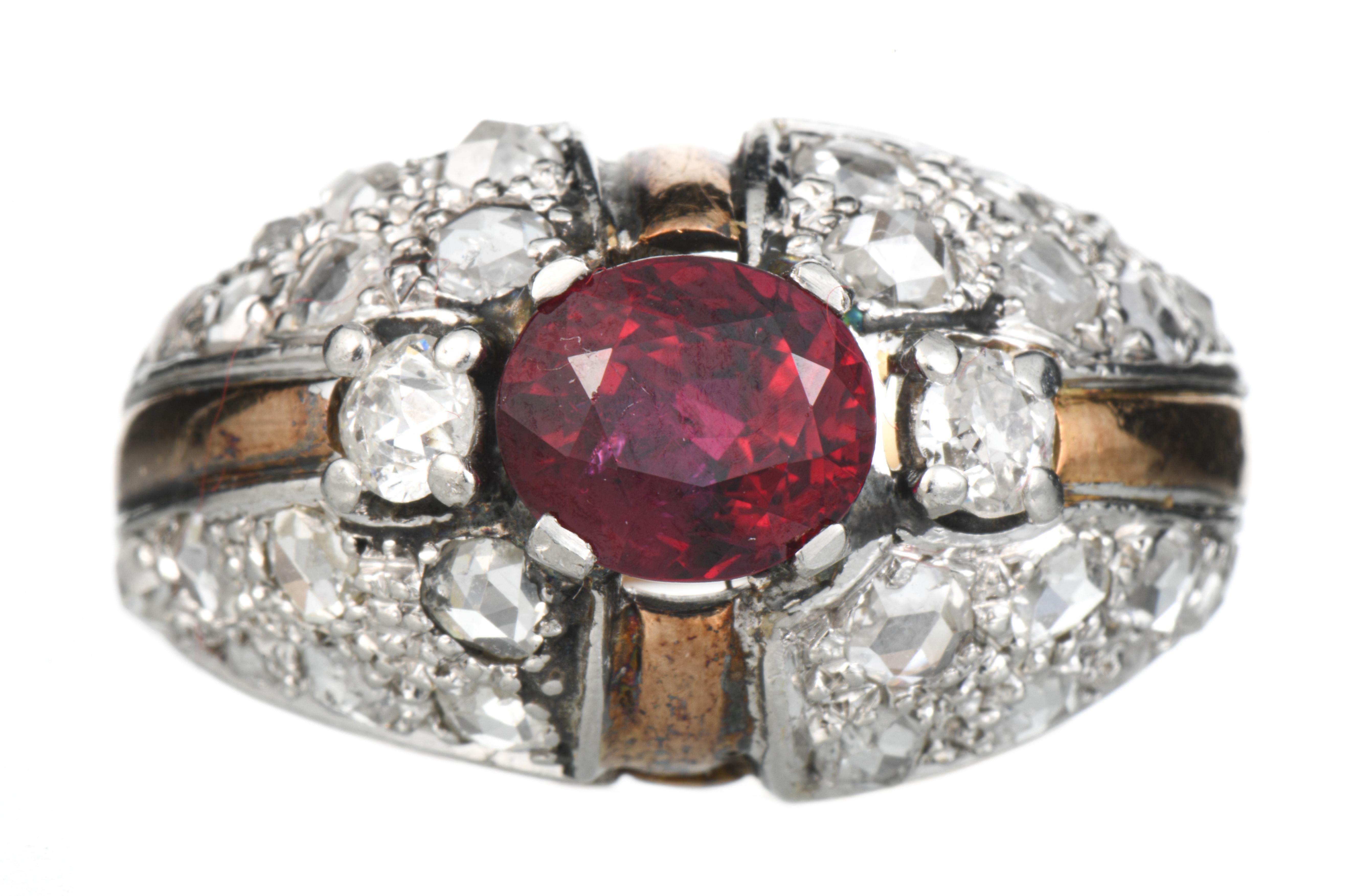 bague en or jaune et or gris .750 avec un rubis de 1.30 ct couleur sang de pigeon et 28 diamants de taille rose pesant au total 0.60 ct et deux diamants de taille brillant pour 0.10 ct au total.