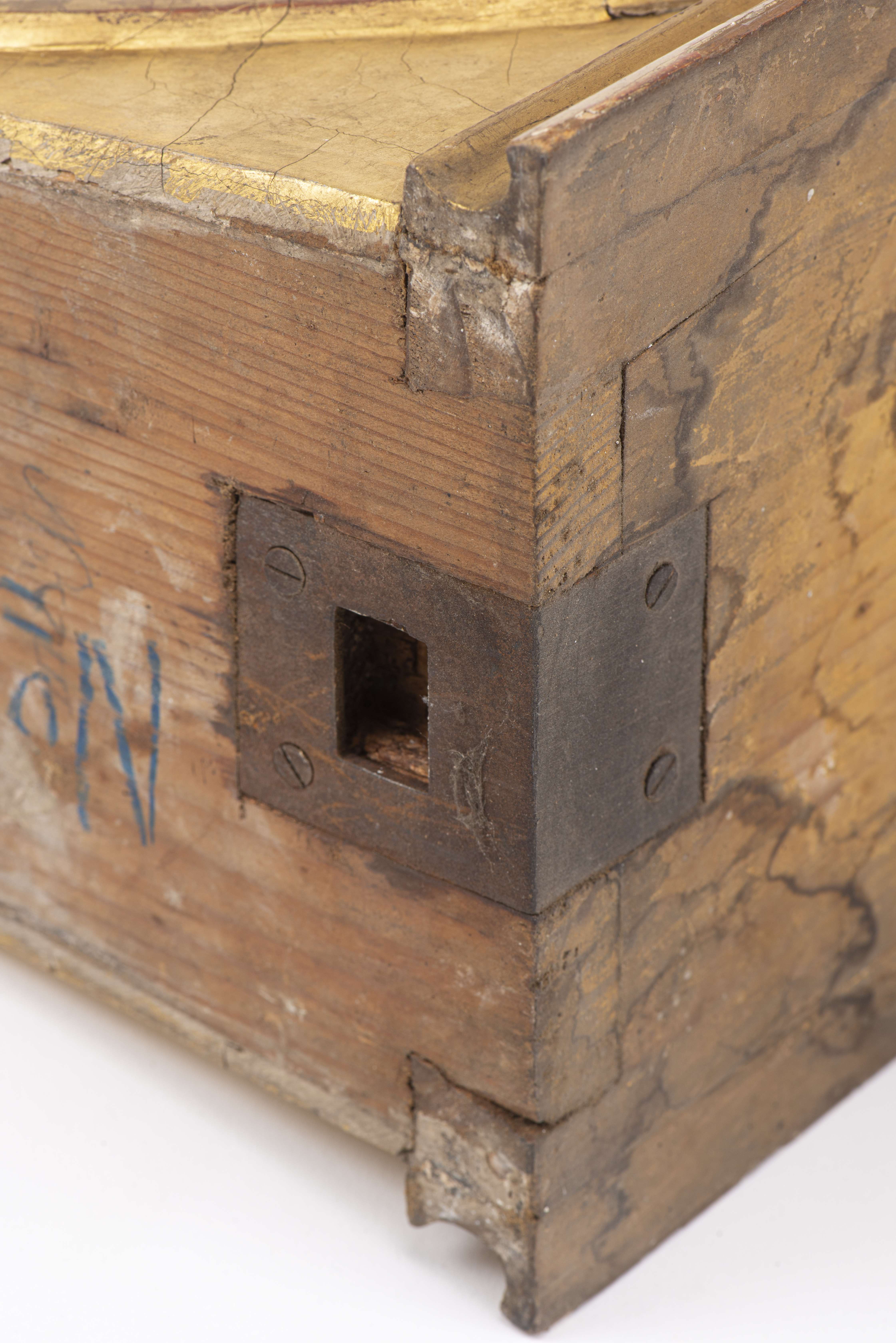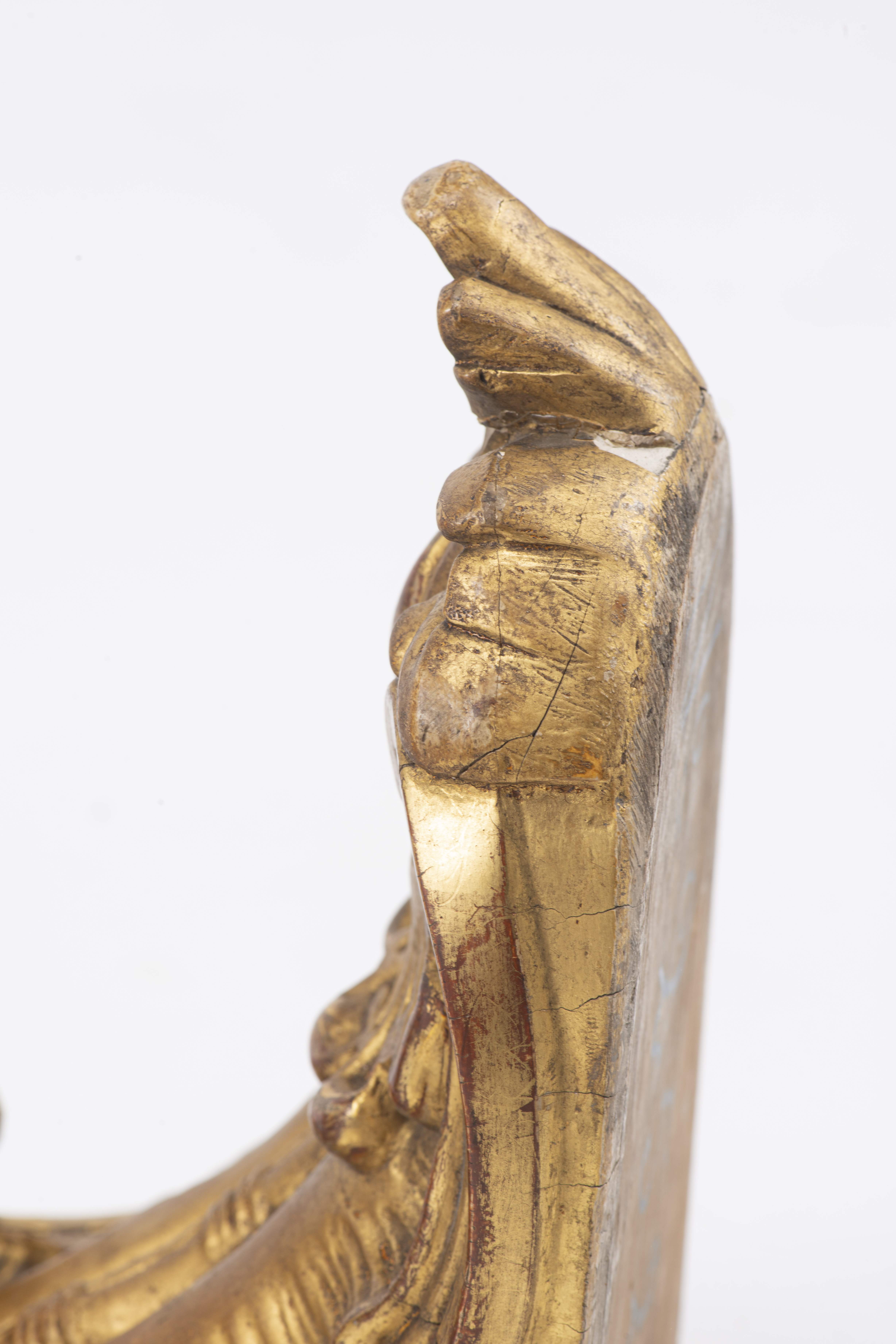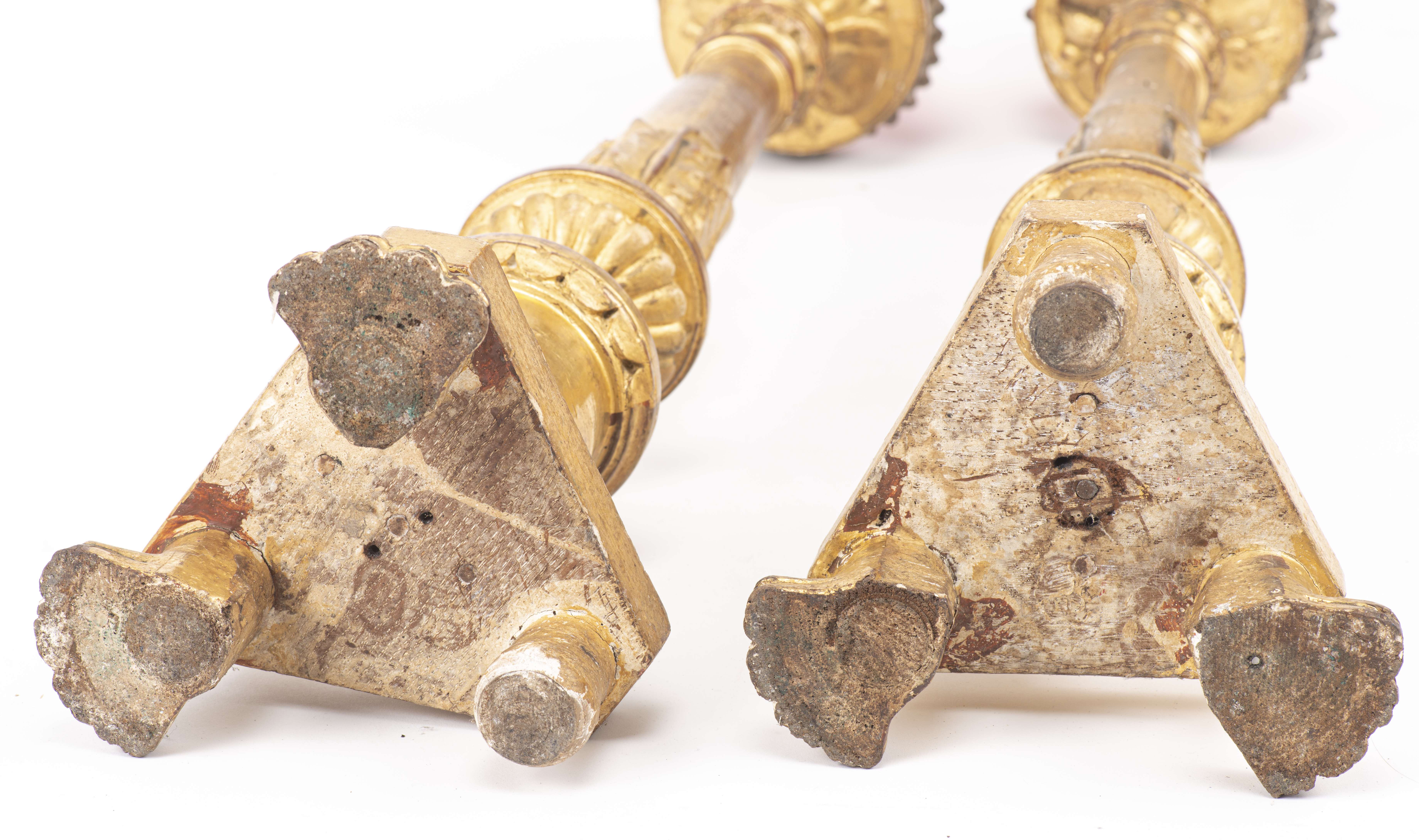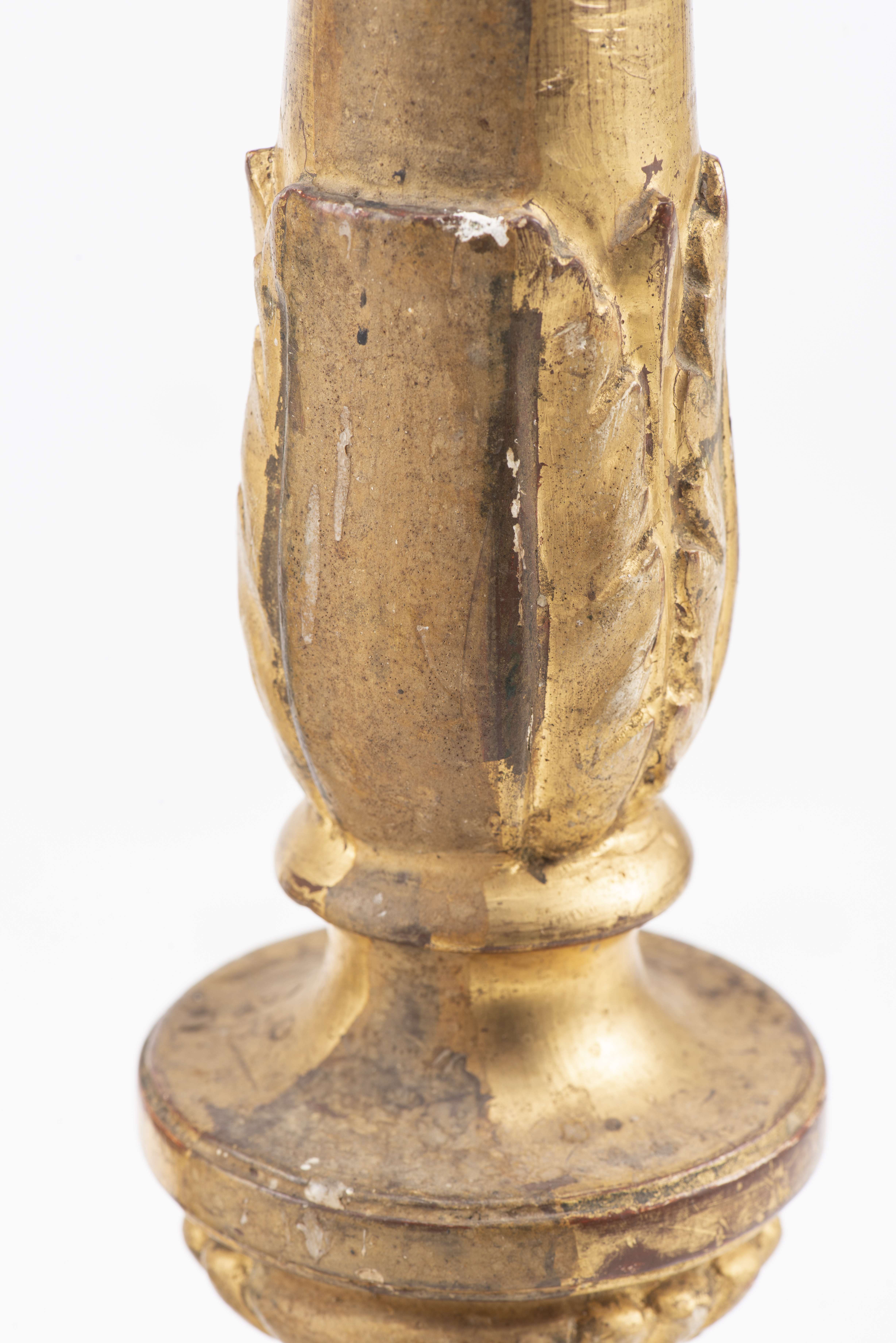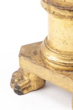 Deux sellettes en bois doré et deux porte-cierges d'église également en bois doré