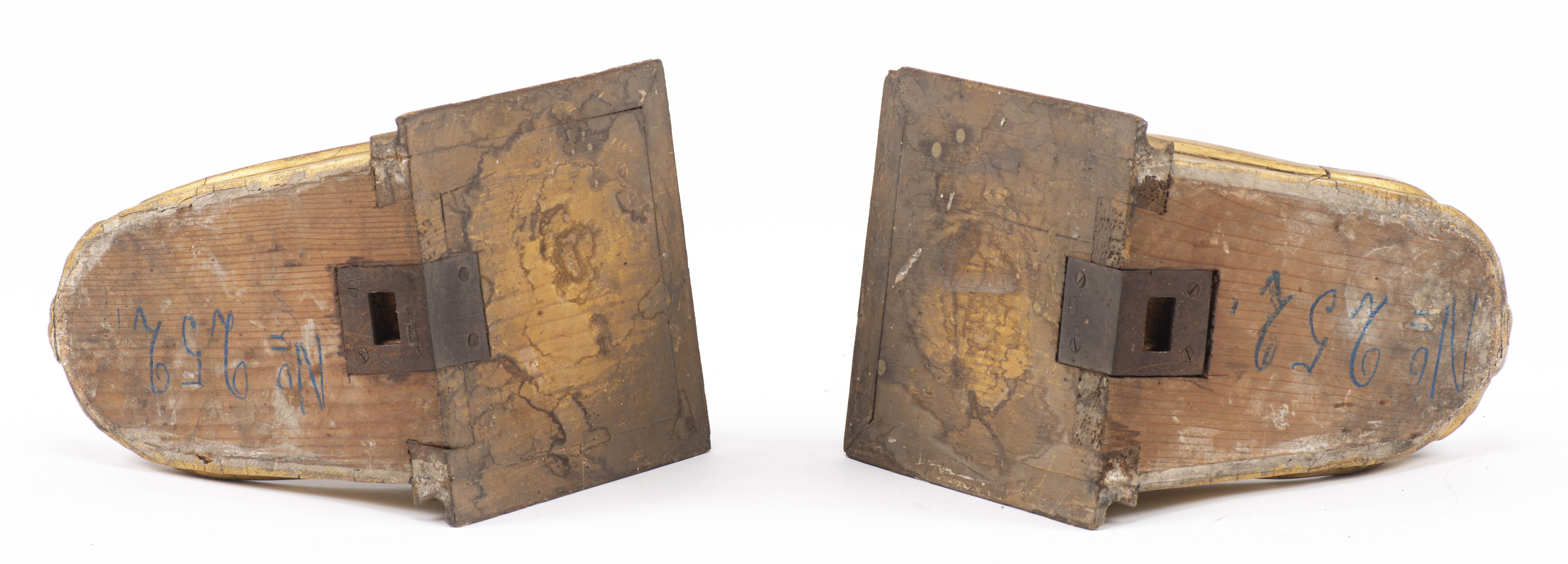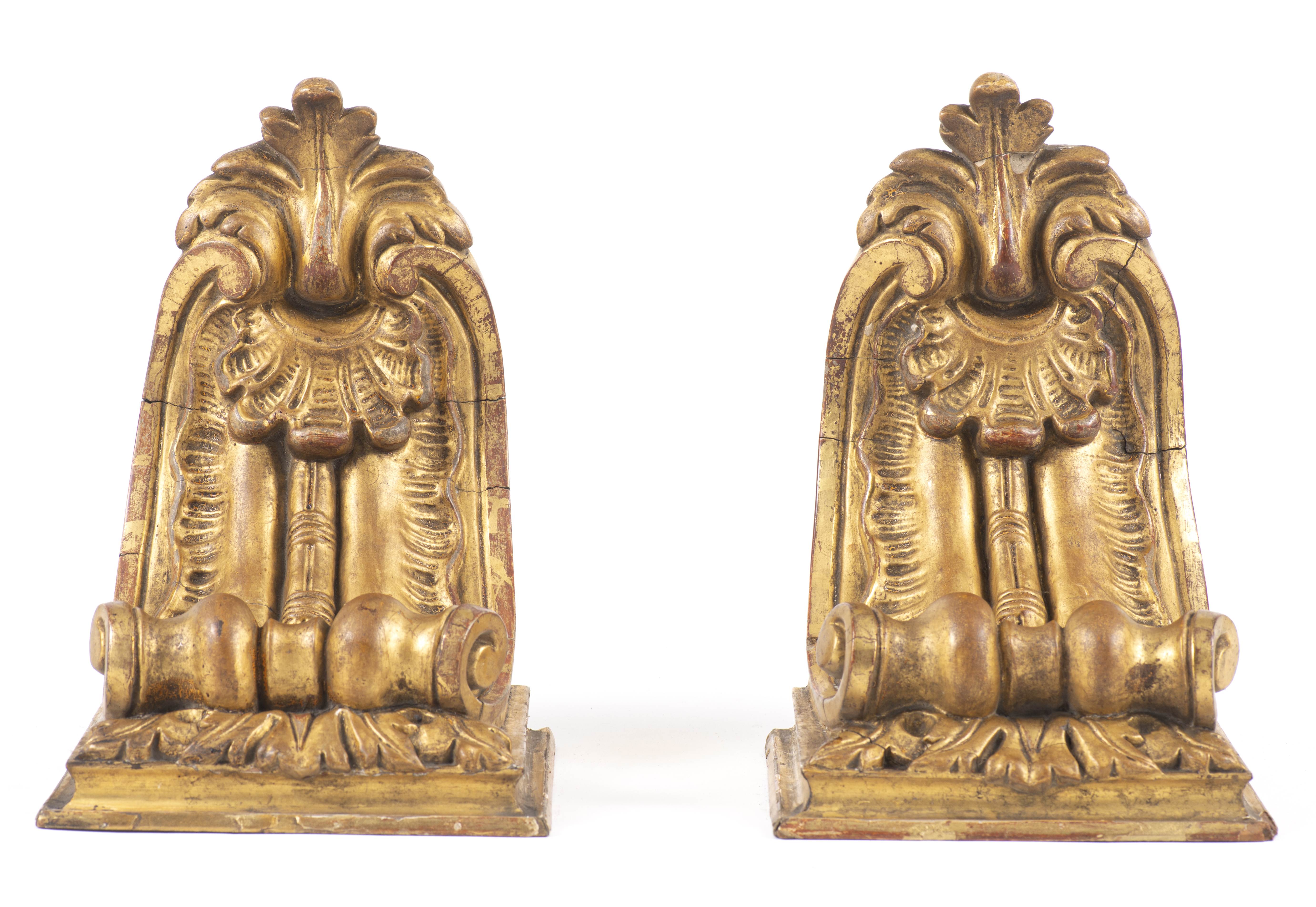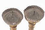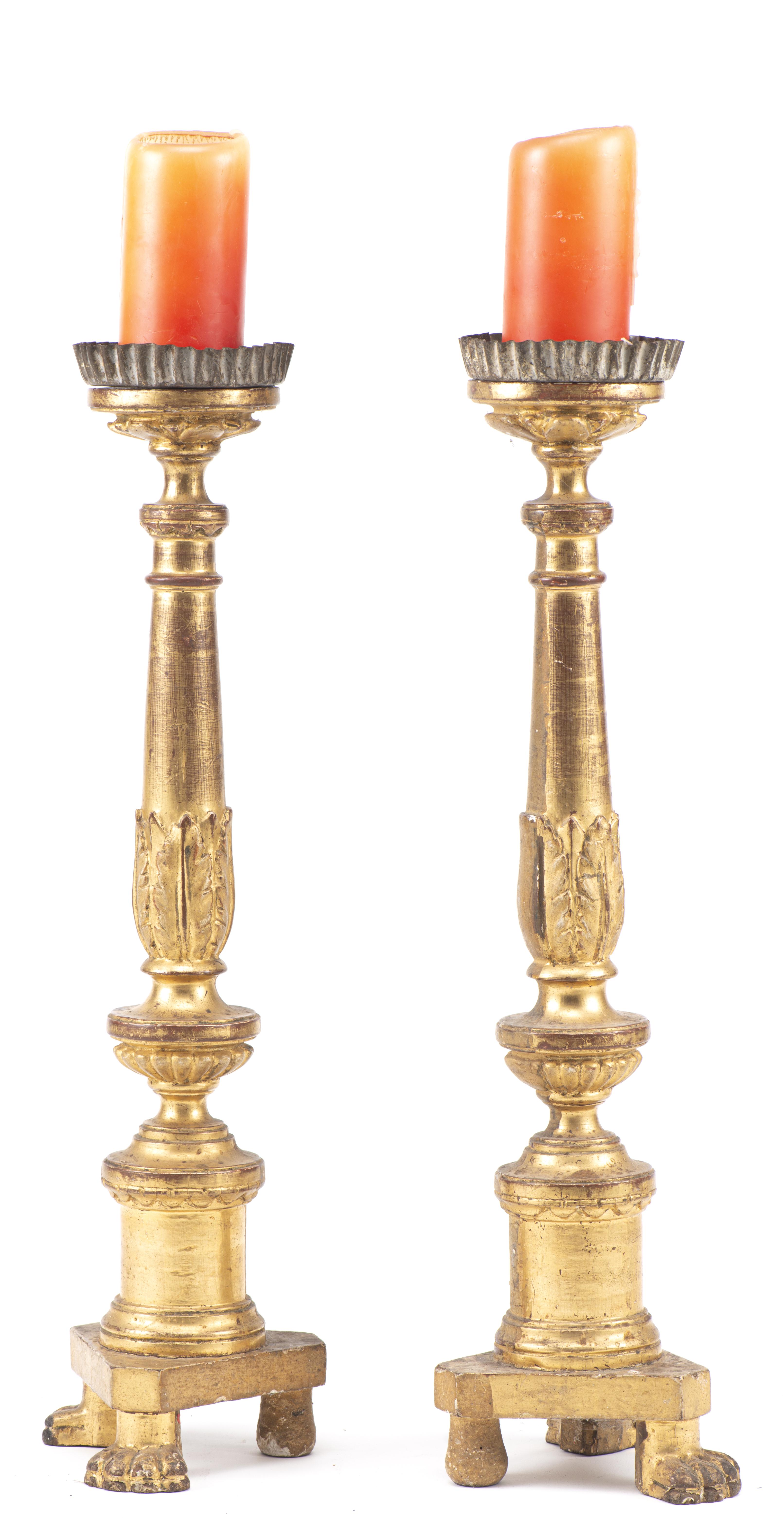 Deux porte-cierges et deux sellettes en bois doré