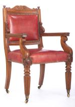 Fauteuil en bois sculpté, assise cuir rouge, pieds cannelés sur roulettes.