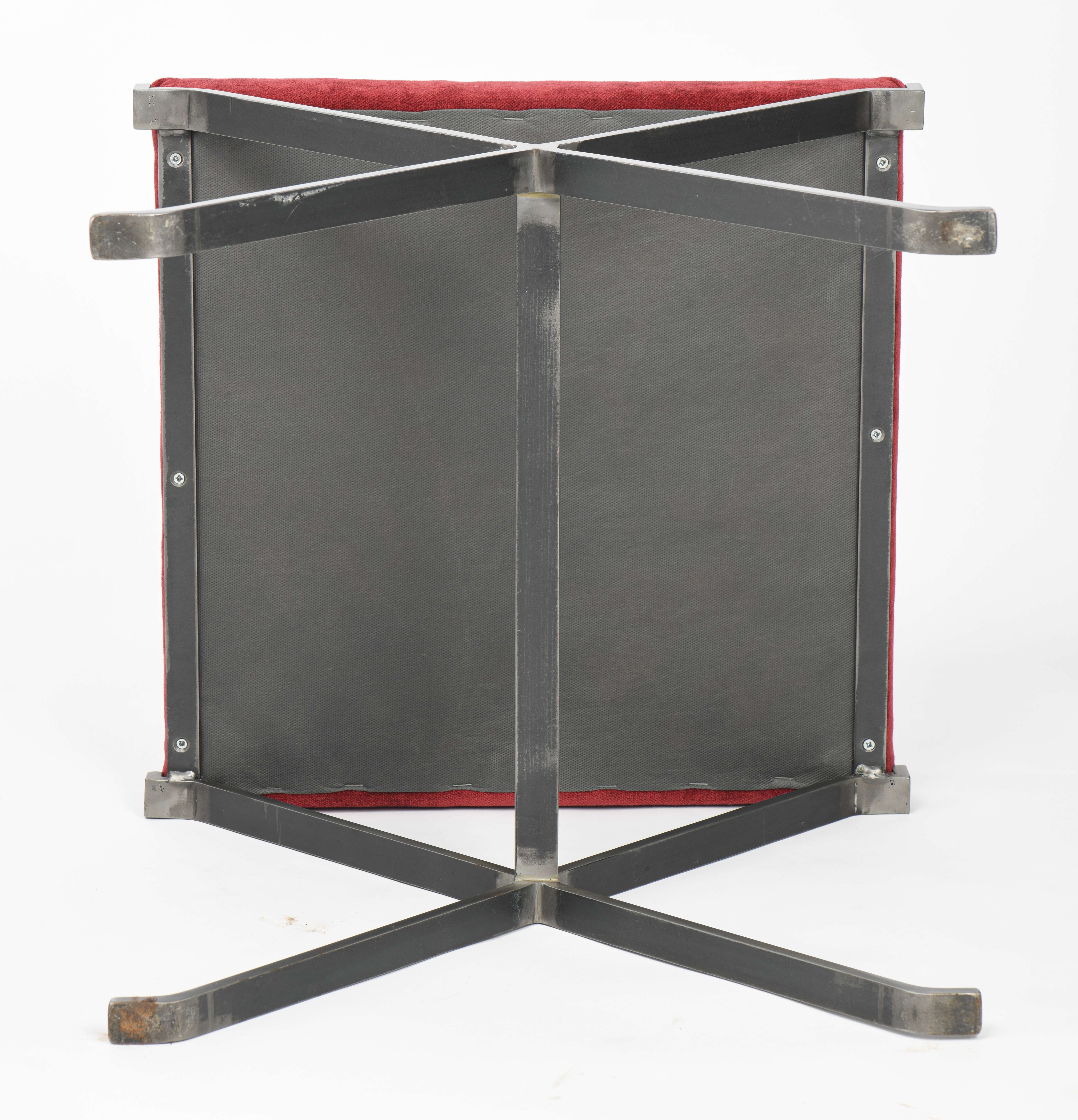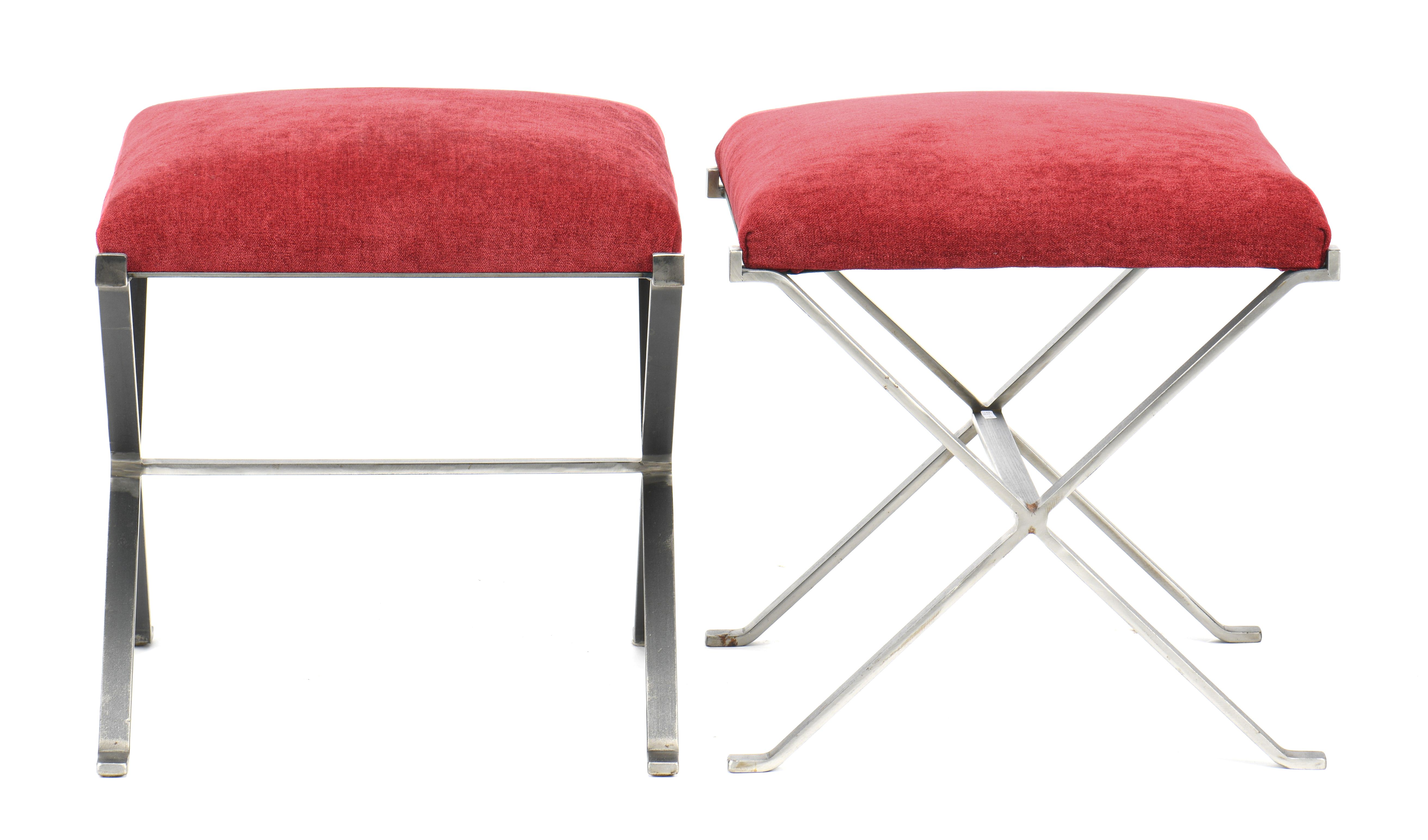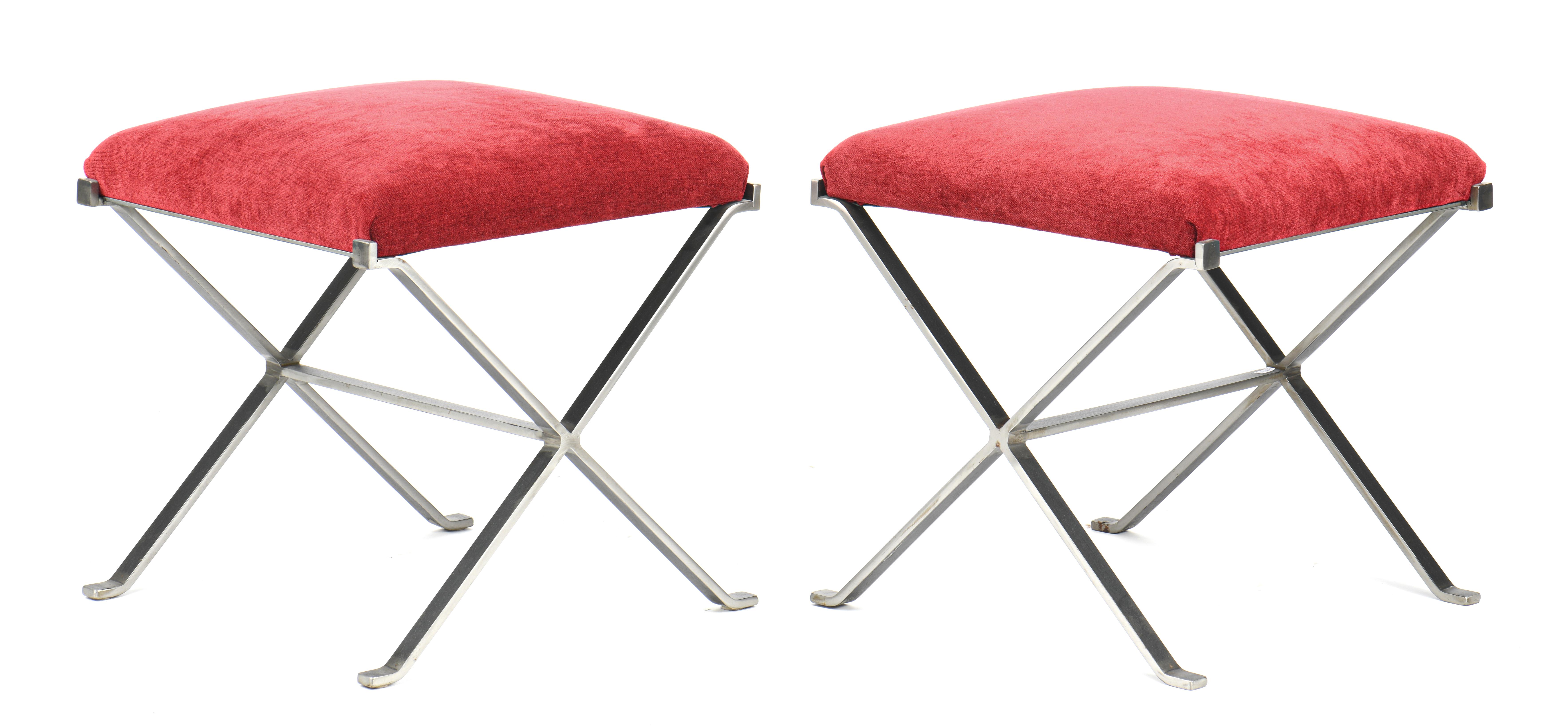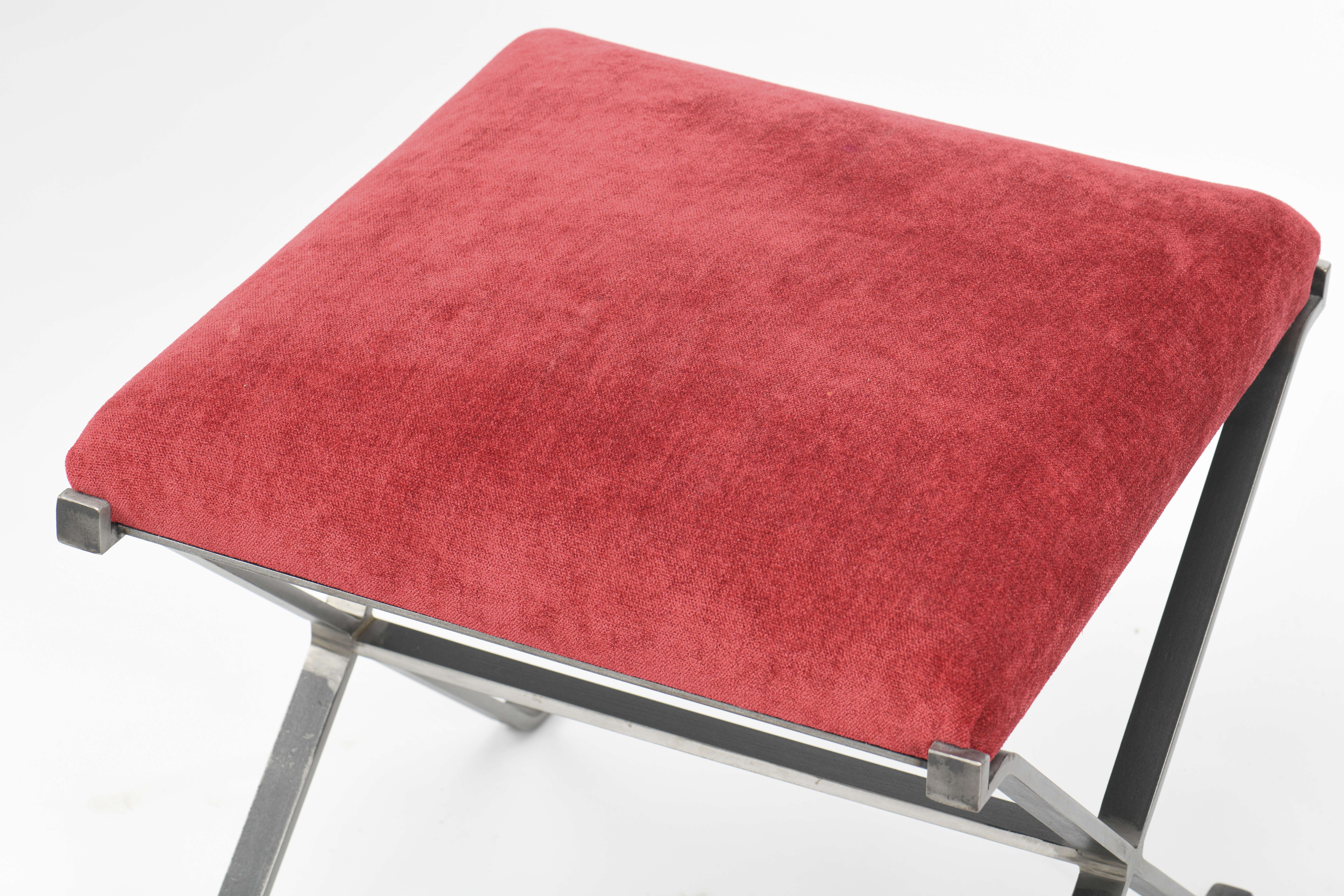 Design artisanal du XXe, paire d'ottomans à structure en acier brut et pieds en X fixes terminés par des patins en L. Assise à galette fixe recouverte de velours rouge.