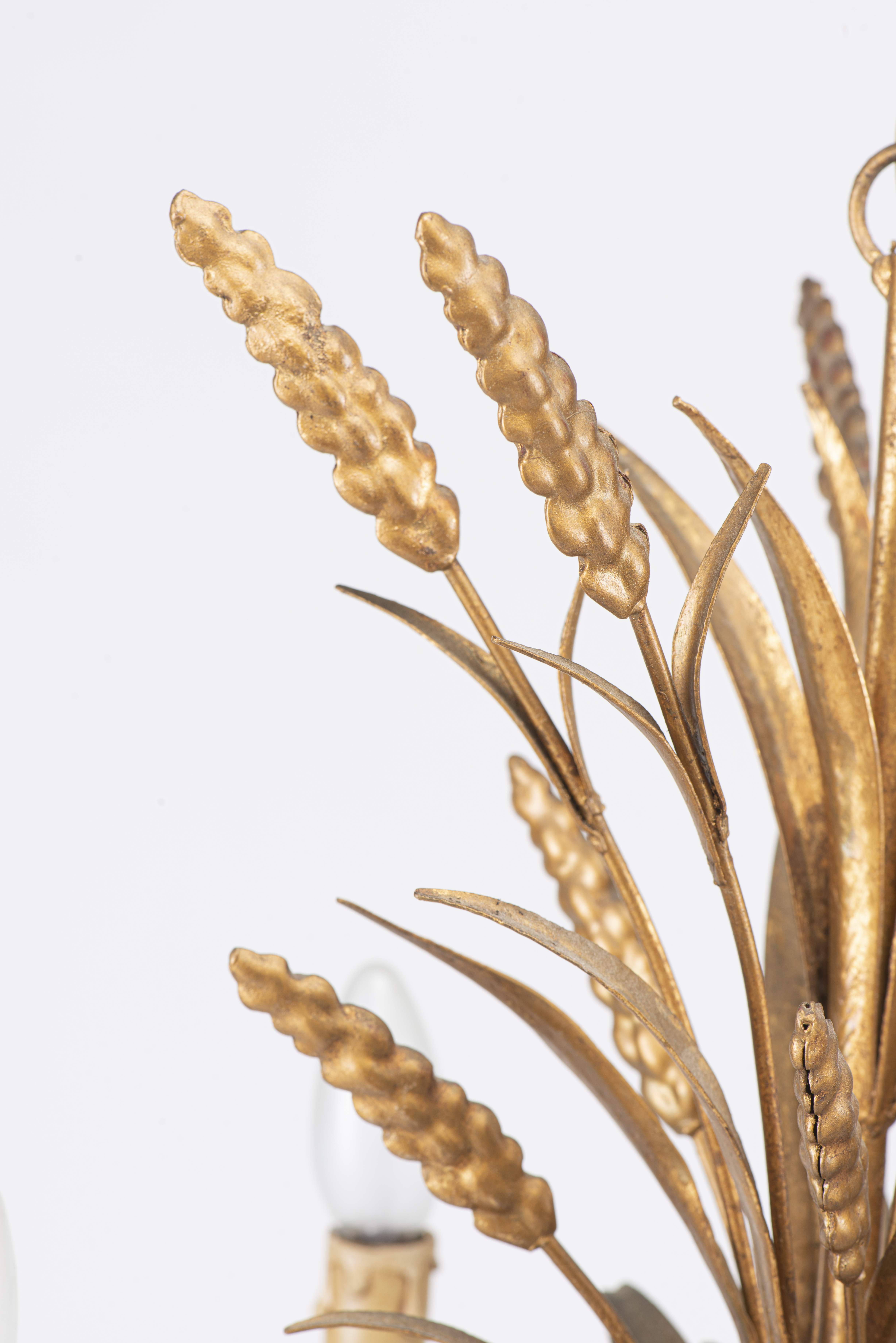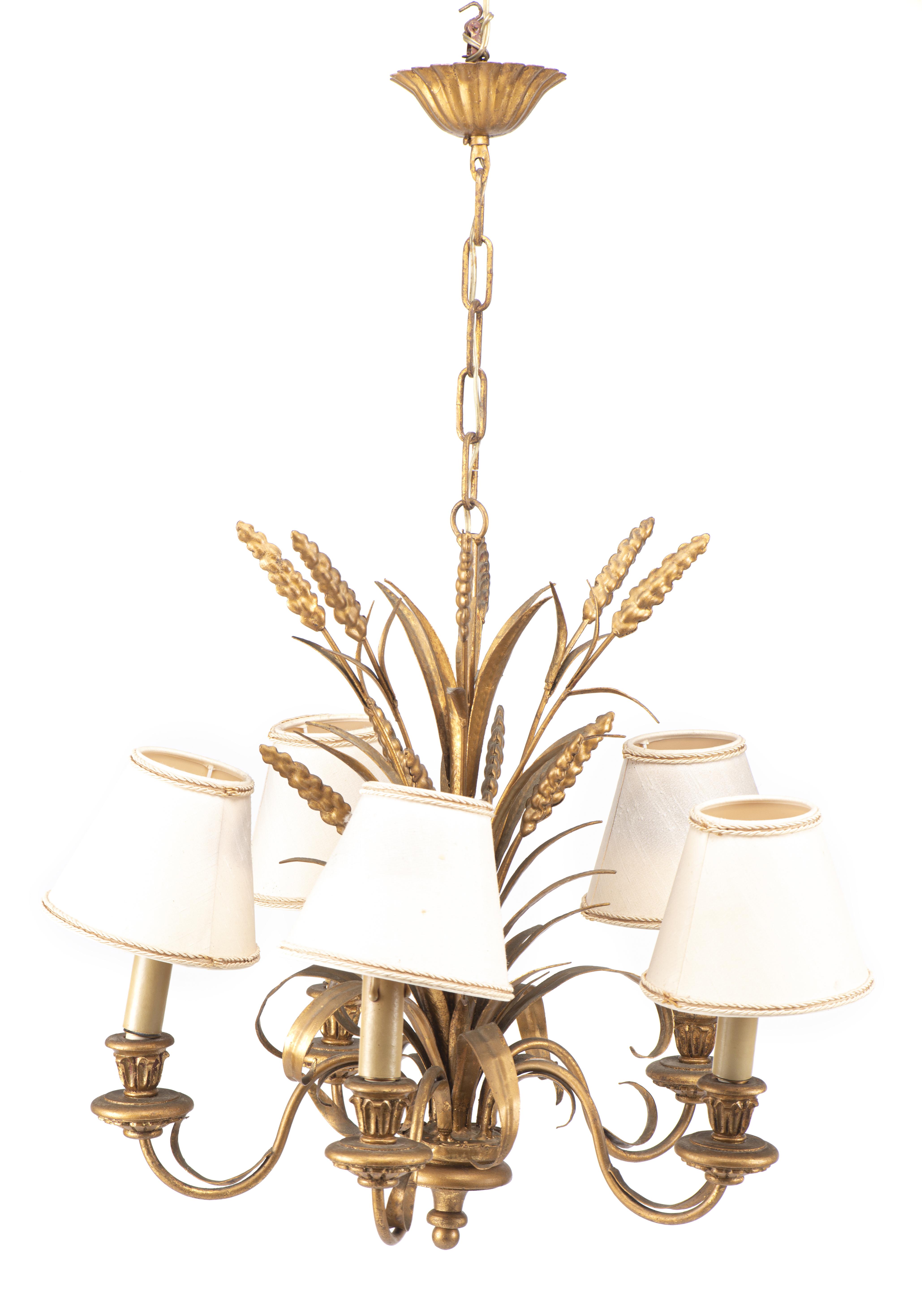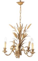 Maison Jansen, dans le goût de, lustre en bois et métal doré à décor d'épis de blé et cinq feux.