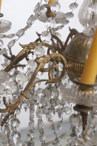 Lustre en bronze doré à 9 bras supportant des bougies et pampilles de cristal.