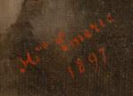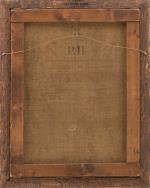 Honorine EMERIC née Bouveret (née 1814), "Roses sur un plan d'eau", huile sur toile, signé en bas à droite en rouge et datée 1897, inscription au dos de la toile "8 P.H", tampon rond estampillé sur le châssis représentant une encre, n°141 au dos.