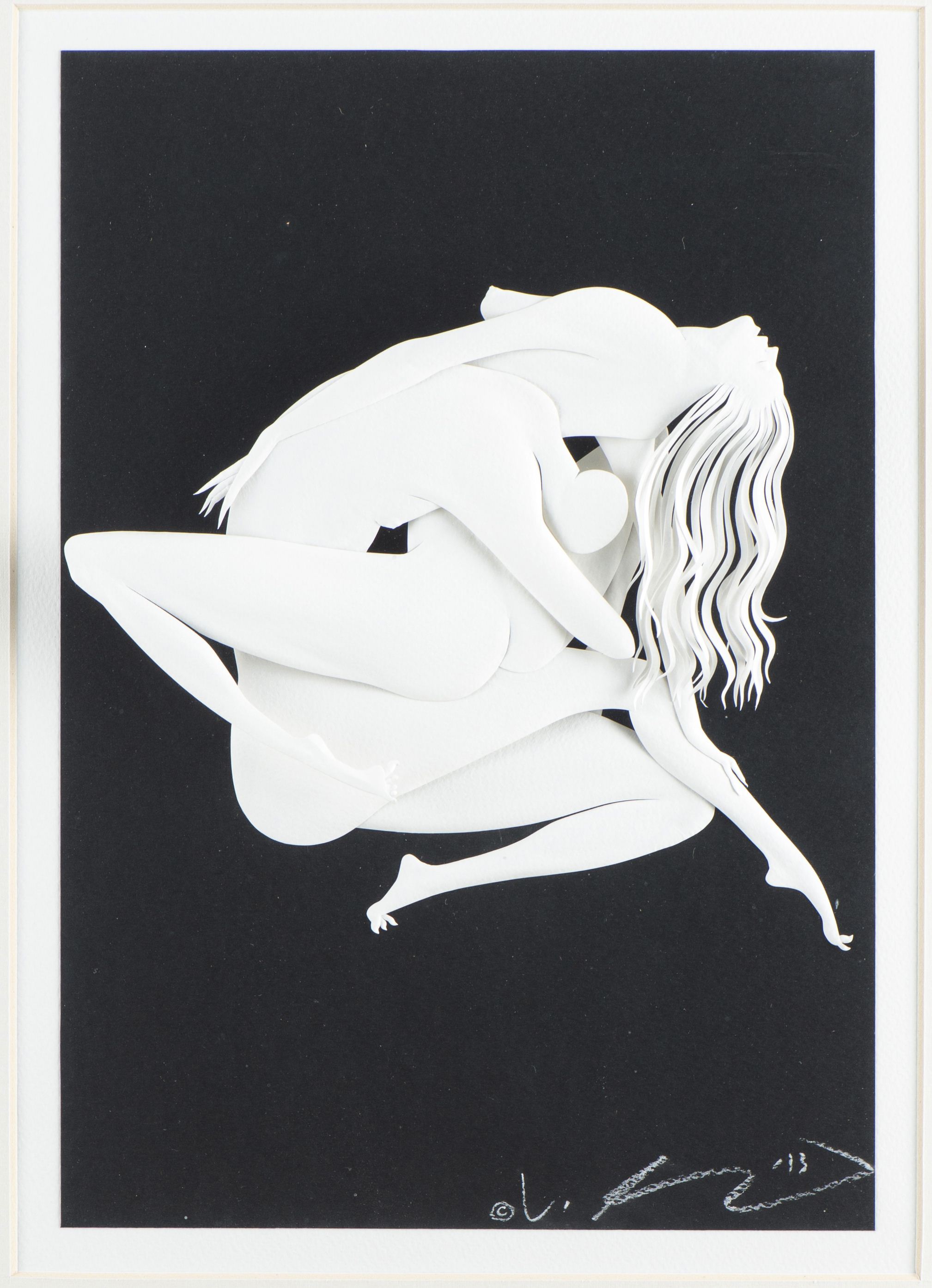 "Scène érotique", découpage de papier blanc en relief, signé illisiblement en bas à droite et daté.