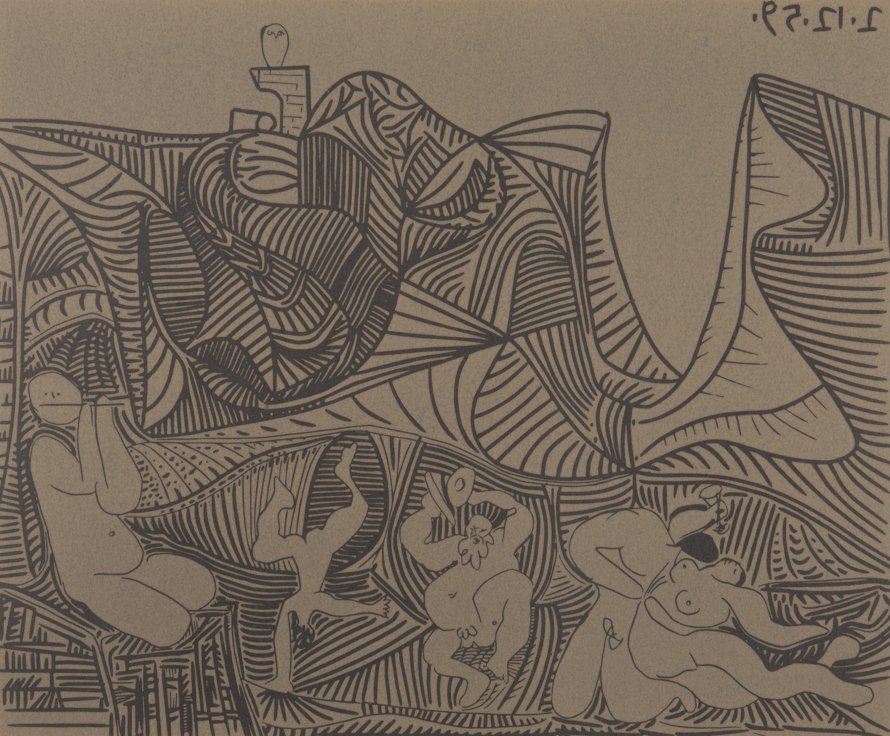 Pablo PICASSO (1881-1973), d'après, cinq linogravures, édition le Cercle d'art, 1959 :