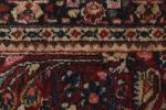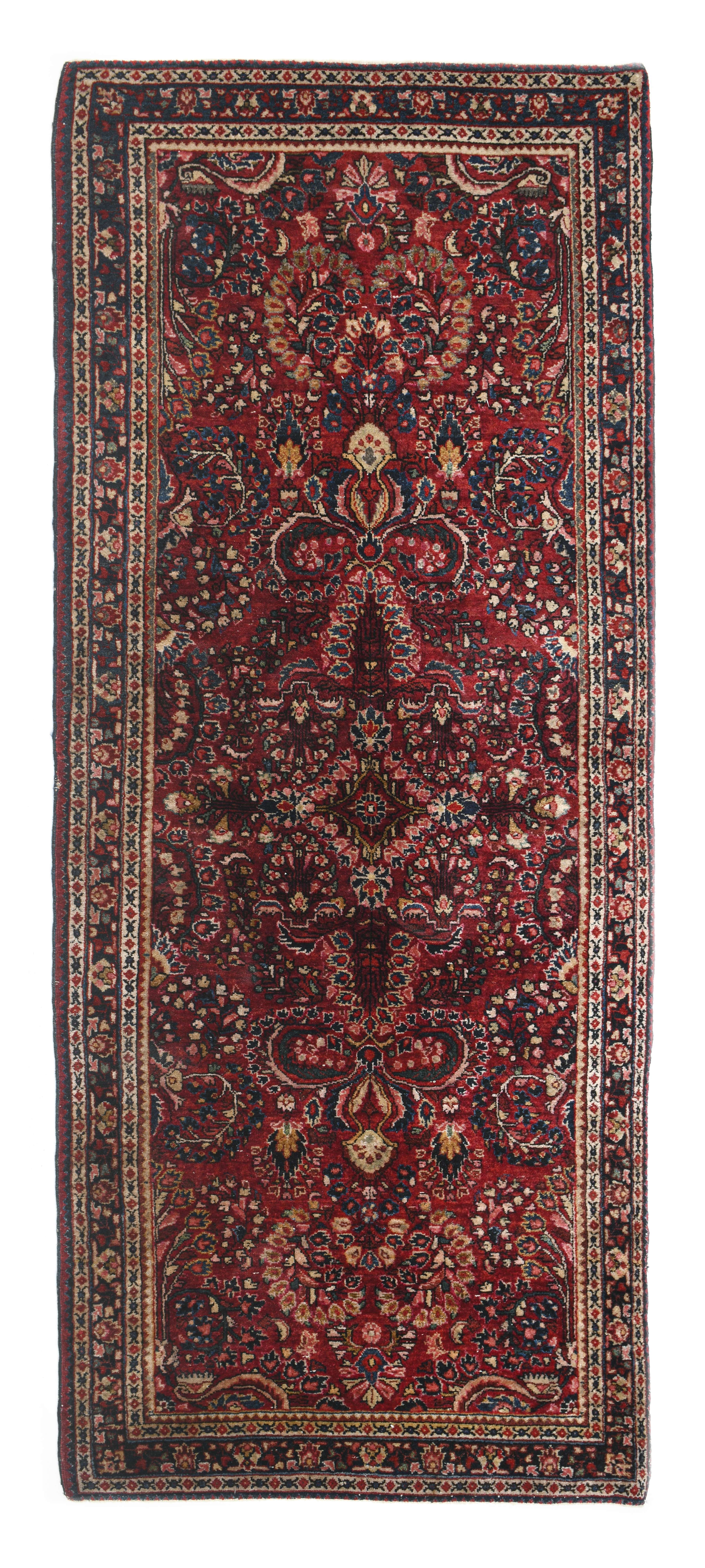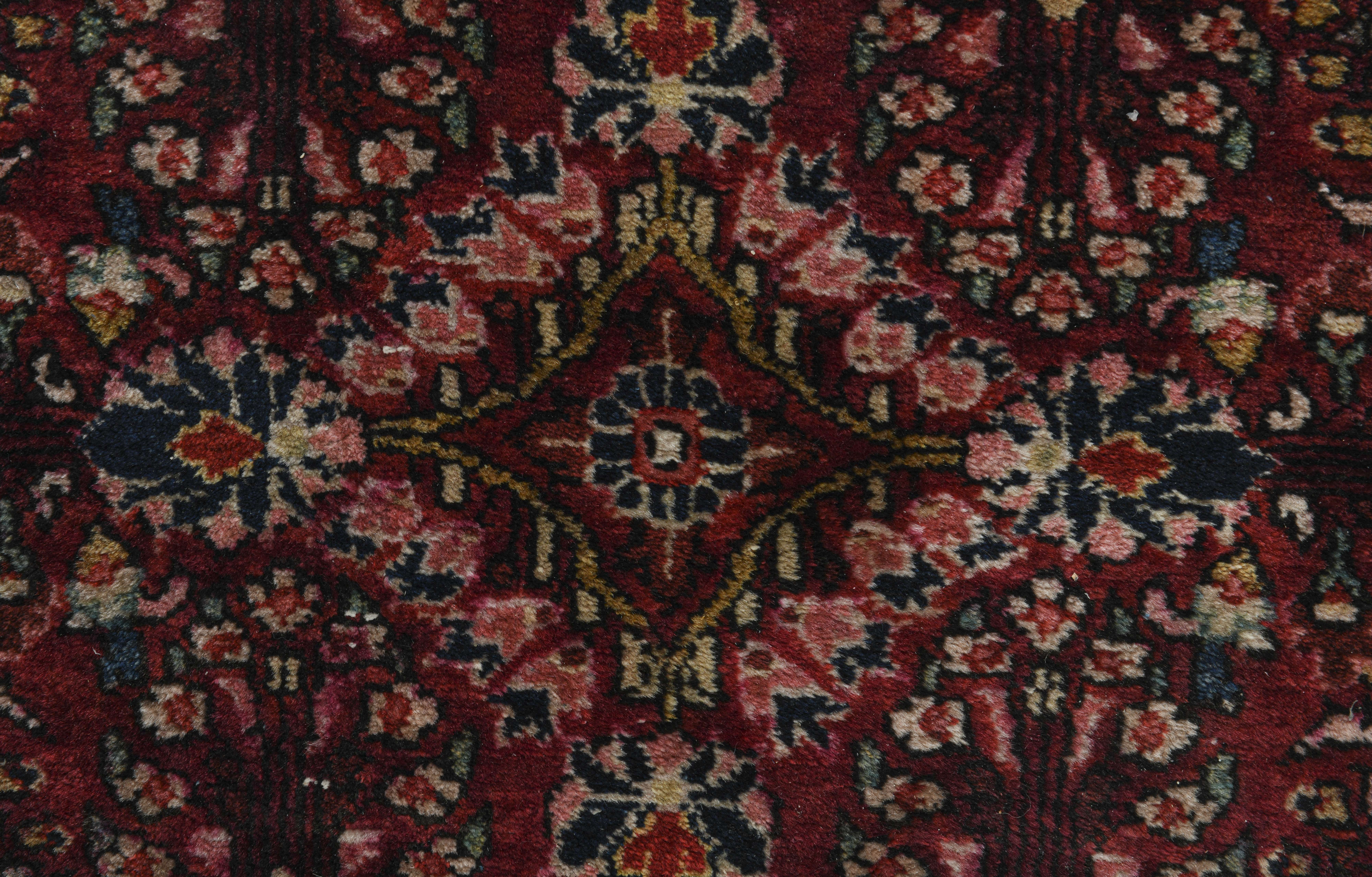 Tapis Saroug en laine à médaillon central de fleurs et décor floral sur champ principal rouge, bordure principale à frise florale sur champ noir.