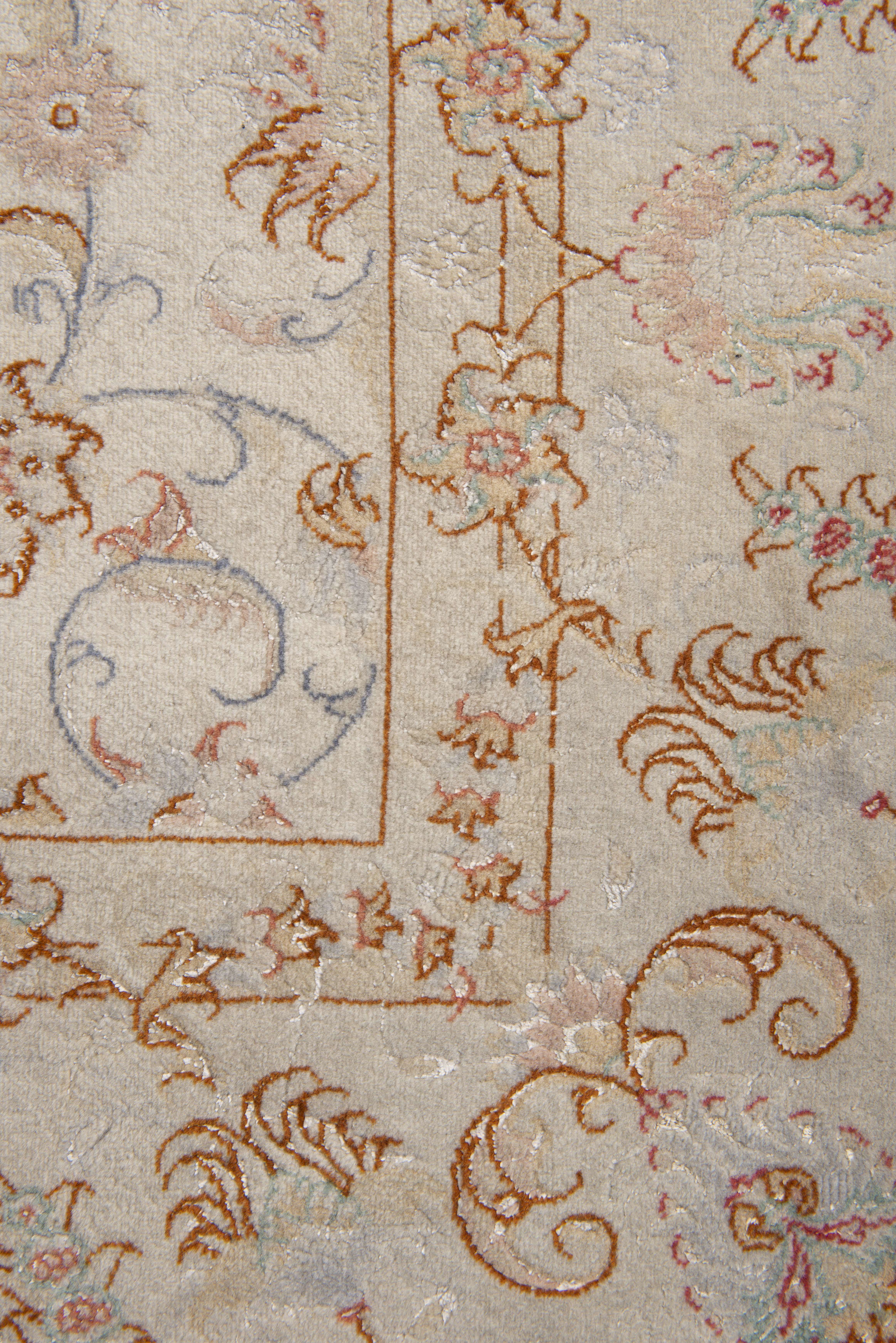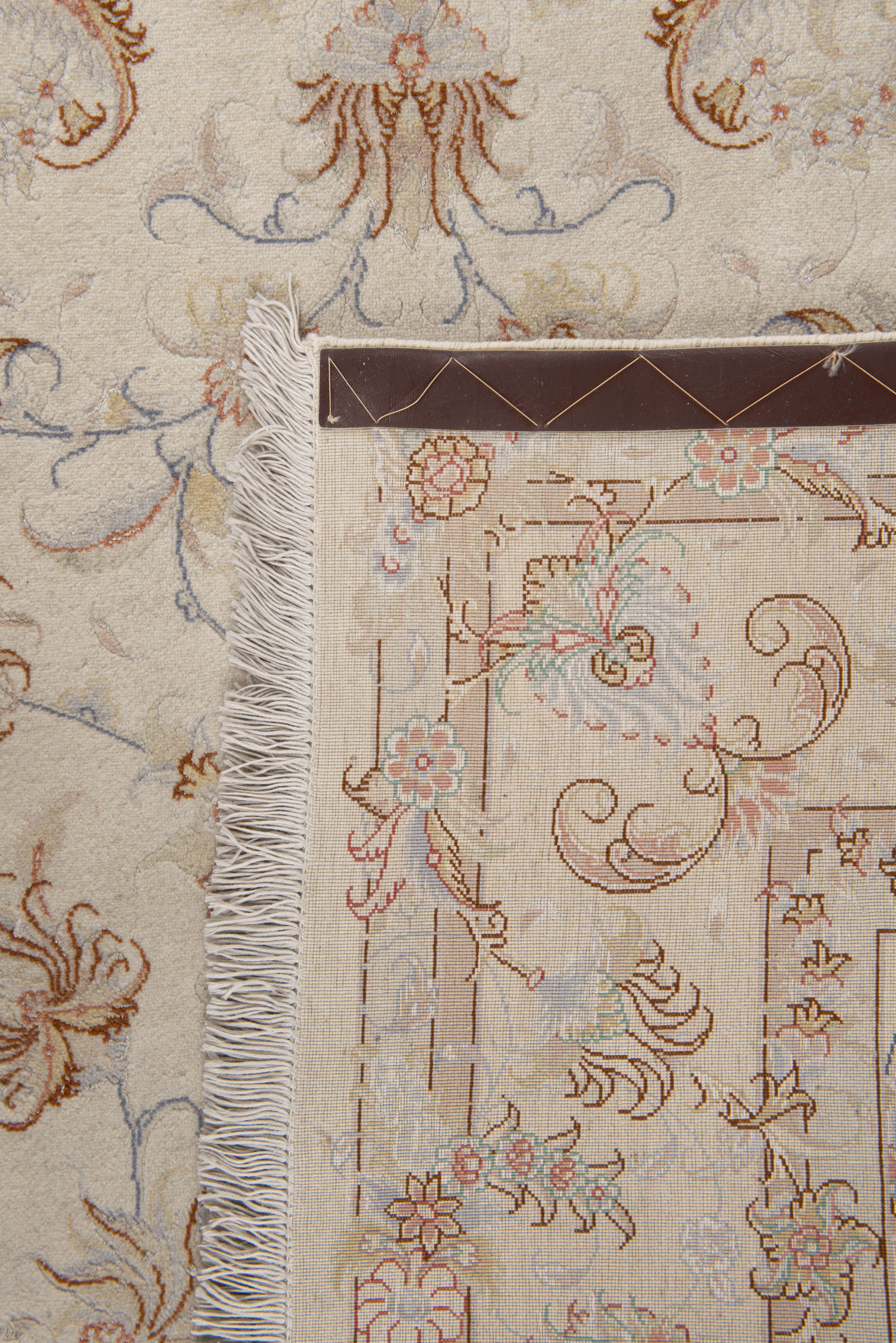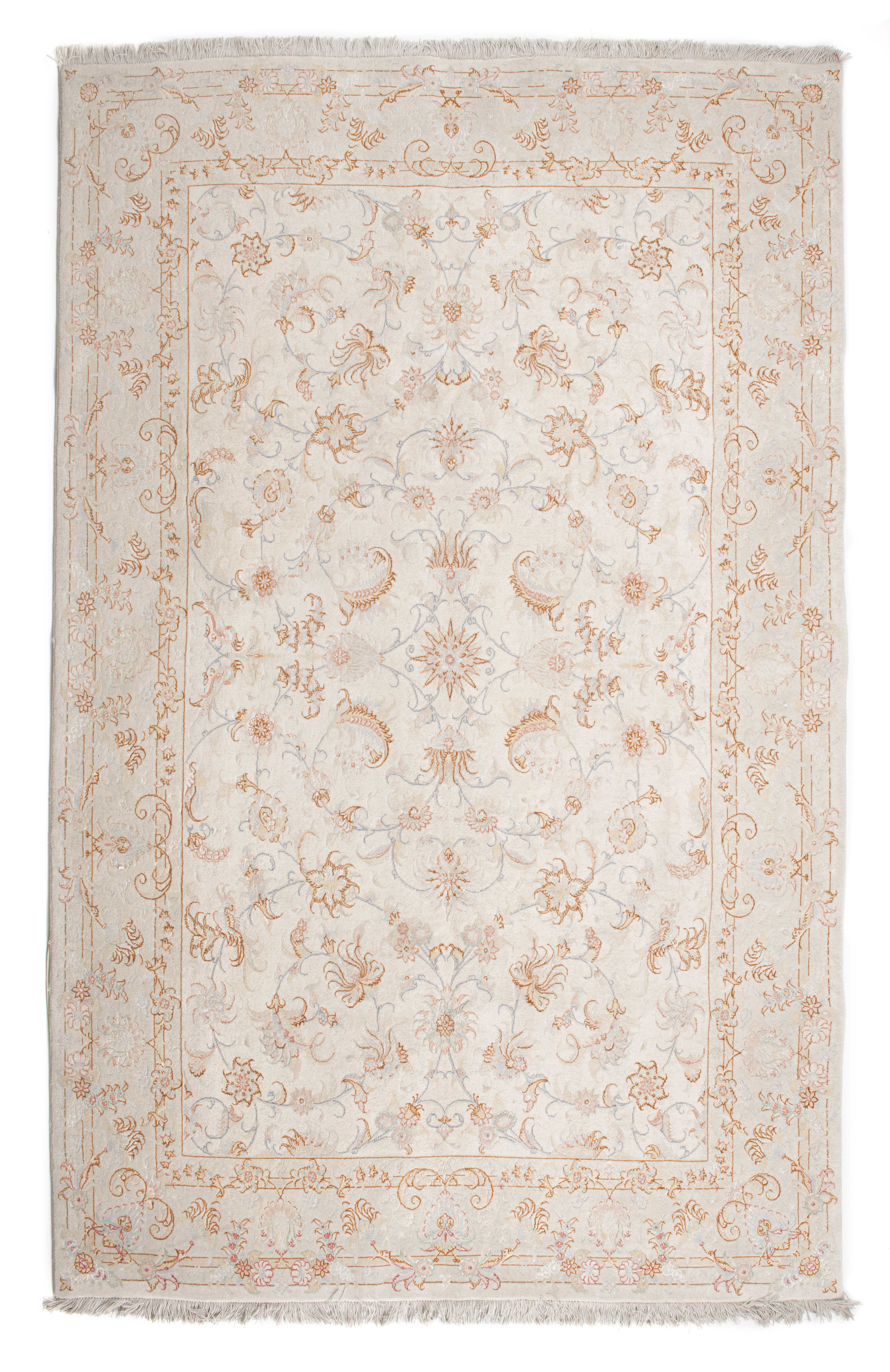 Tapis Tabriz Iran en laine et soie à champ principal crème à étoile centrale et décor de rinceaux de lotus et feuilles, bordure principale à décor de fleurs et feuilles sur champ crème.