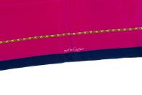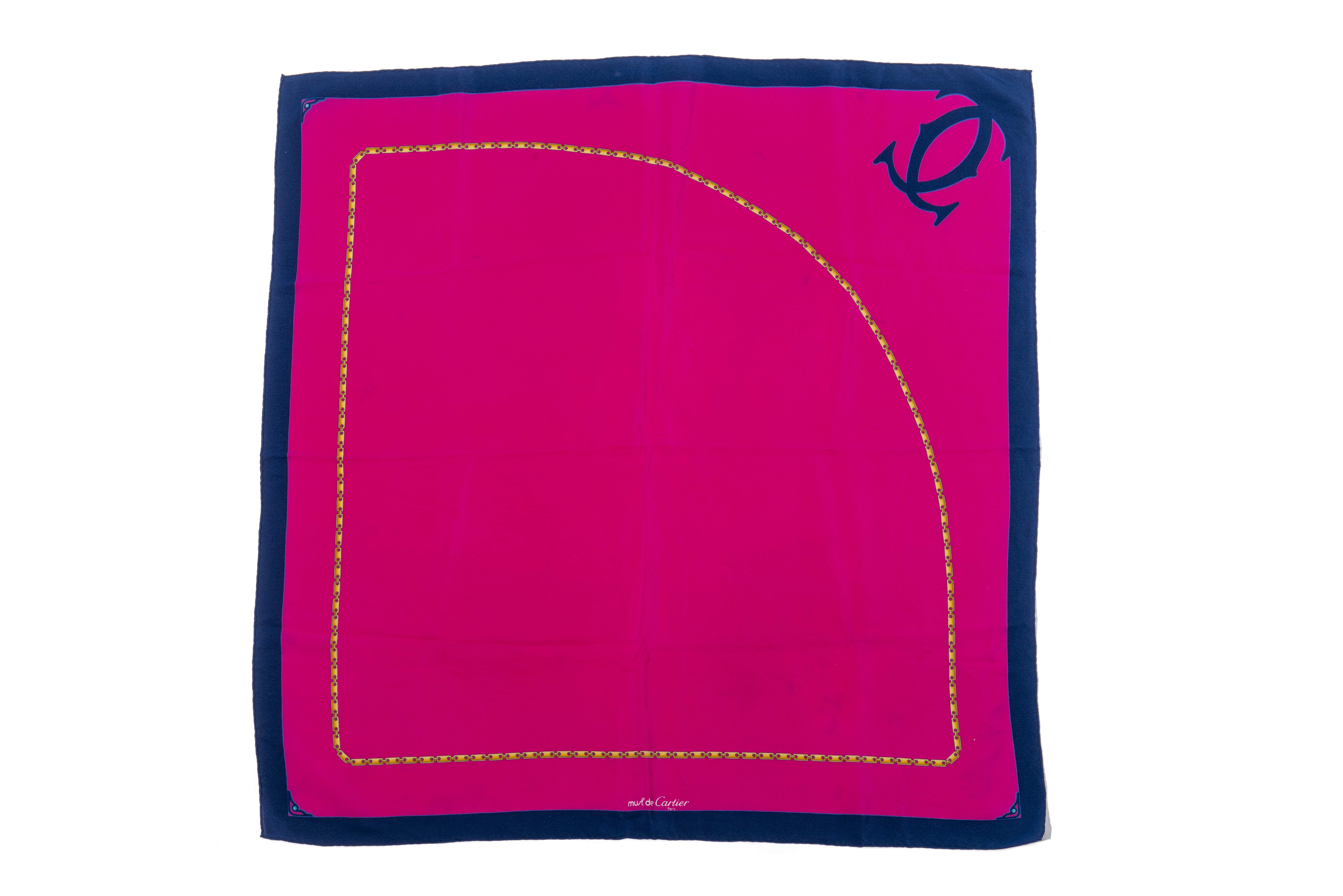 Must de Cartier, carré en twill de soie roulotté main imprimé du sigle Cartier "Sautoir à maillons plats" sur fond fuchsia.