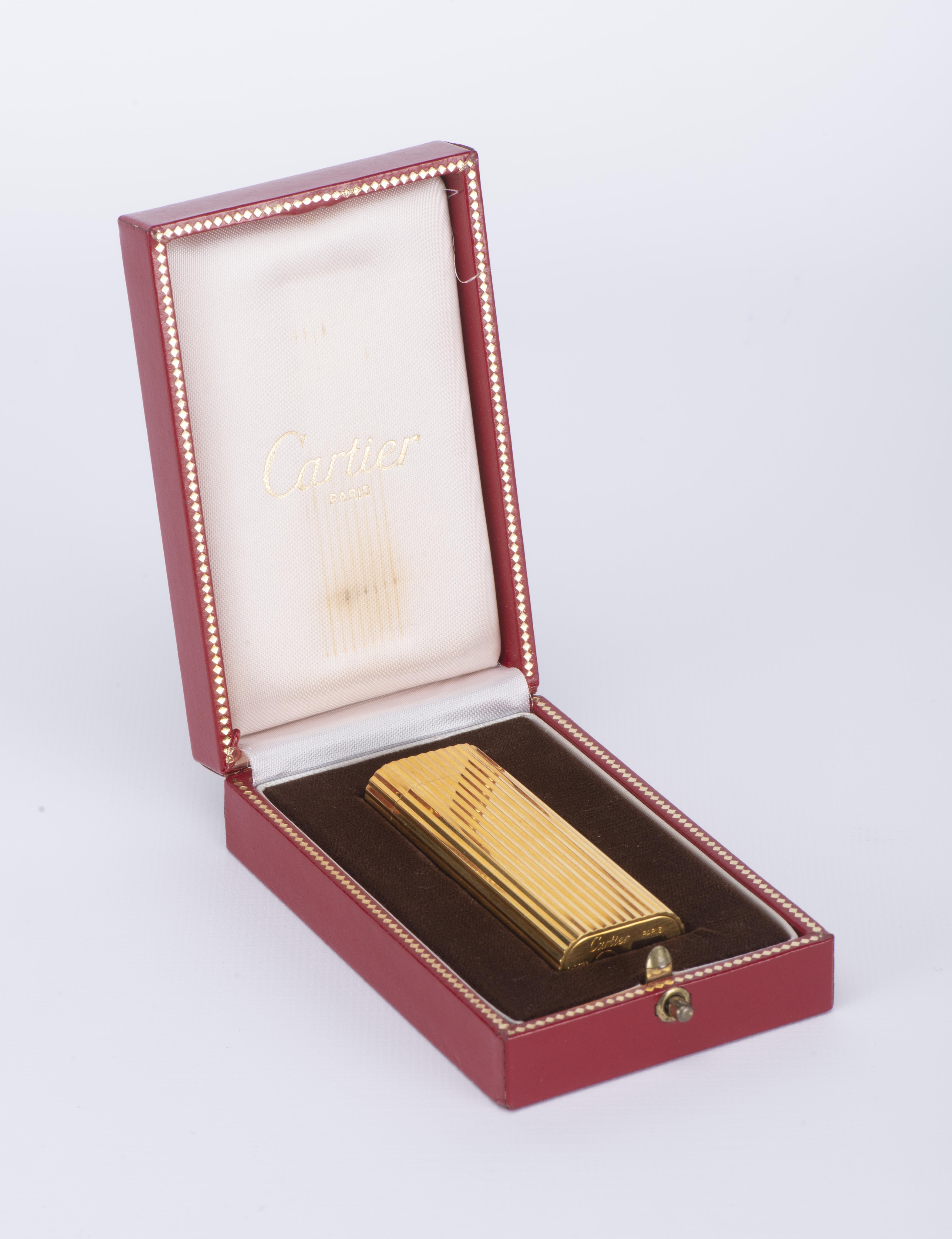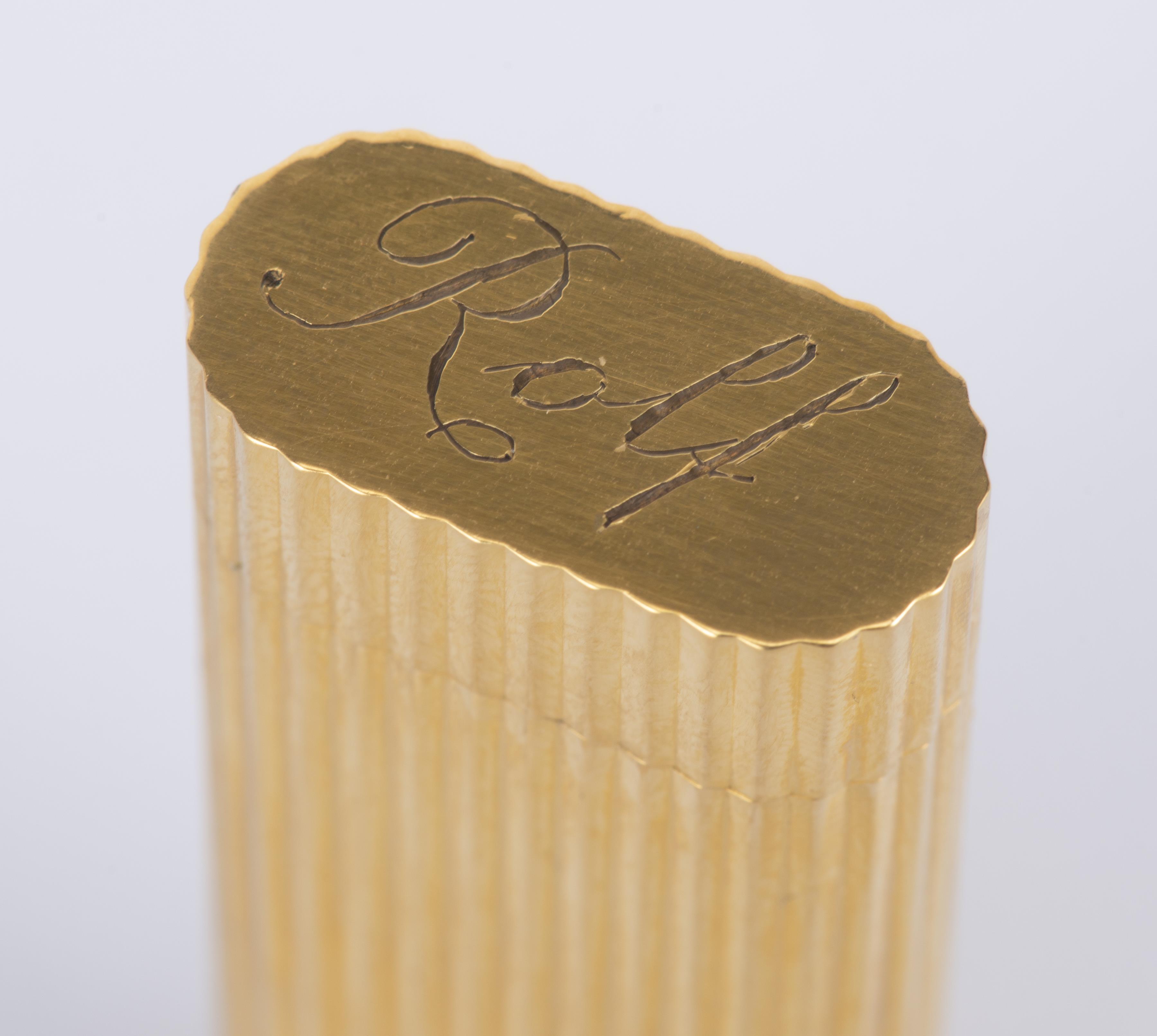 Briquet Cartier en métal doré num 184251, inscrit sur le couvercle Rolf.