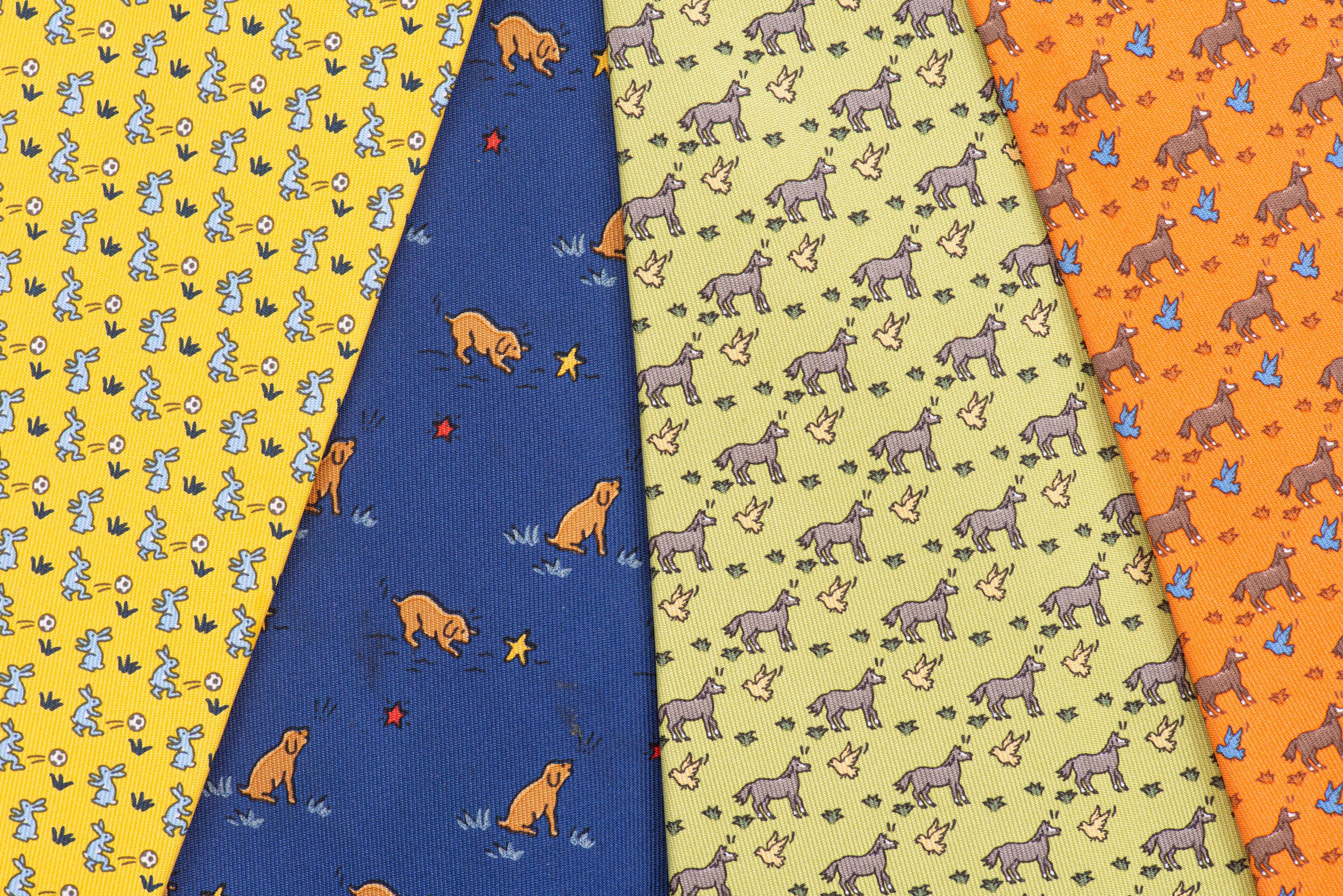 Hermès, lot de quatre cravates à motifs dans des tons orange, vert, jaune et bleu.