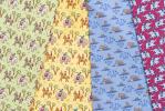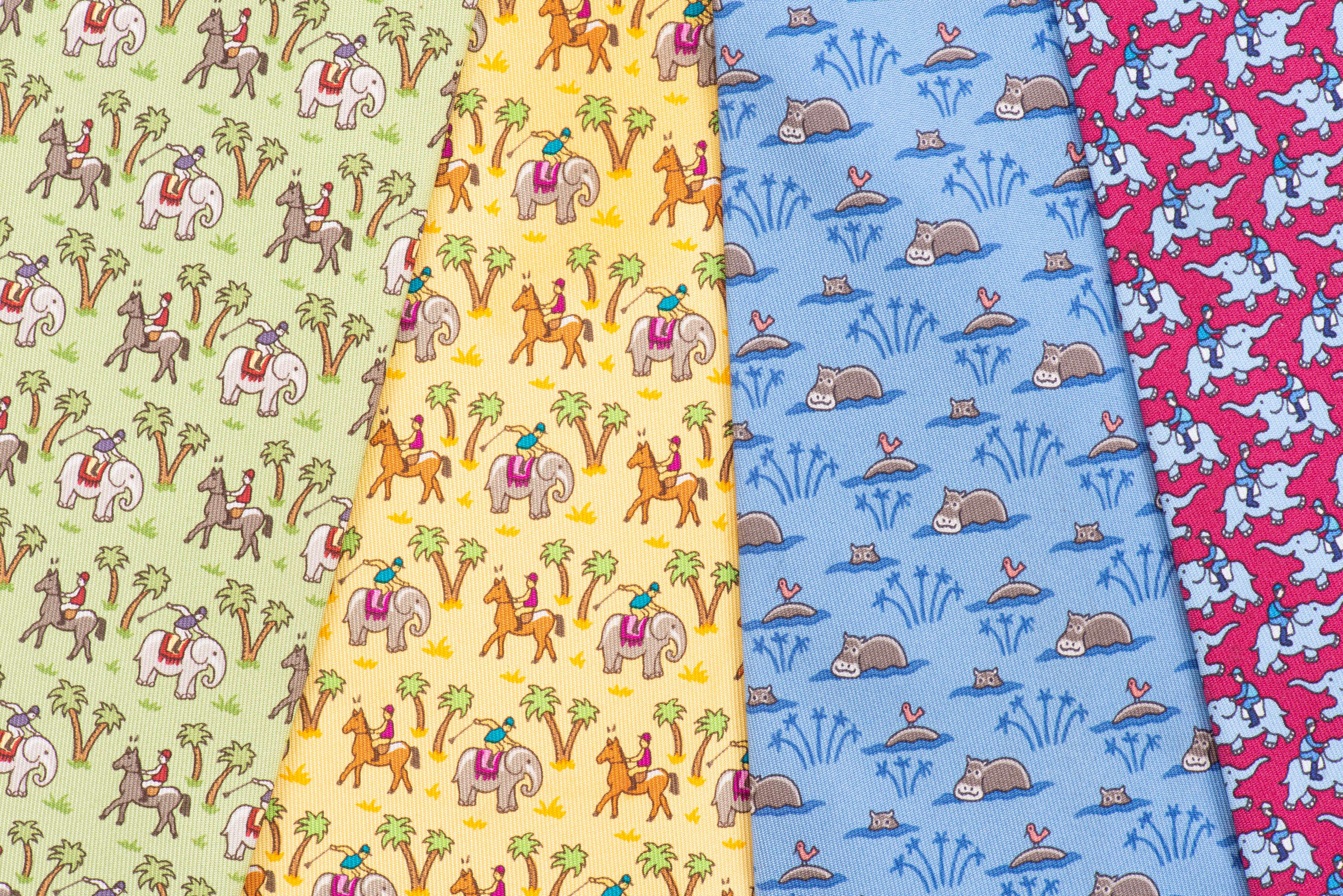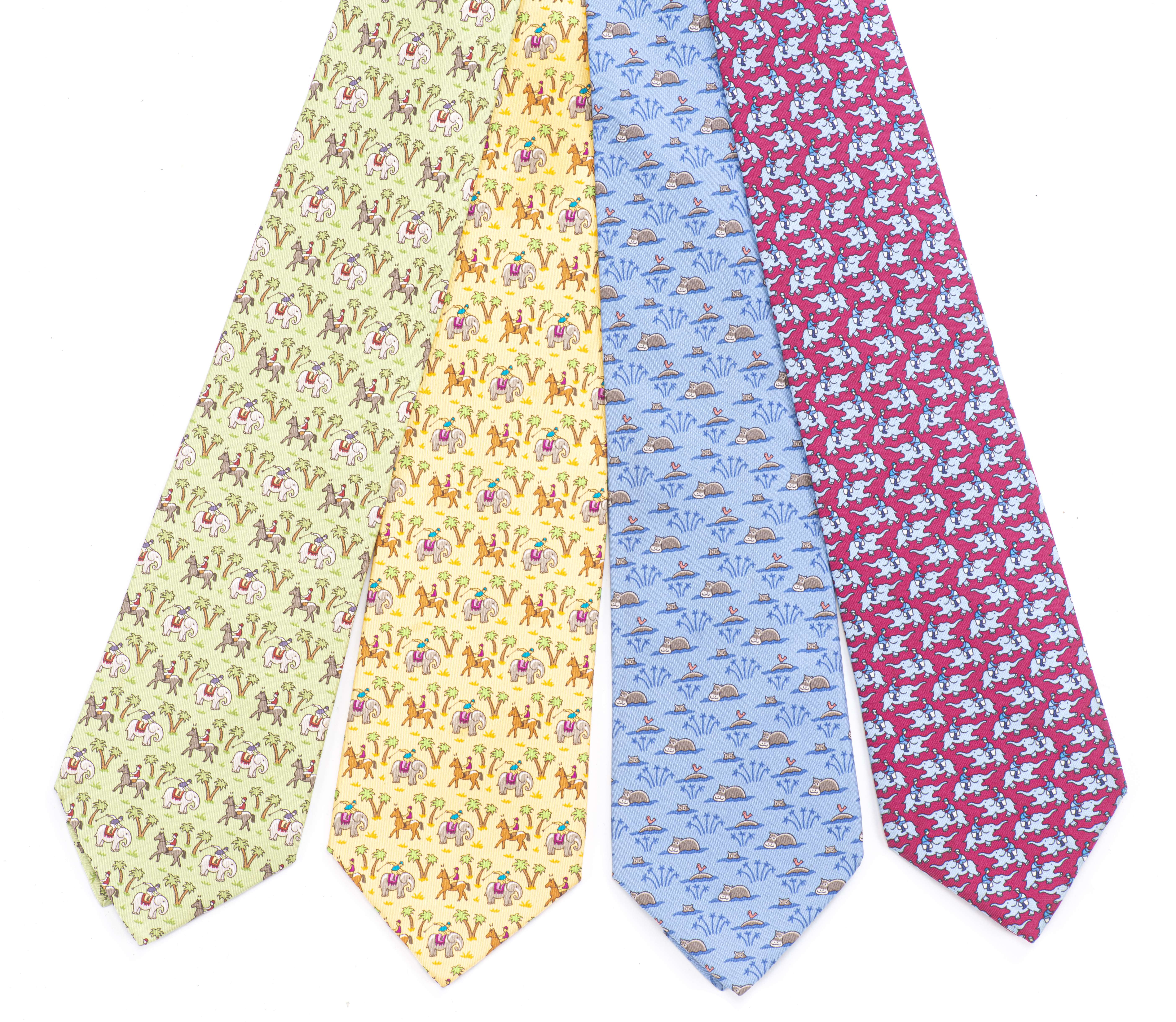 Hermès, lot de quatre cravates à motifs dans des tons jaune, Parme, vert clair et bordeau.
