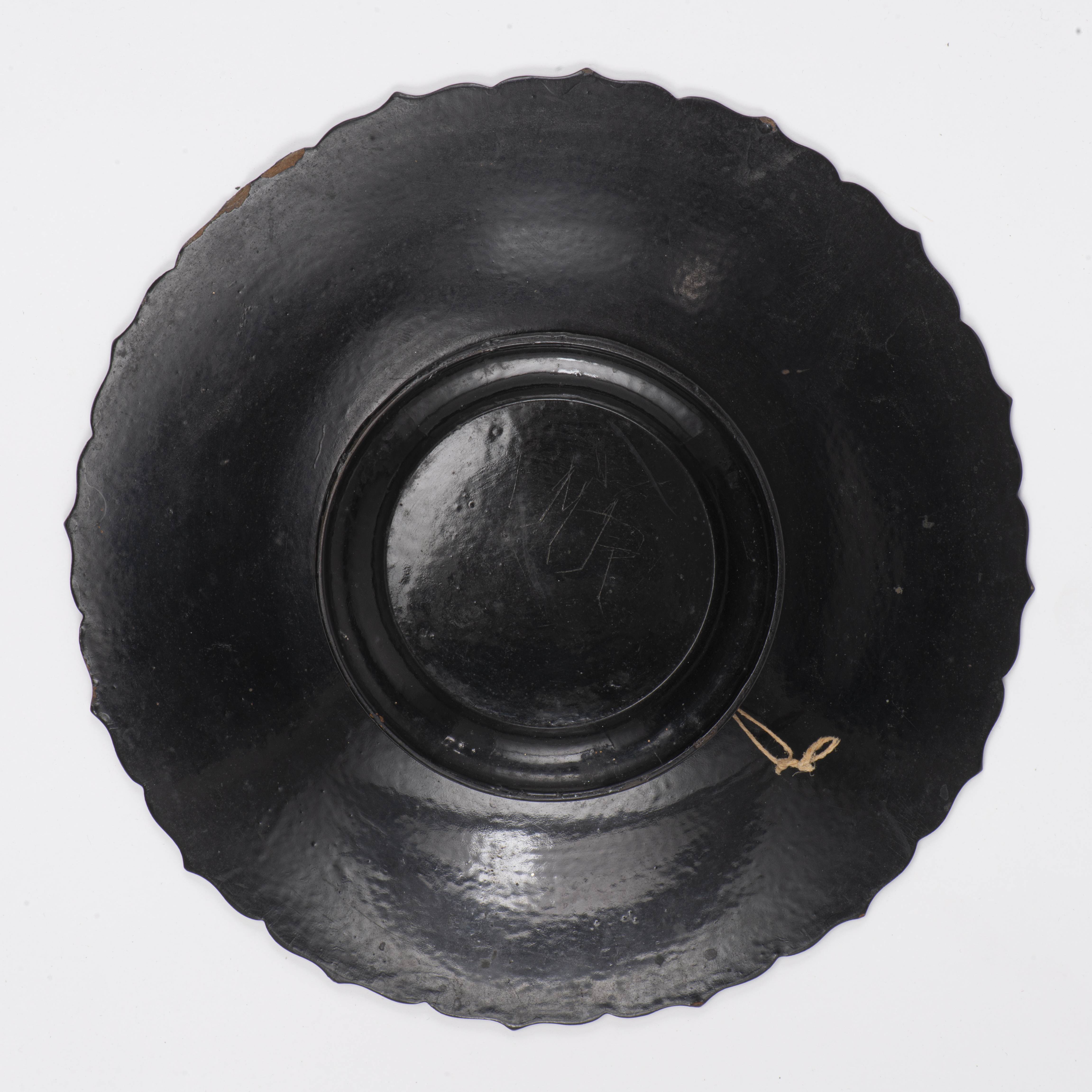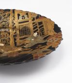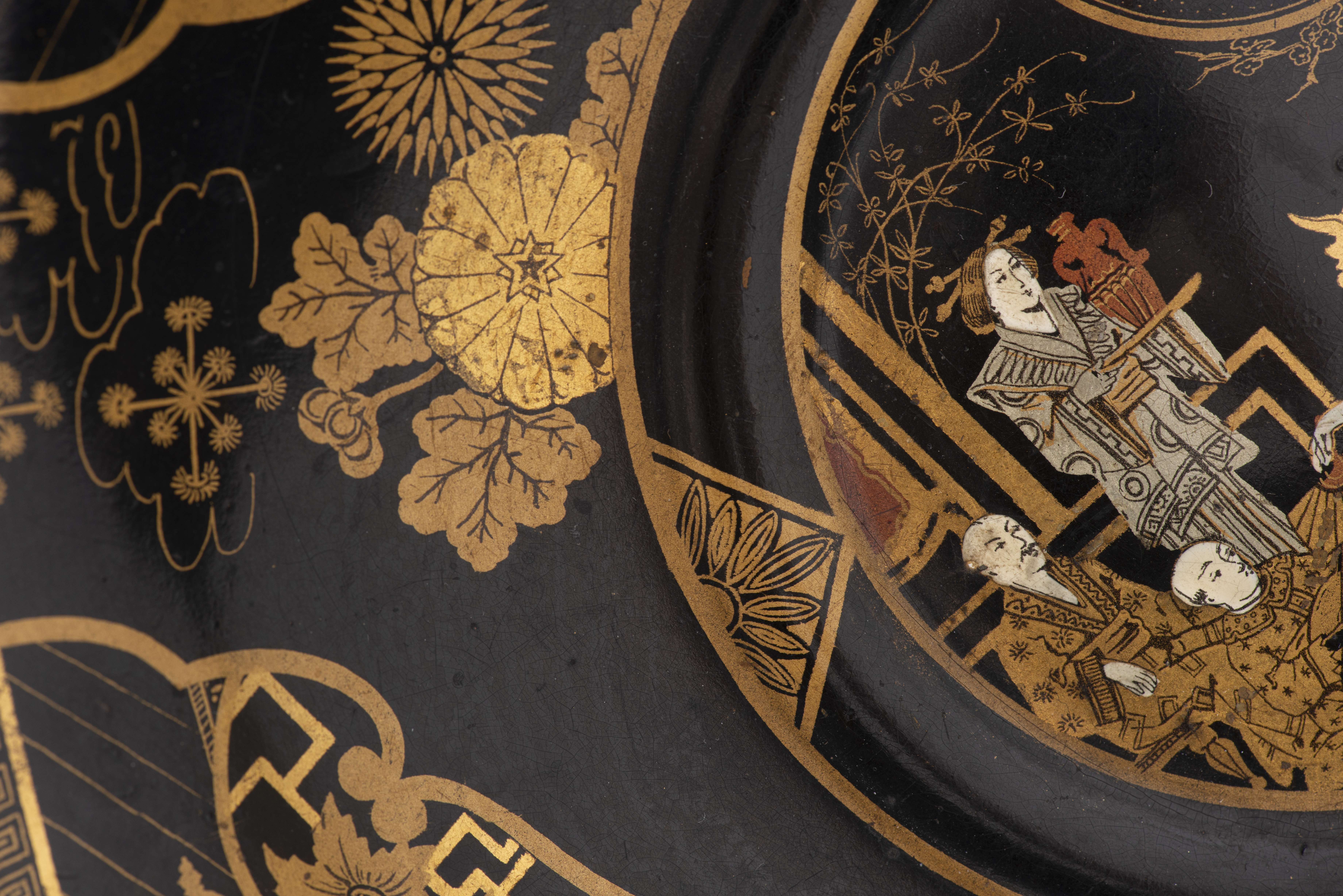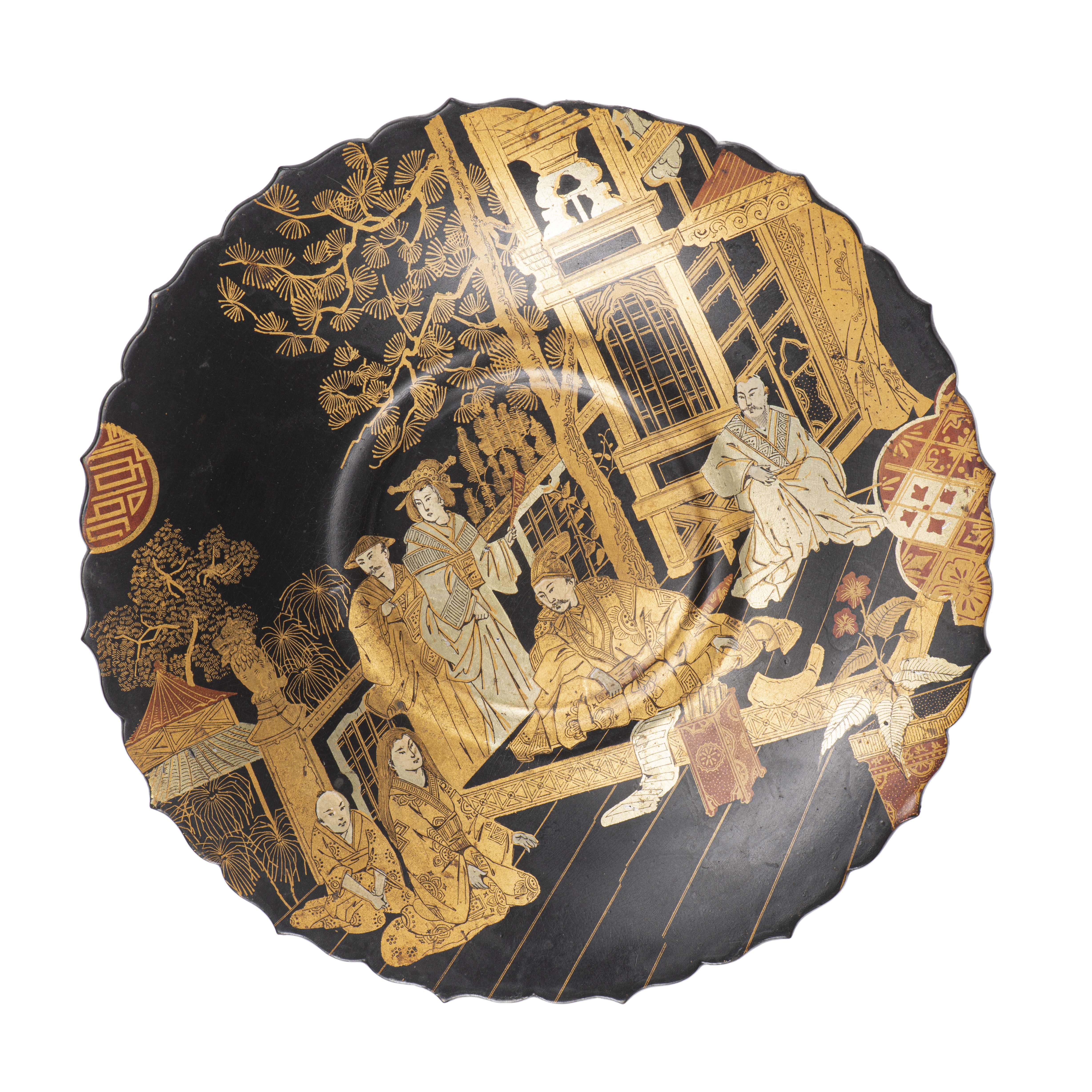 Deux plats sur pied, en carton bouilli, laqués à décor orientaliste de scènes d'intérieur, de perron et de fleurs et papillons en médaillons. Lèvres mouvementées.