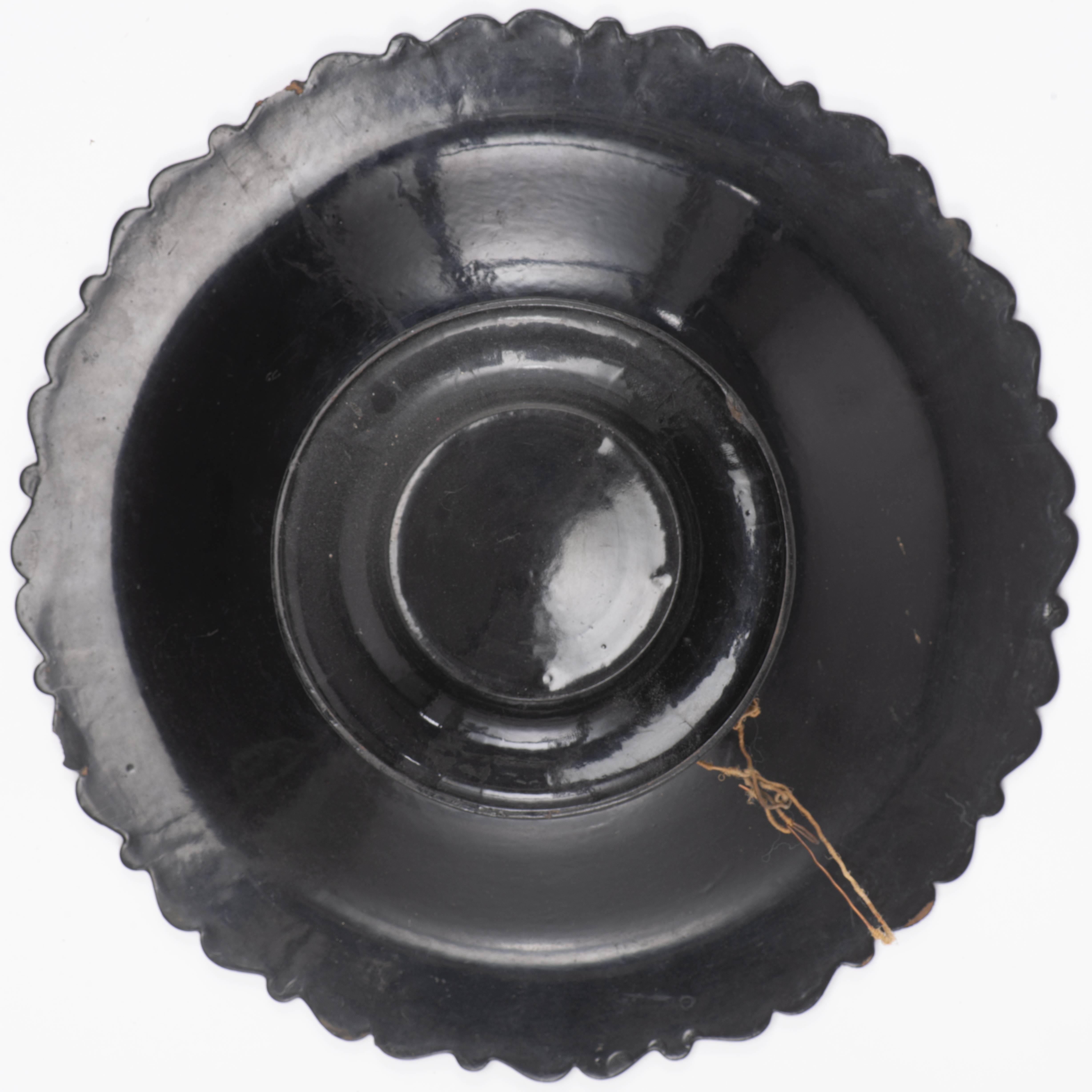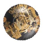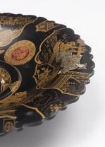 Deux plats sur pied, en carton bouilli laqués à décor orientaliste
