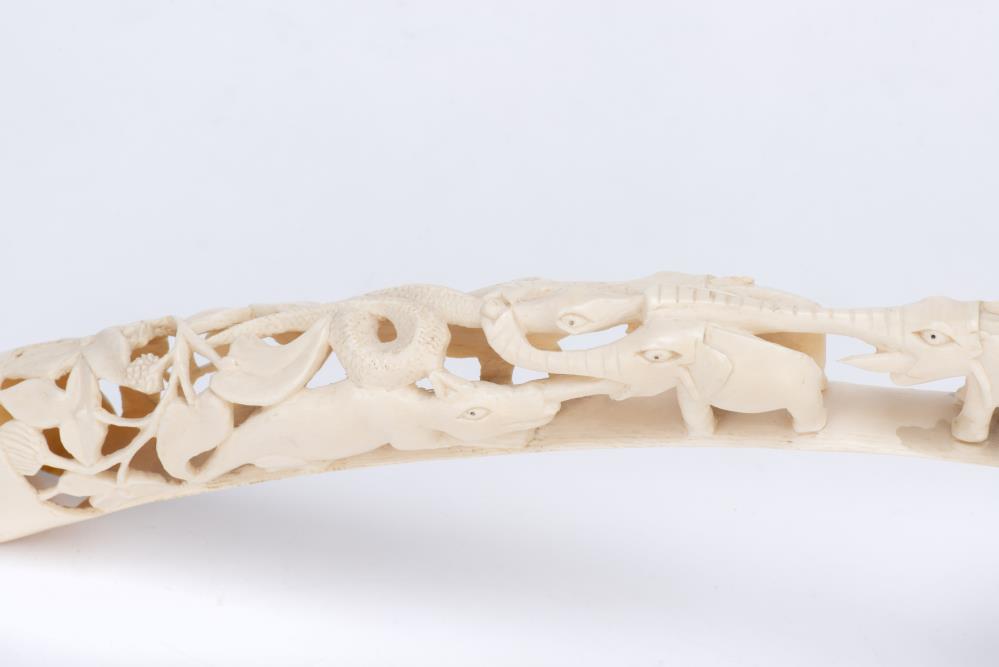 Défense d'éléphant sculptée d'éléphants, ivoire.